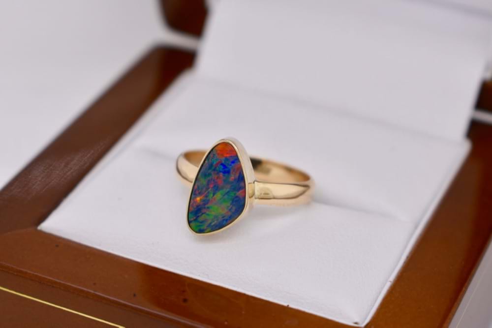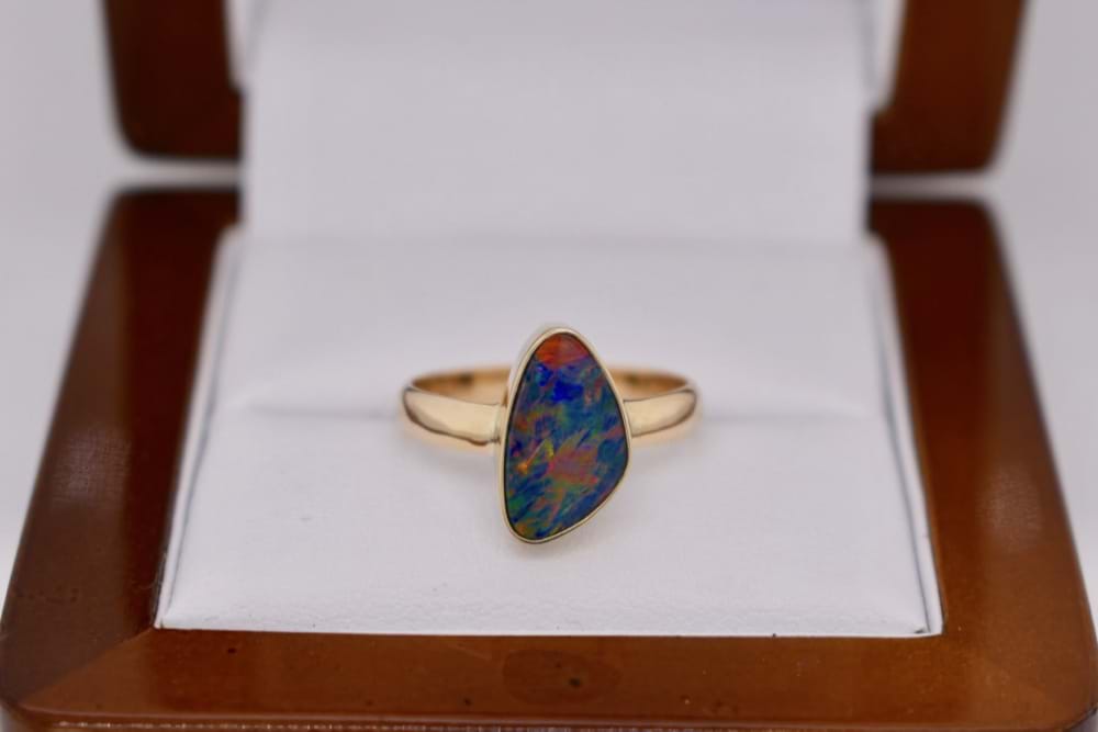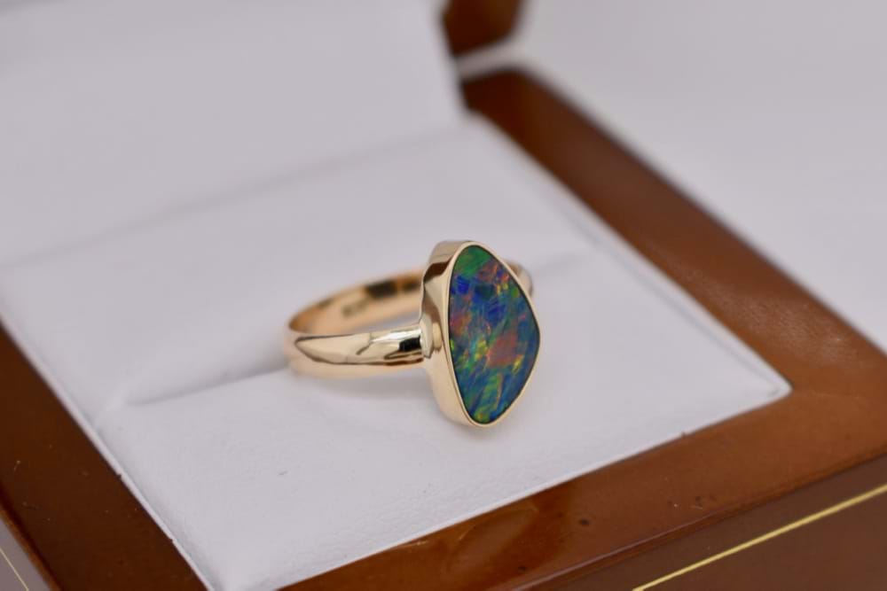 Stunning and unusual freeform boulder opal doublet with flashes of red, orange, green & yellow measuring approximately 12x8mm in a handmade 9ct yellow gold bezel setting ring. Finger size L.5