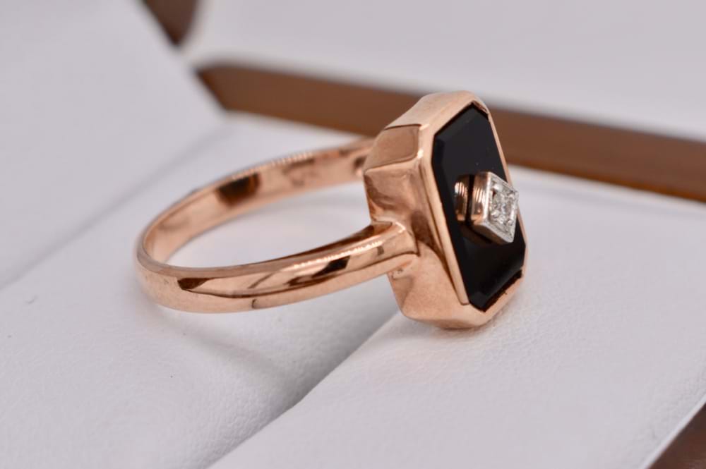 SOLD 9ct Rose Gold Emerald Cut Onyx & Diamond Ring (O)