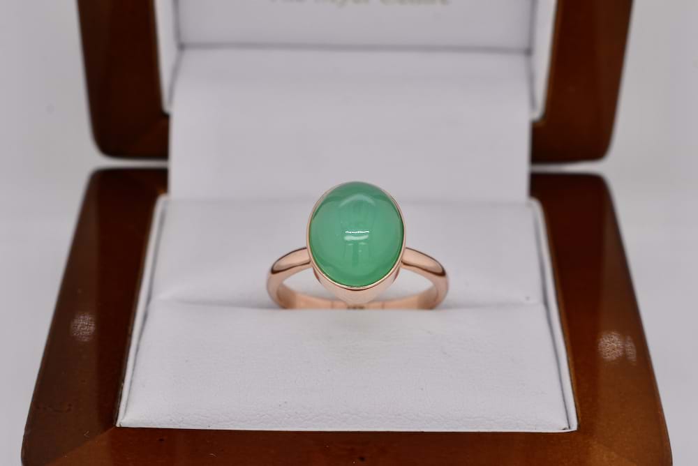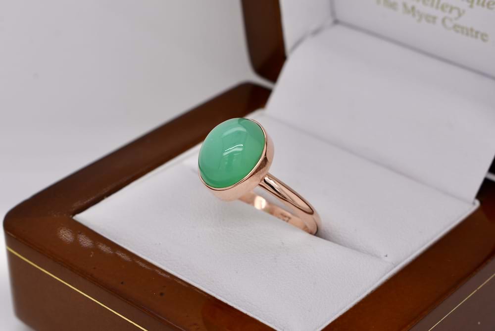 A handmade 9ct rose gold ring featuring a bezel set oval cabochon chrysoprase measuring approx 12x10mm. Finger size is M. Fun fact: Chrysoprase is primarily found in Australia and gets its green colour from trace amounts of nickel