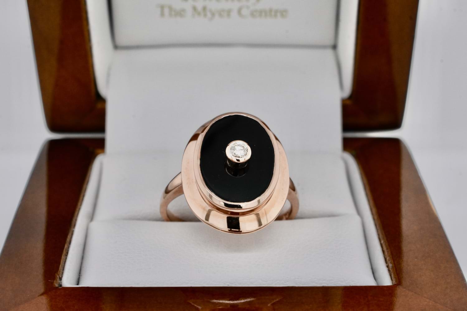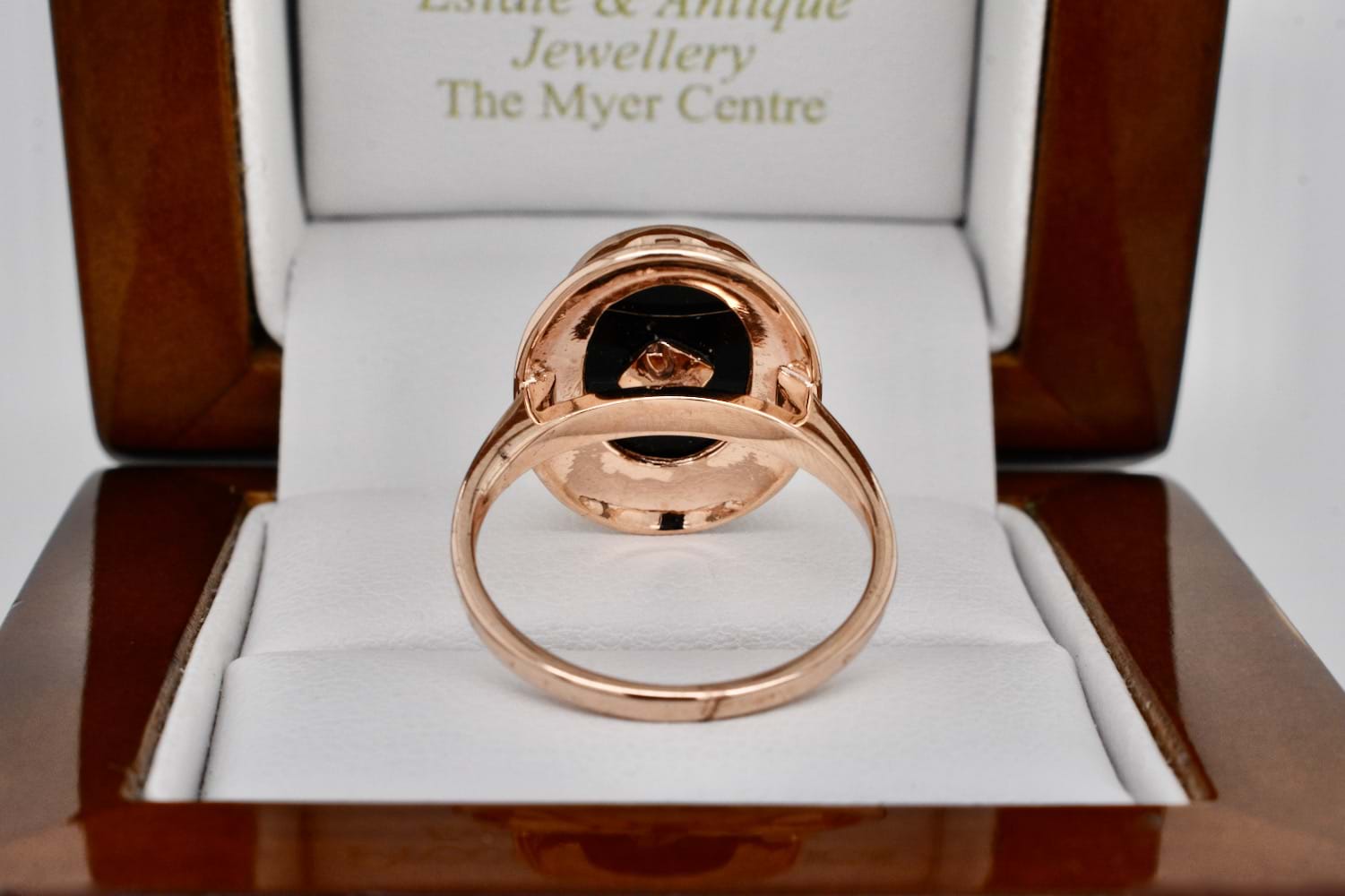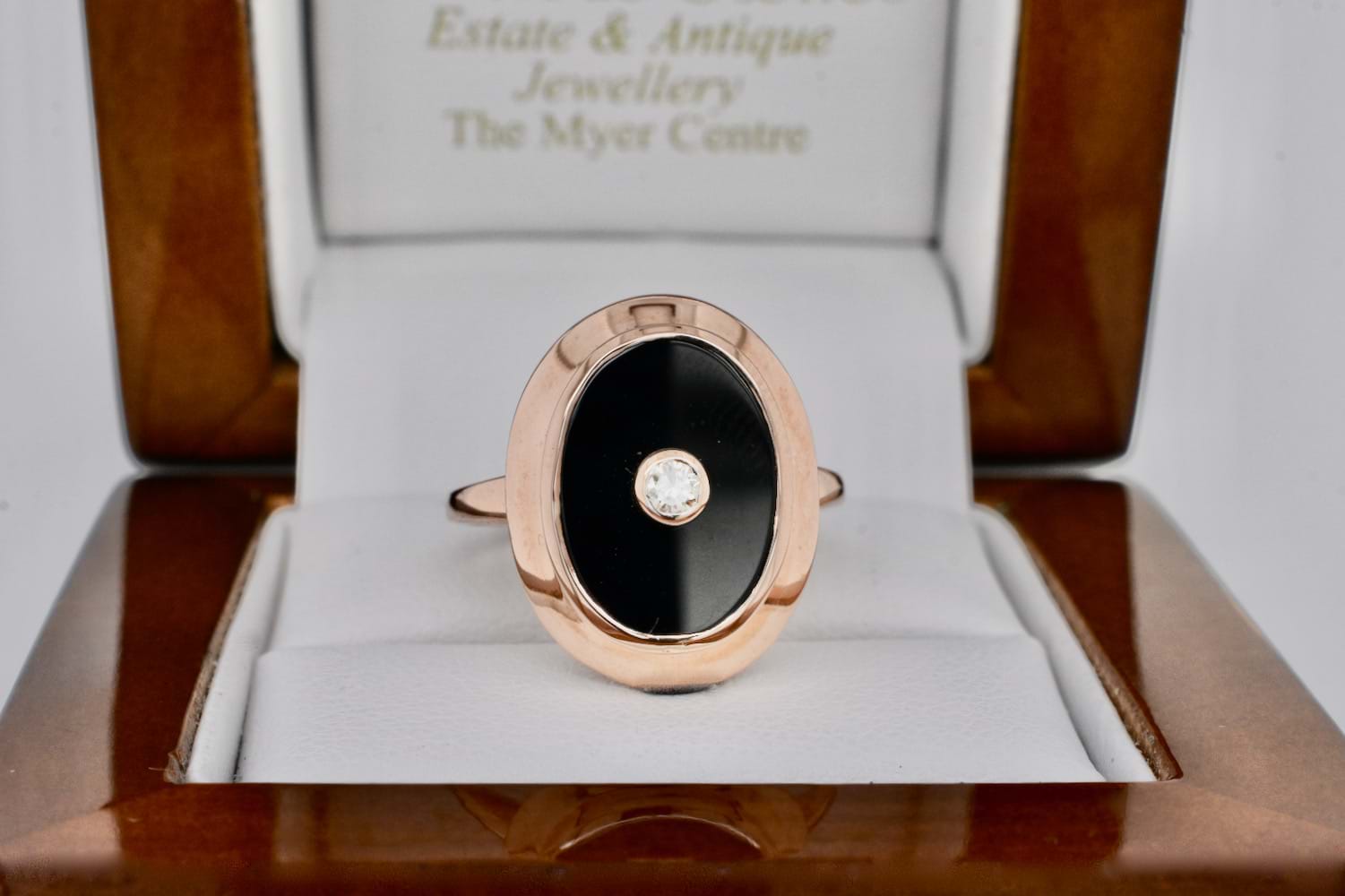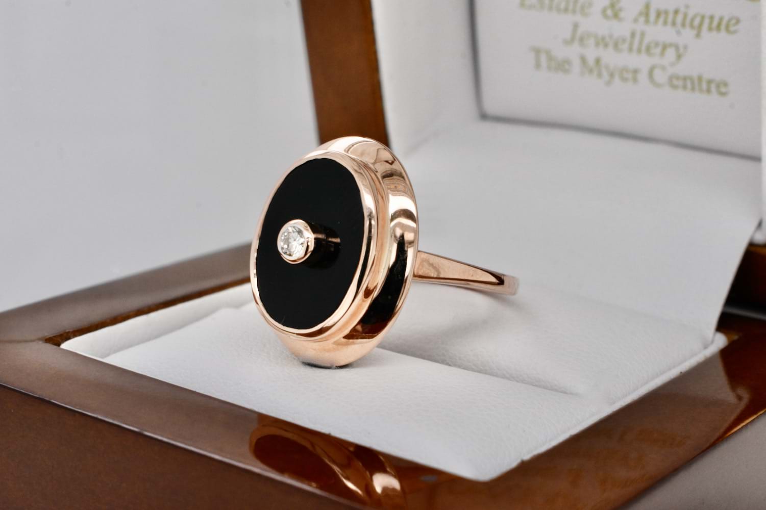 A striking 9ct rose gold ring with an impressive oval piece of onyx measuring approx. 18.5 x 14.5mm, set with a sparkly, white RBC diamond in the centre bezel set in white gold with a plain band. Finger size O