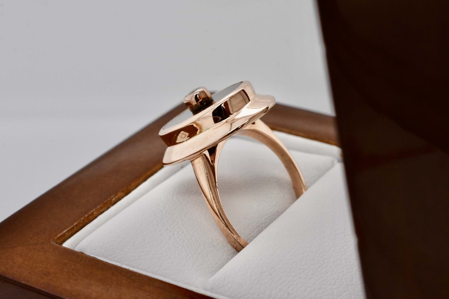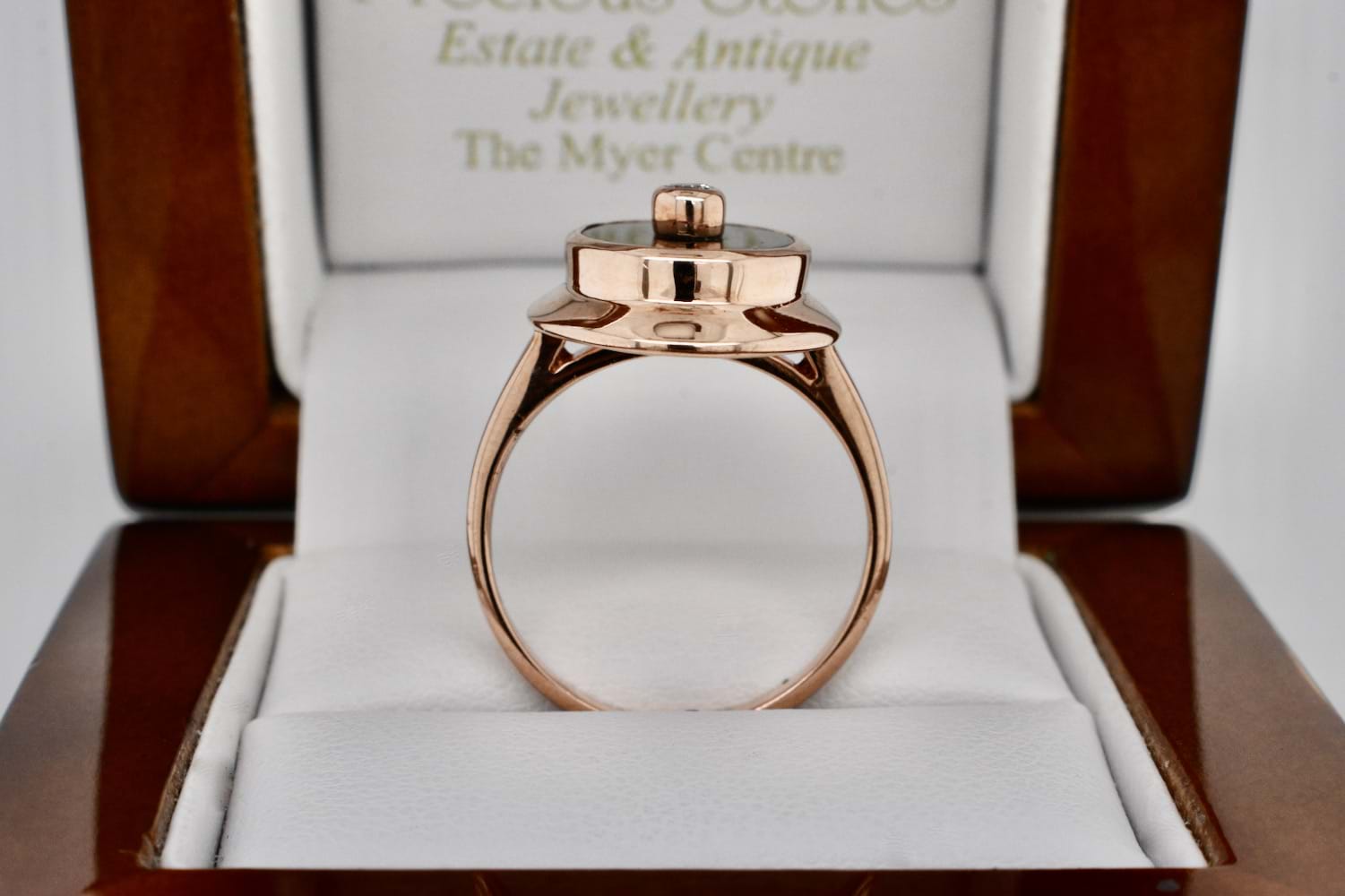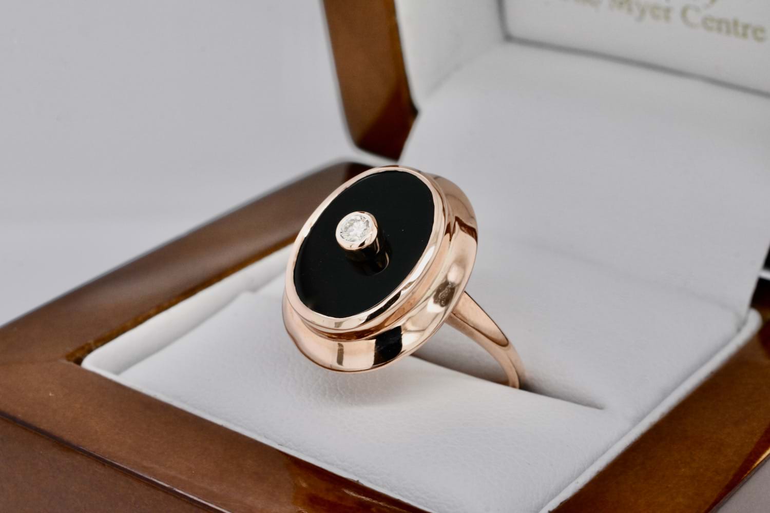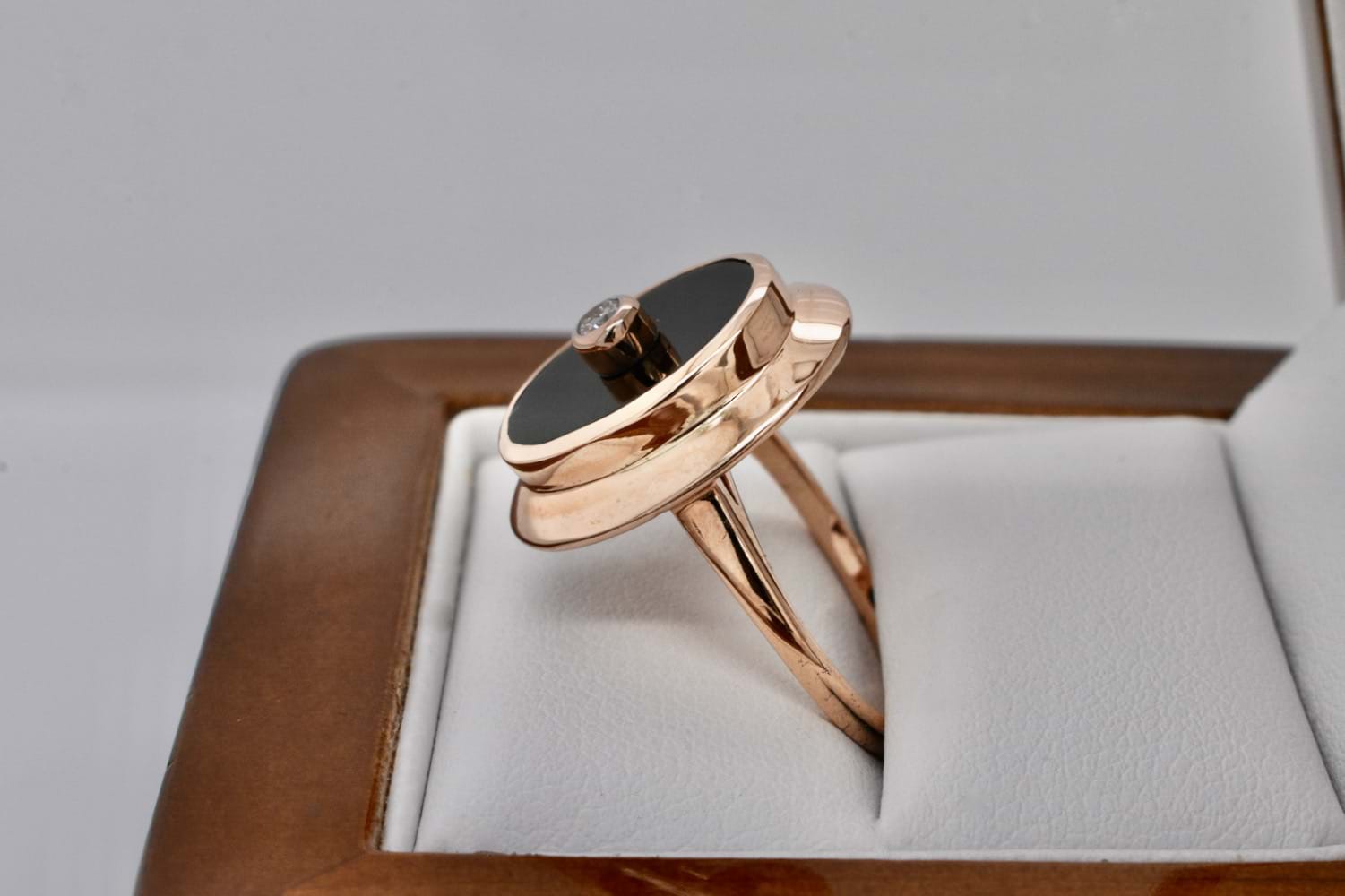 A striking 9ct rose gold ring with an impressive oval piece of onyx measuring approx. 18.5 x 14.5mm, set with a sparkly, white RBC diamond in the centre bezel set in white gold with a plain band. Finger size O