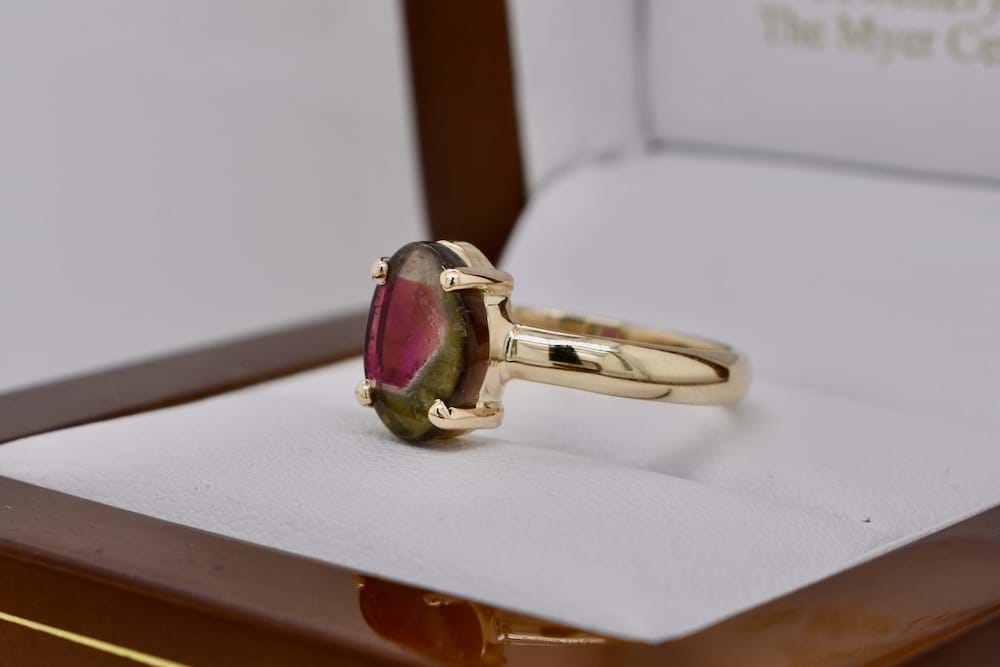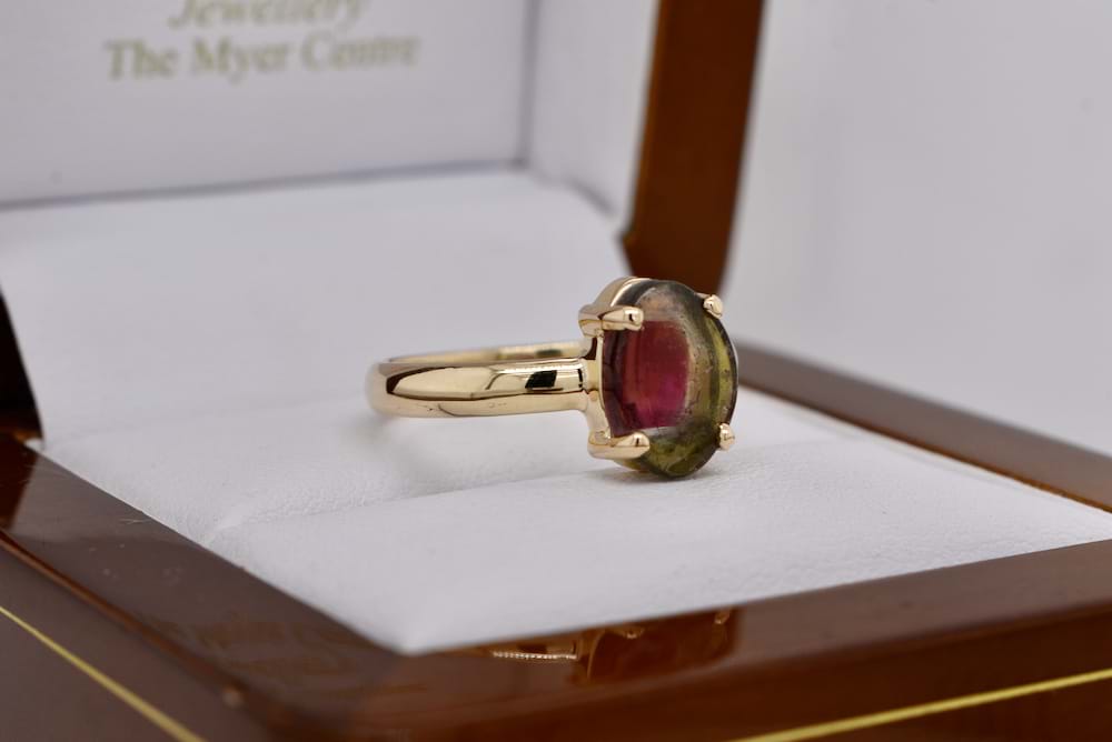 9ct yellow gold handmade claw set ring featuring a slice of 10x7mm watermelon tourmaline. Finger size P (This ring can be resized within reason).