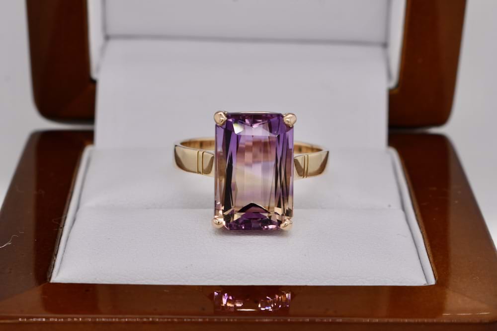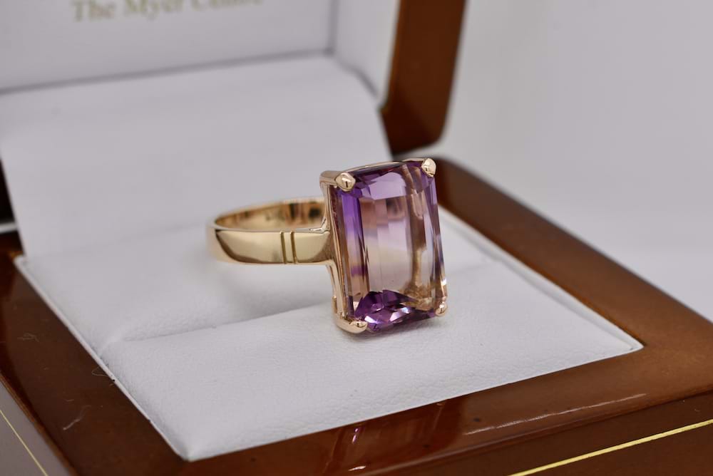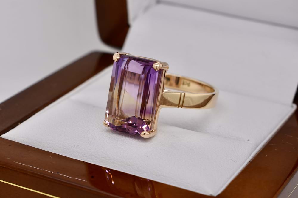 Handmade in 9ct yellow gold is this simple and stunning four claw ring featuring an emerald cut ametrine measuring 15x10mm. Finger size R