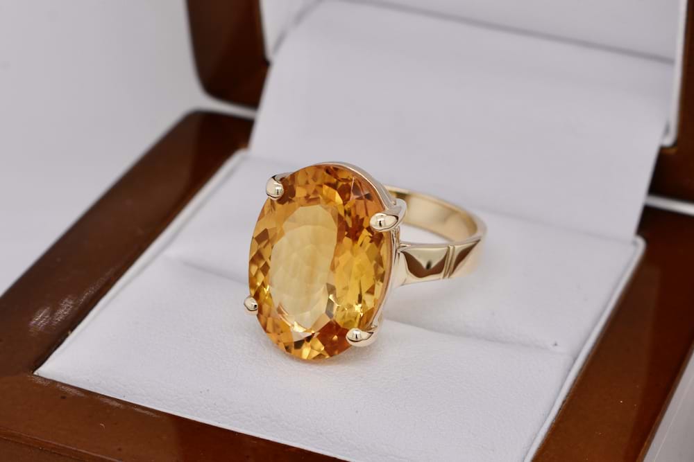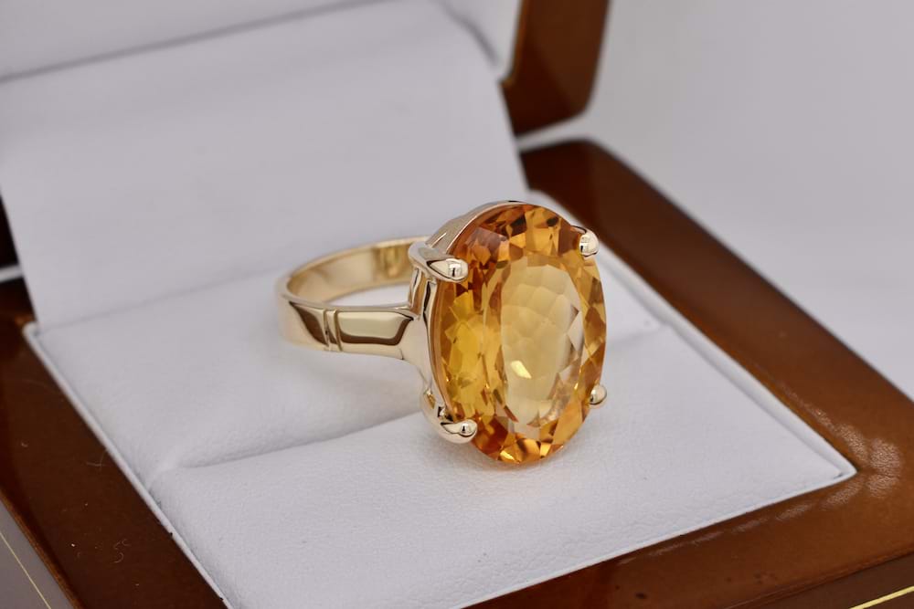 Handmade in 9ct yellow gold is this stunning, statement citrine cocktail ring. The faceted stone measures 18x13mm oval and is four claw set with a plain band. Finger size is M.5 but easily resized (within reason)