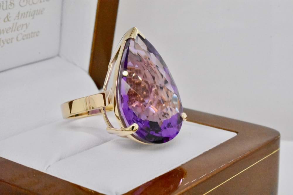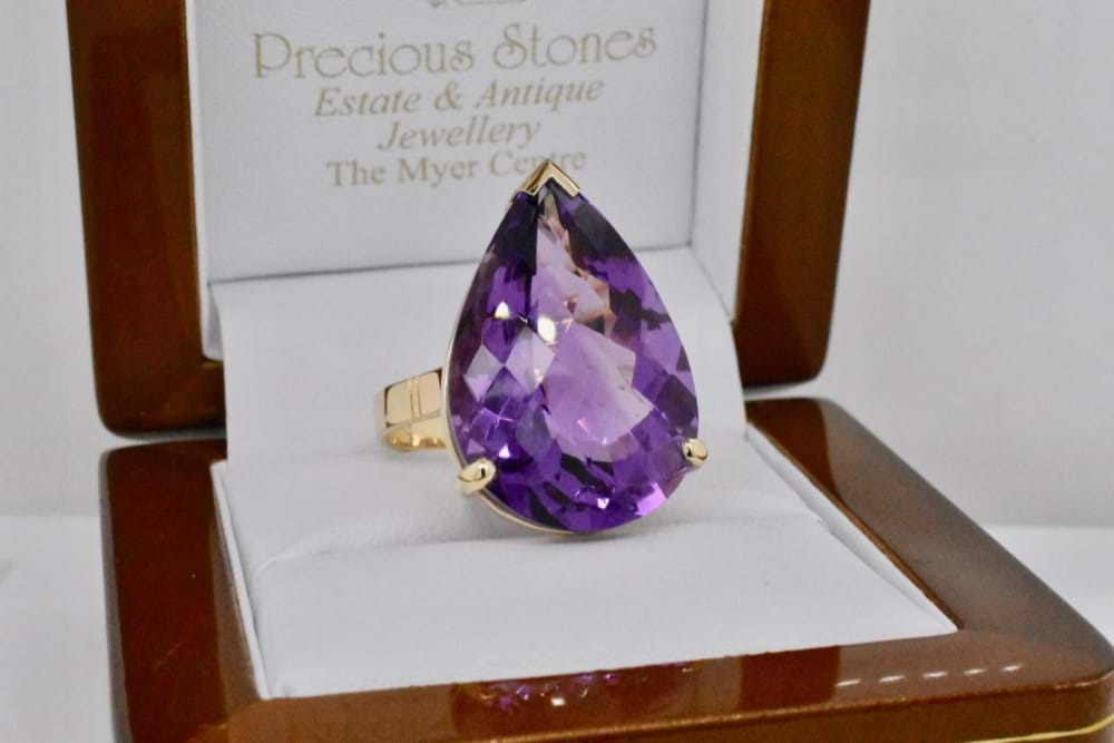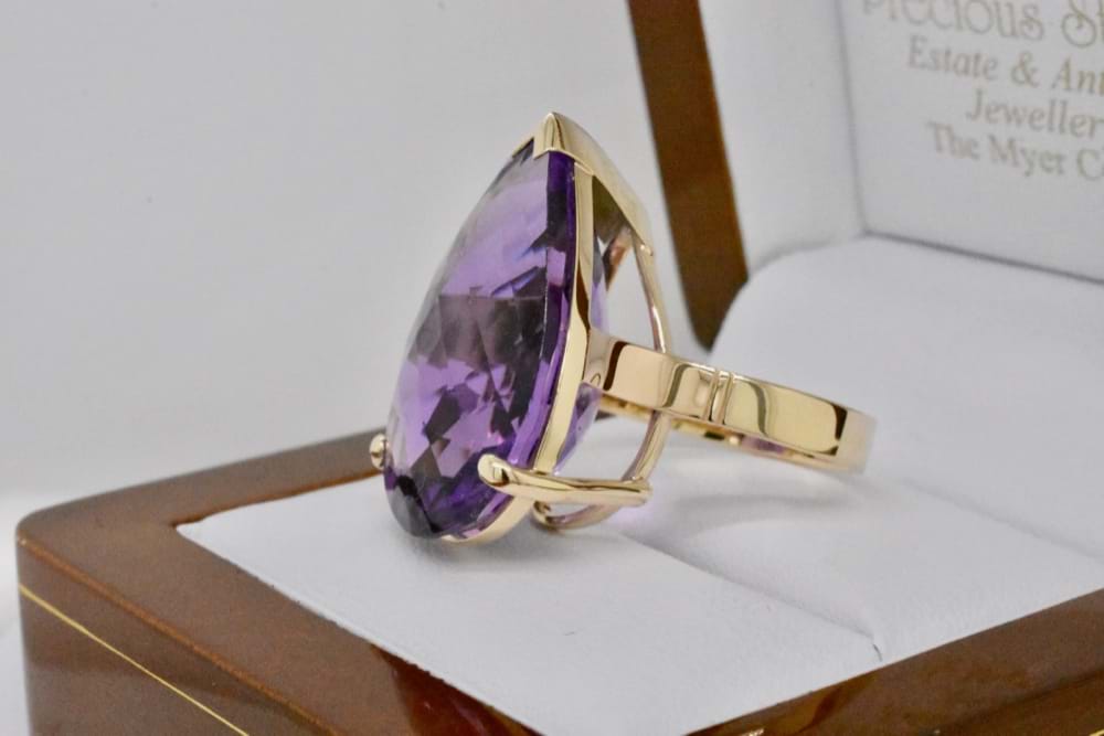 This epic teardrop amethyst has a beautiful checkerboard faceting on the top and measures an impressive 26x18mm. Weighing 28cts it has been set with two claws at the base and a v-cap end in a handmade 9ct yellow gold ring with a simple and flat shank. Finger size P. Independent Valuation Supplied