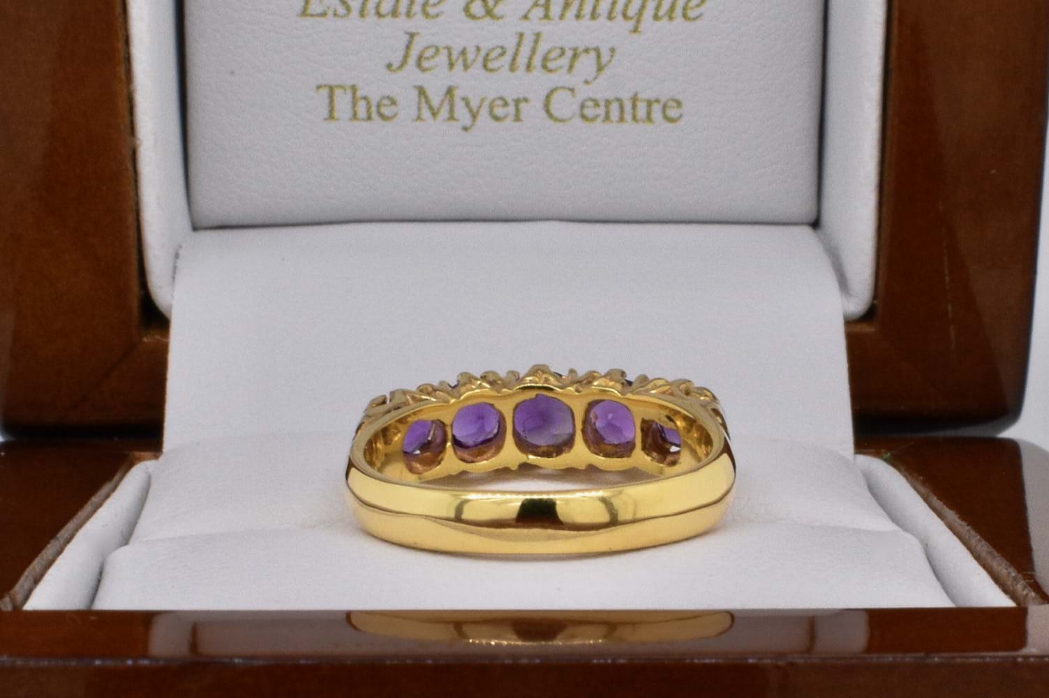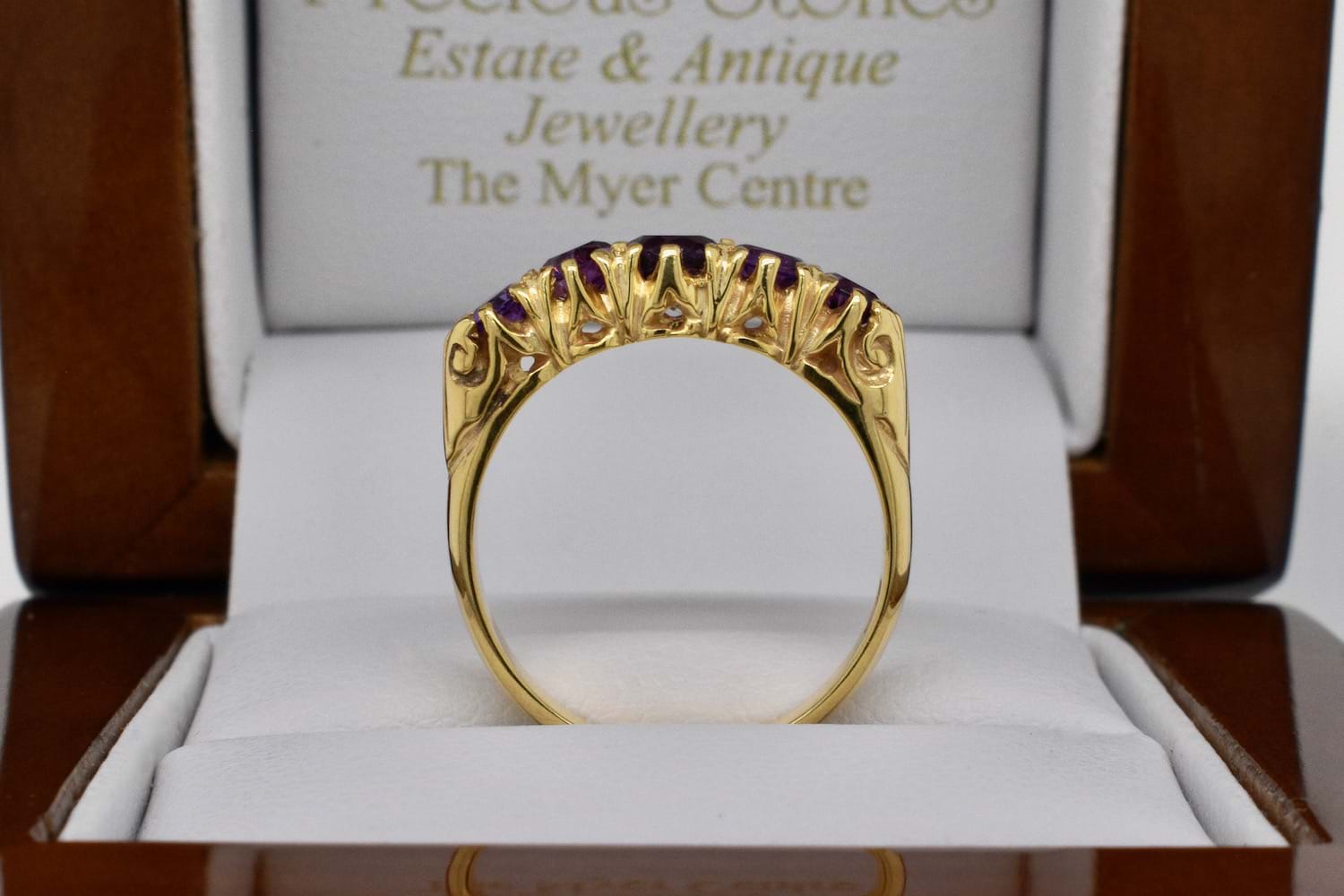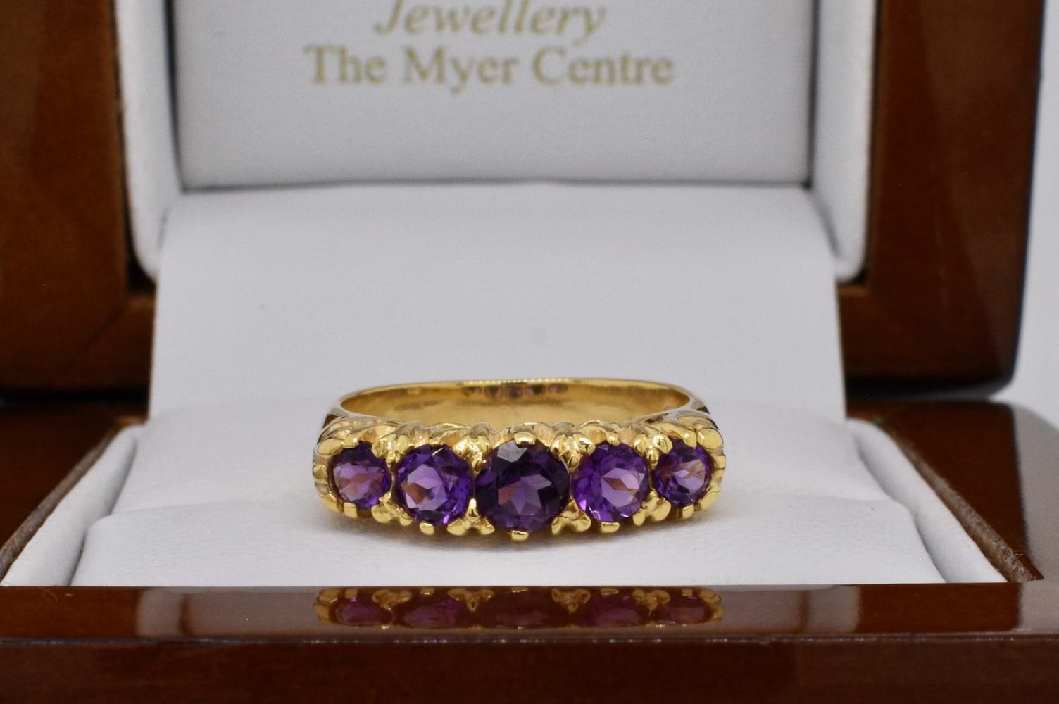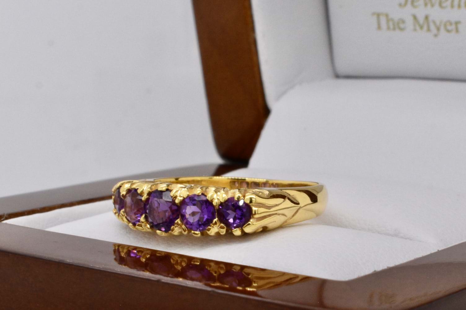 An antique inspired design featuring five faceted, graduated, amethysts set into a 9ct yellow gold ring reminiscent of a Victorian bridge ring with a fancy claw style gallery. Finger size K+