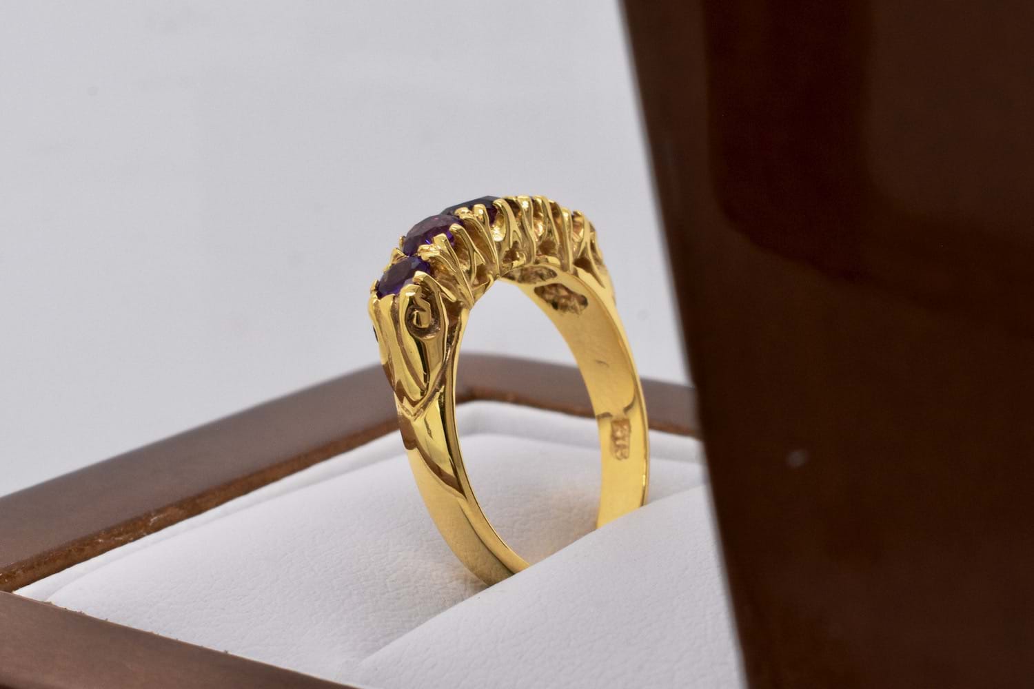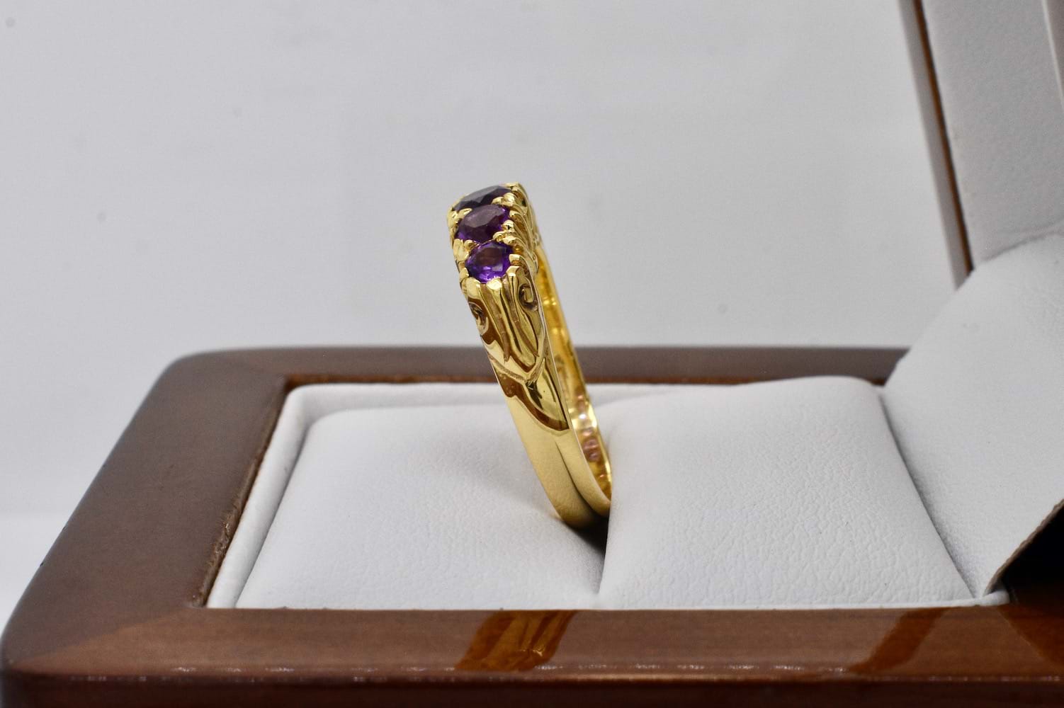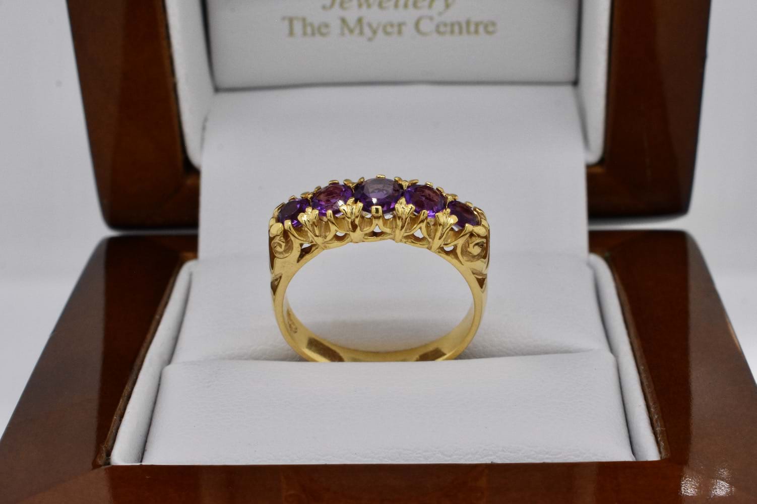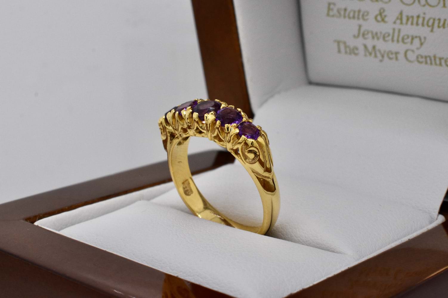 An antique inspired design featuring five faceted, graduated, amethysts set into a 9ct yellow gold ring reminiscent of a Victorian bridge ring with a fancy claw style gallery. Finger size K+