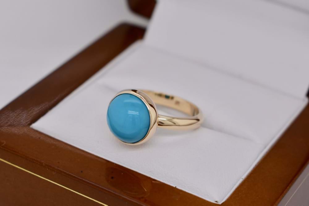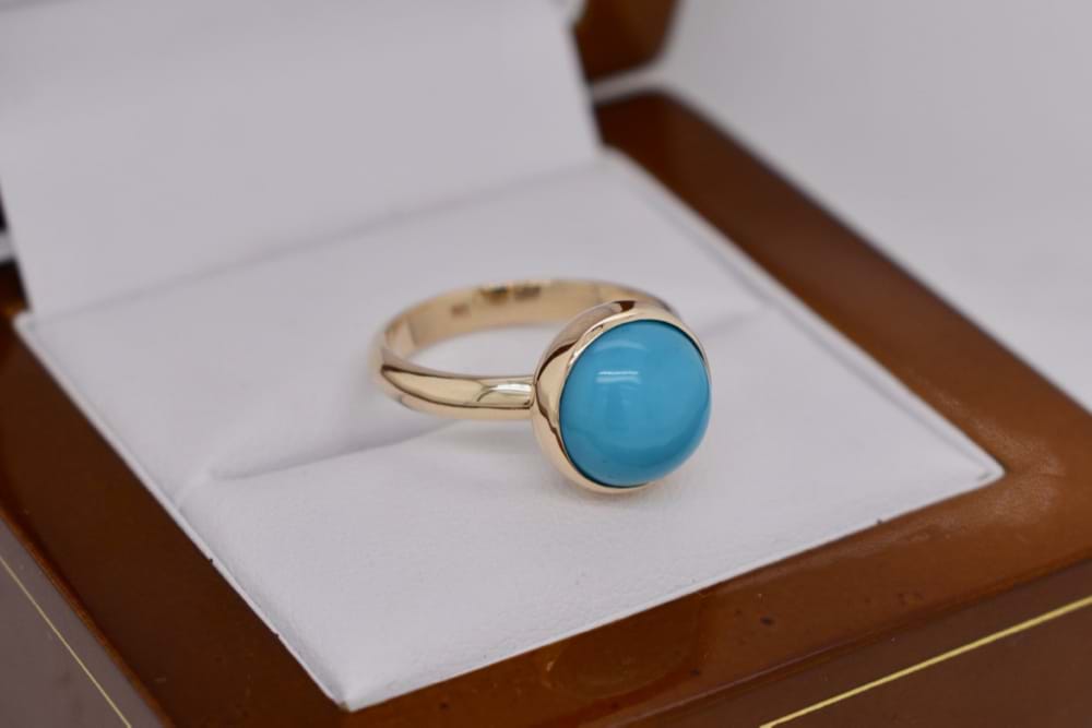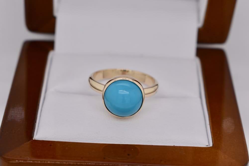 9ct yellow gold handmade ring featuring one lovely round cabochon turquoise from Arizona in a bezel setting. Stone measures 10mm. Finger size L+