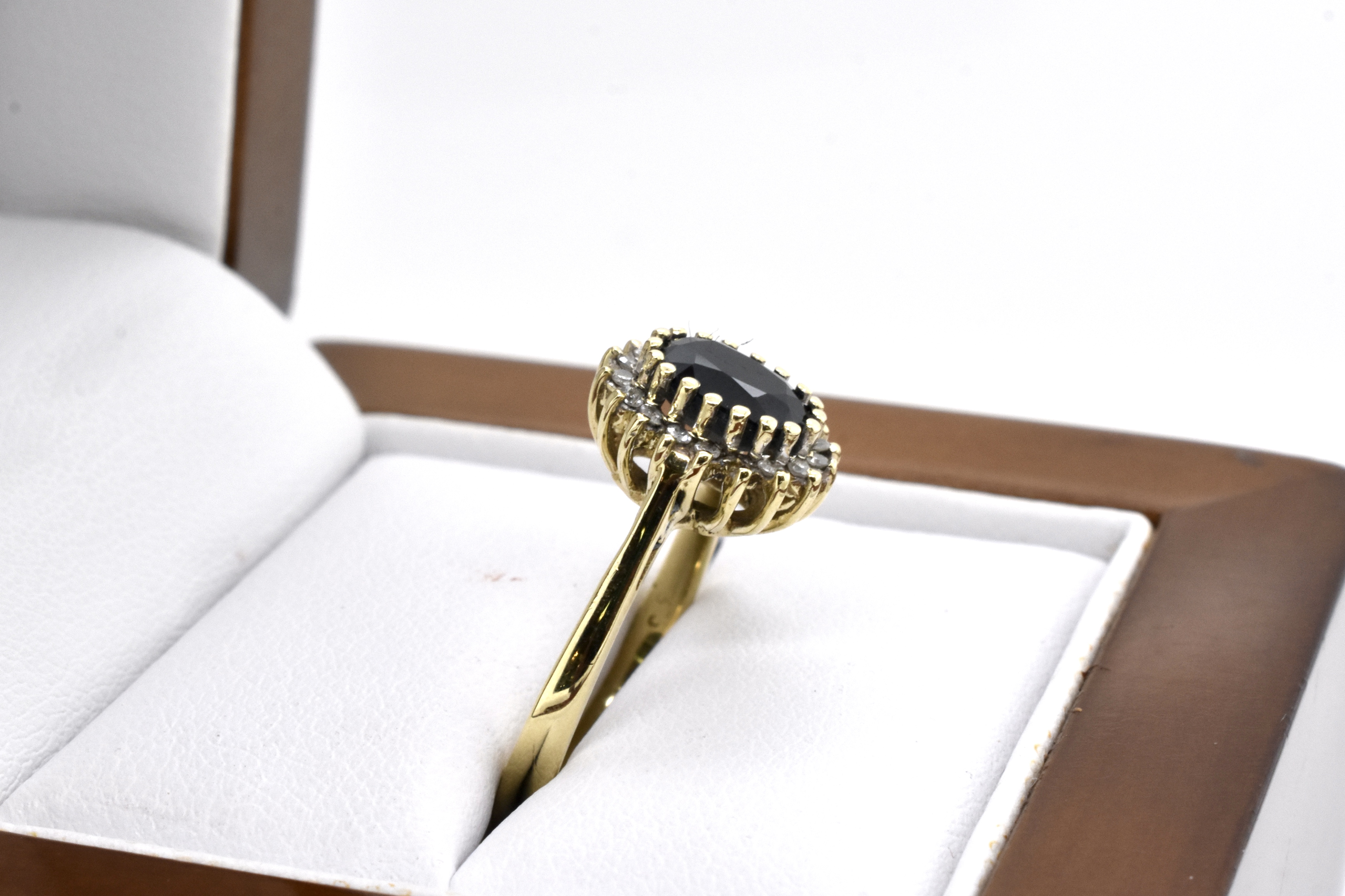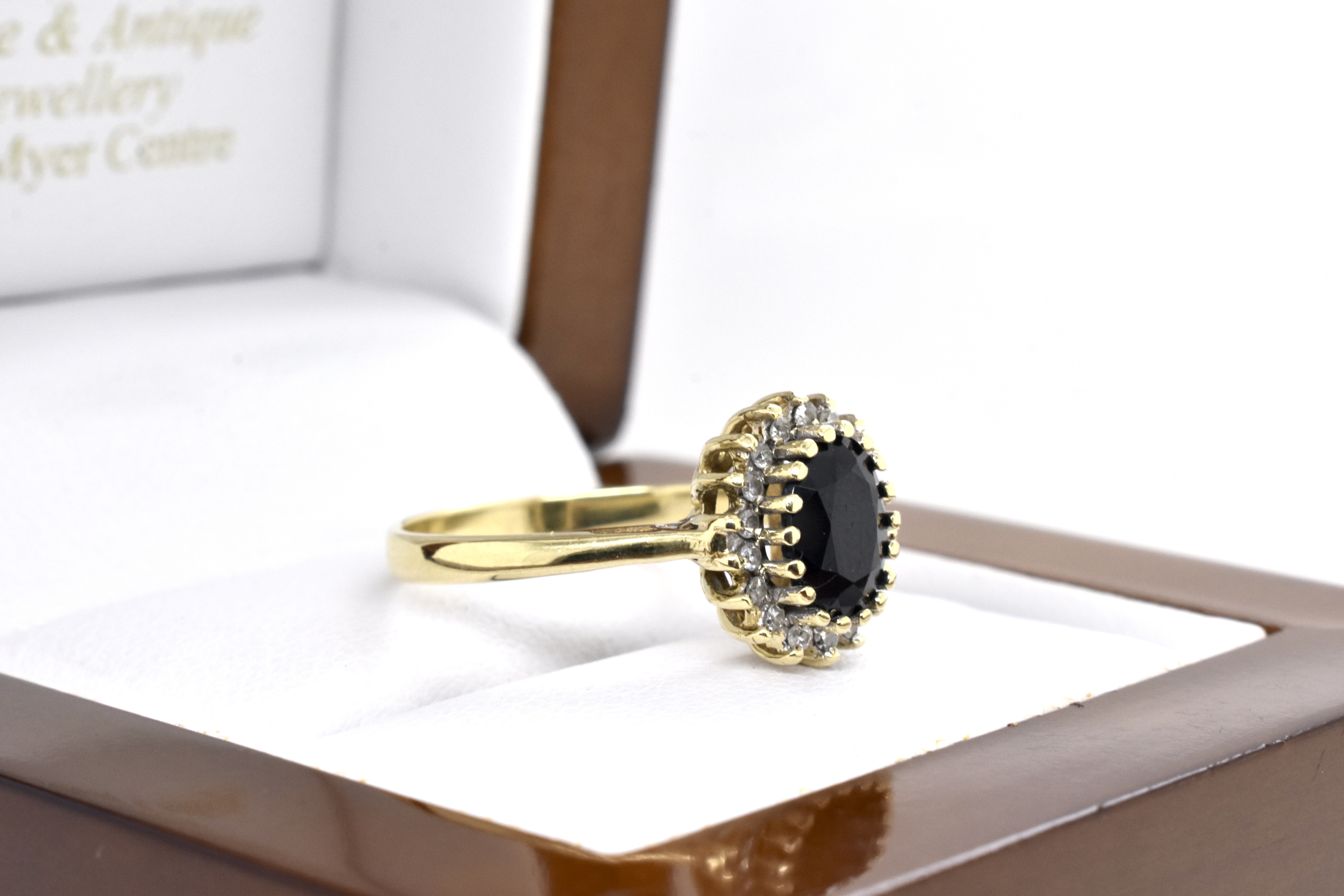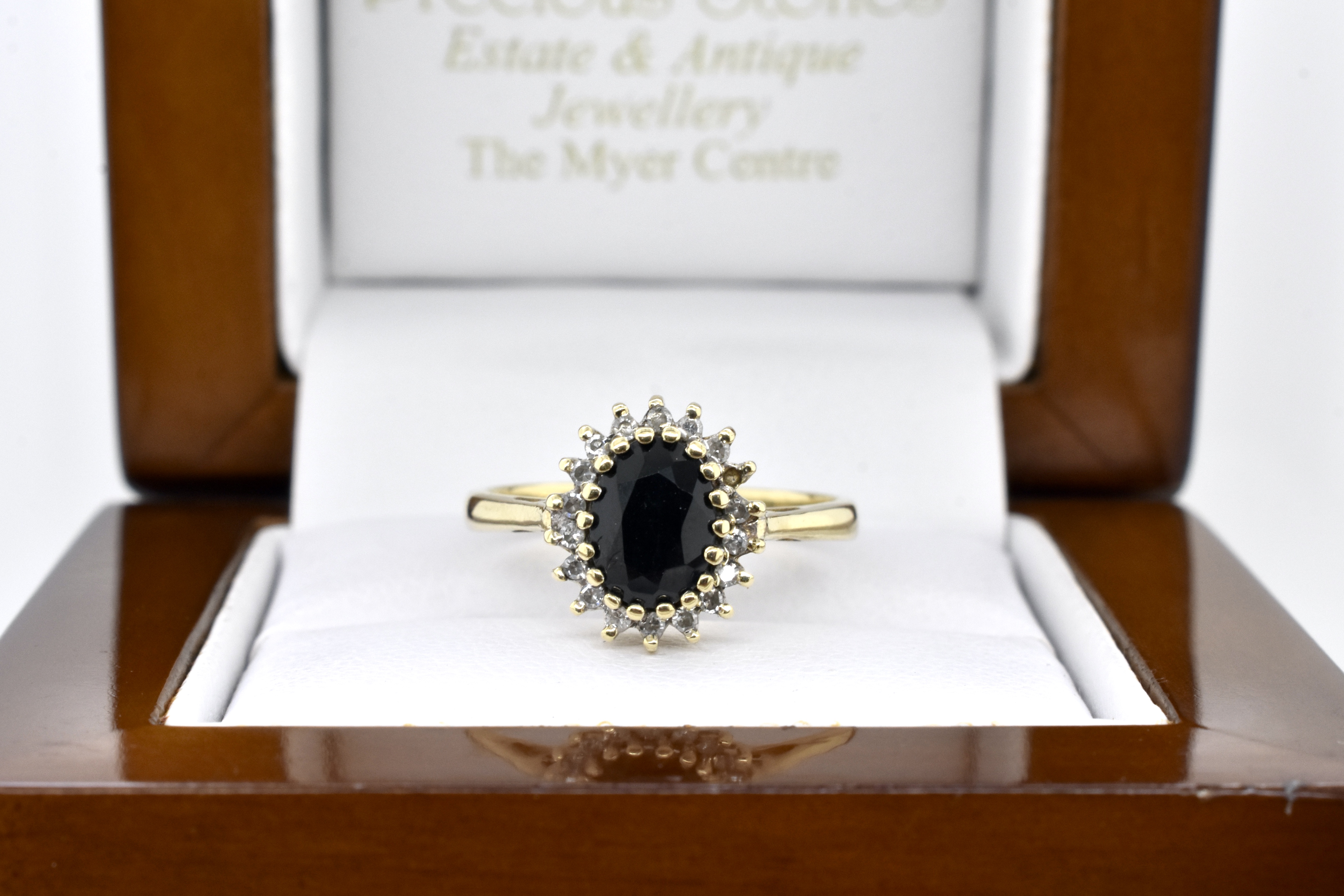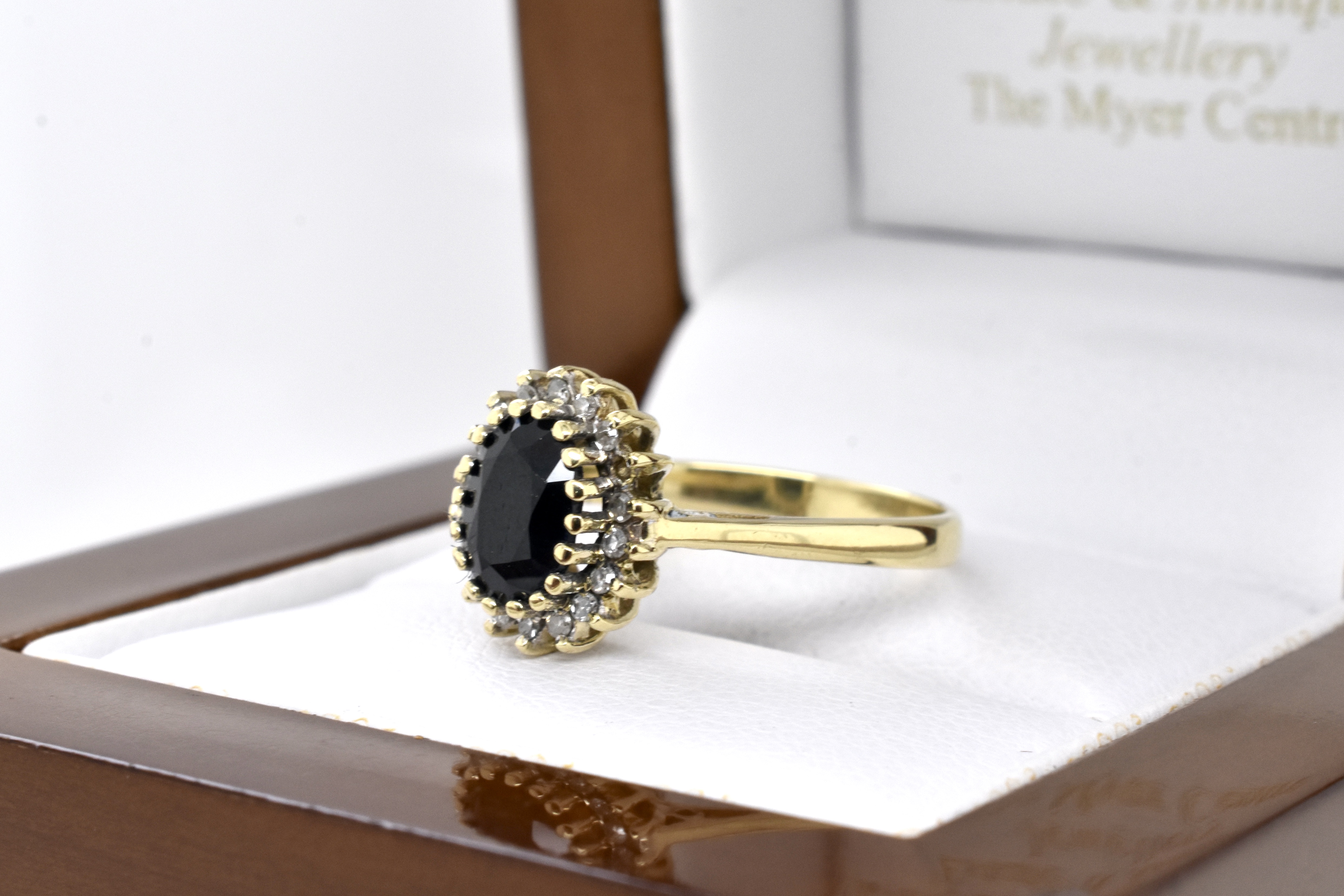 An elegant and classic ring, crafted in 9ct yellow gold and set with an Australian, oval blue sapphire, in a multi claw setting with a halo of diamonds on a plain band. Finger size M+