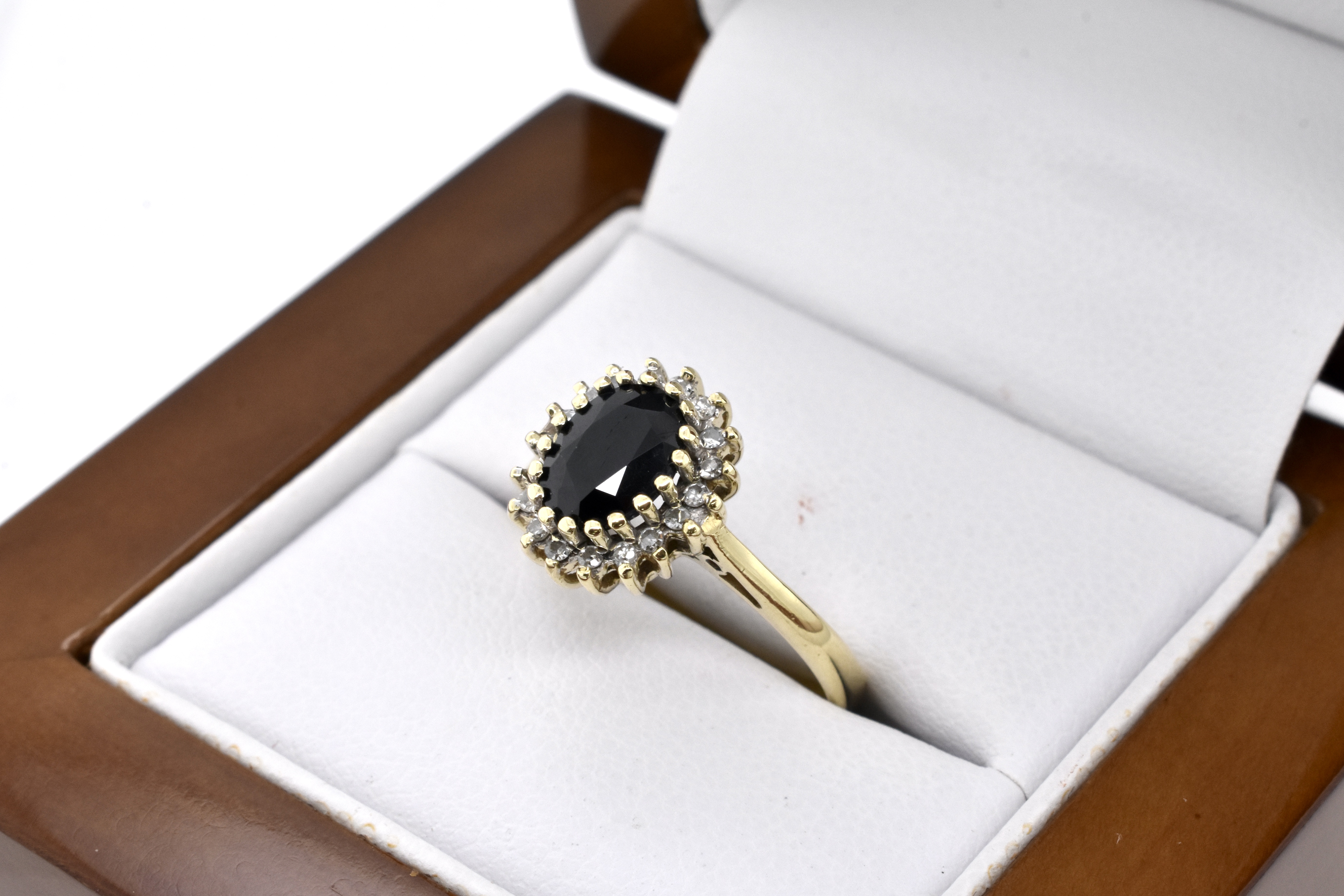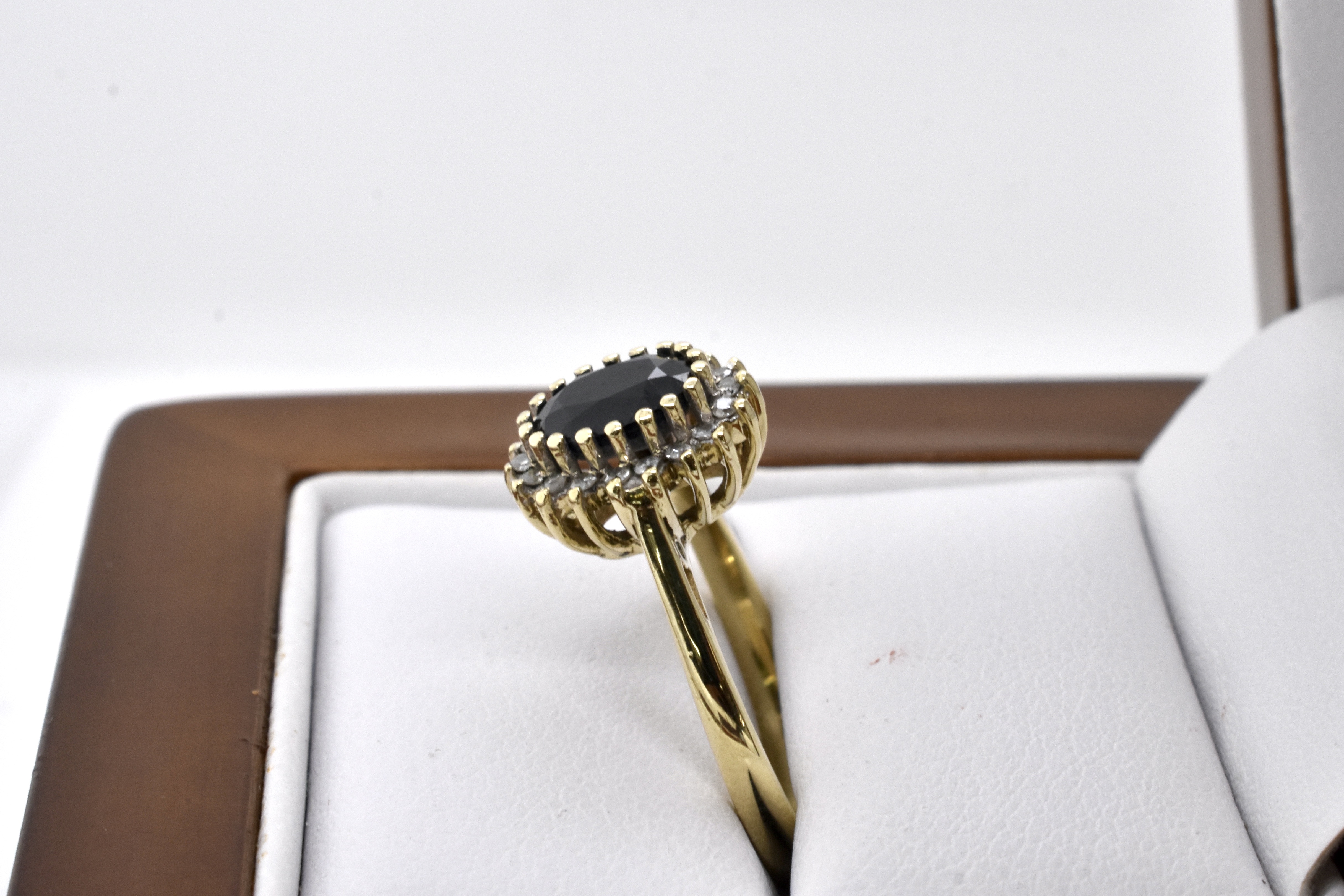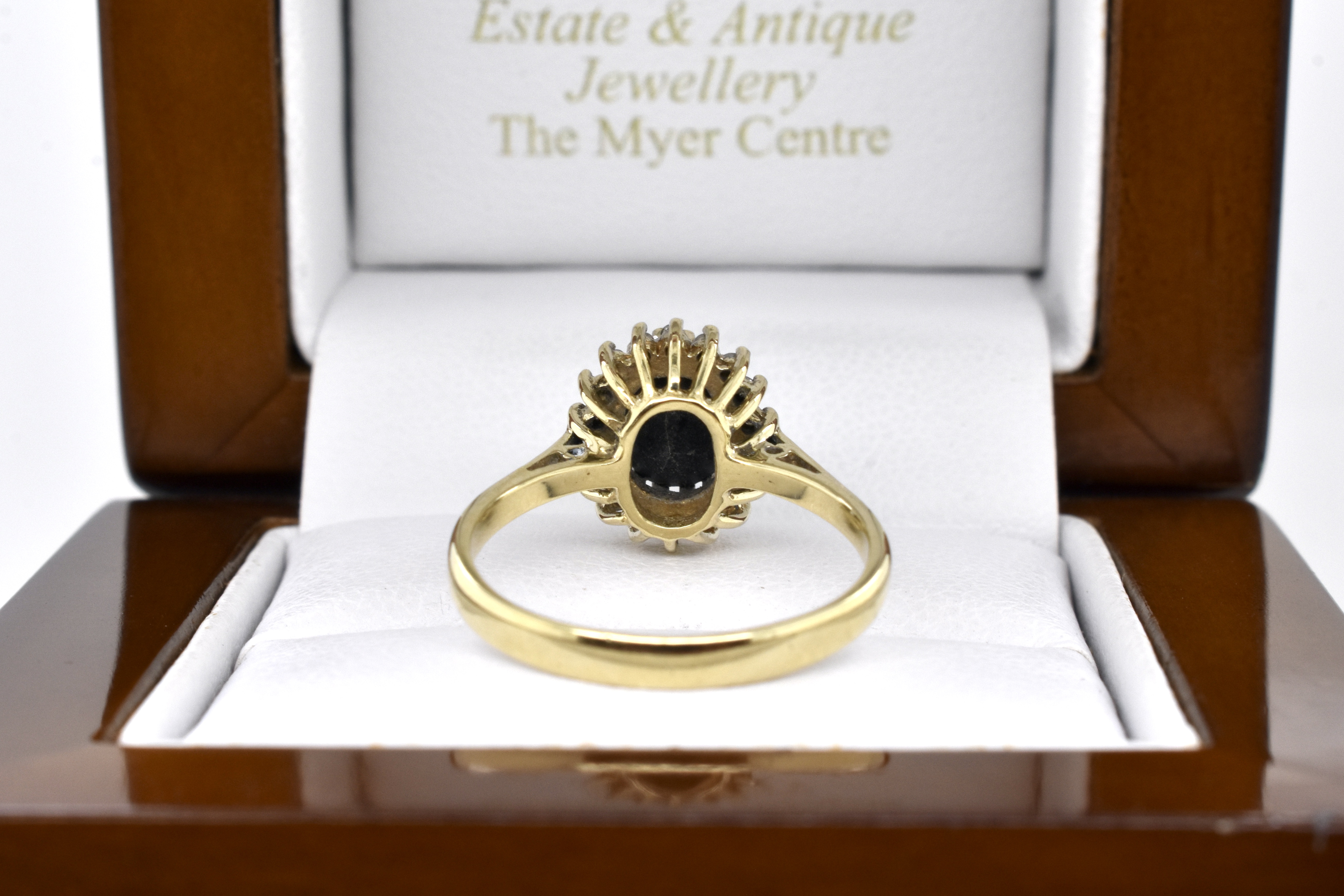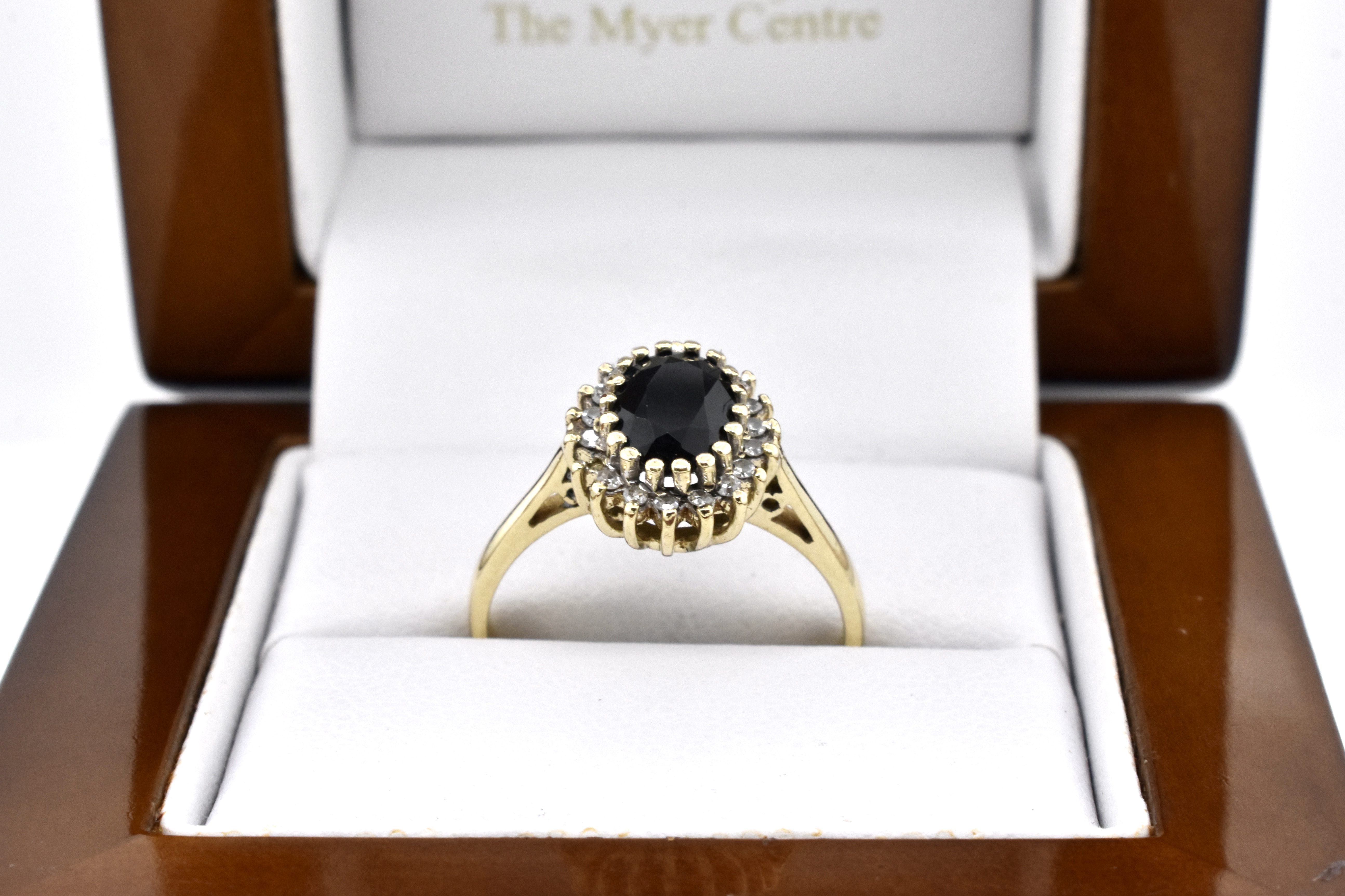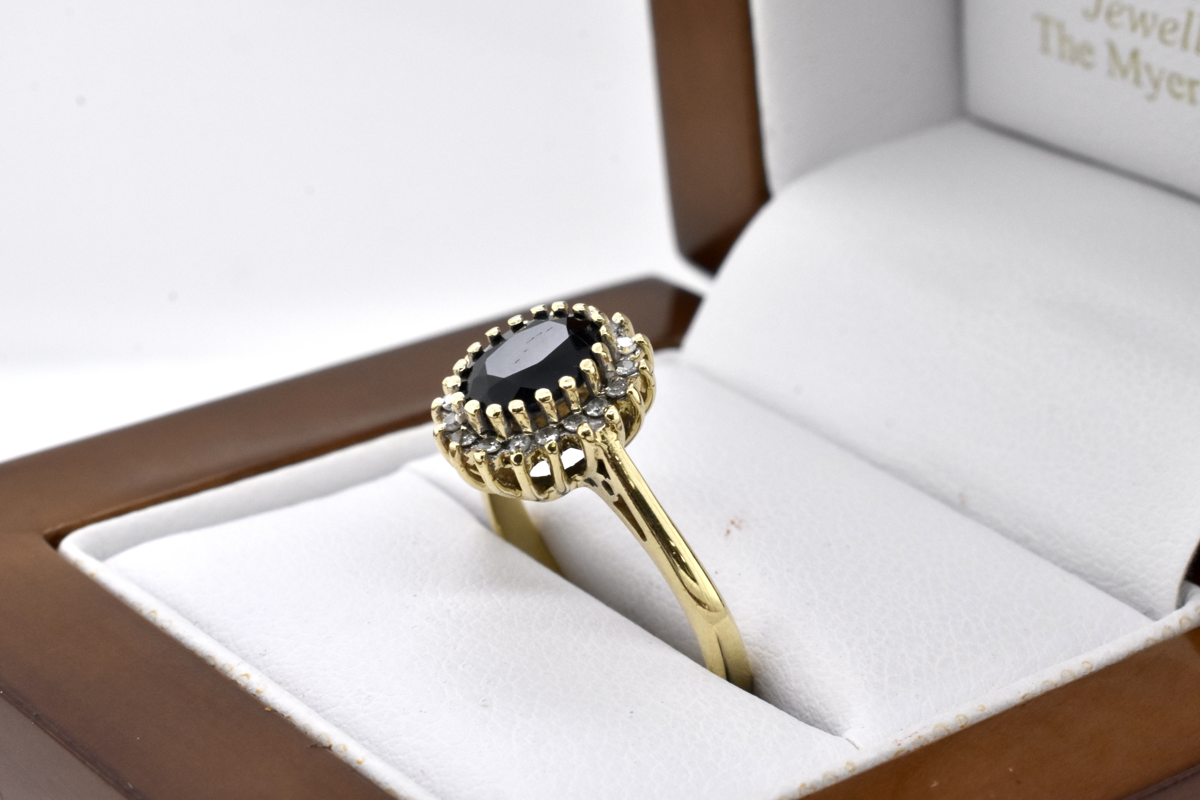 An elegant and classic ring, crafted in 9ct yellow gold and set with an Australian, oval blue sapphire, in a multi claw setting with a halo of diamonds on a plain band. Finger size M+