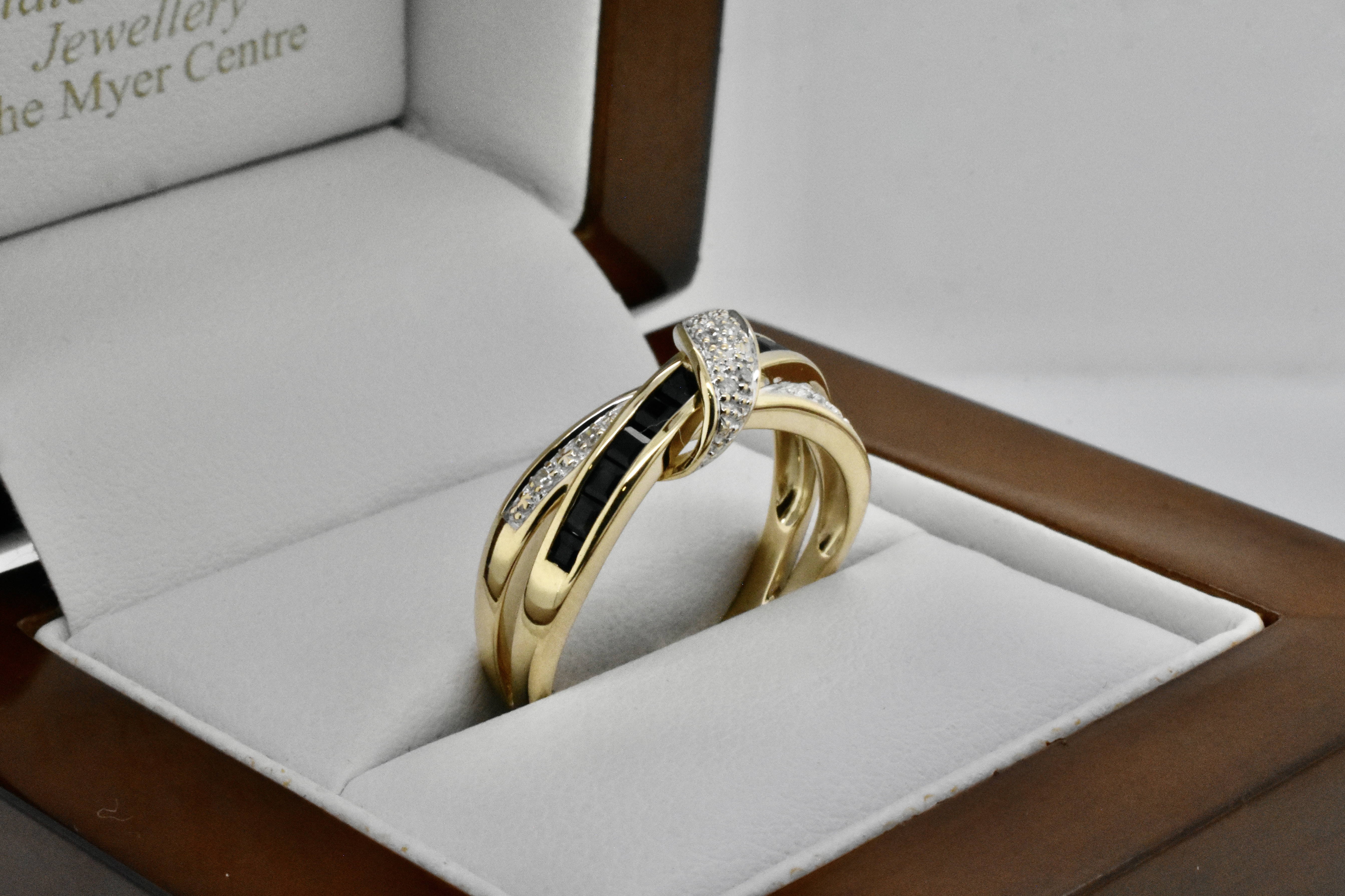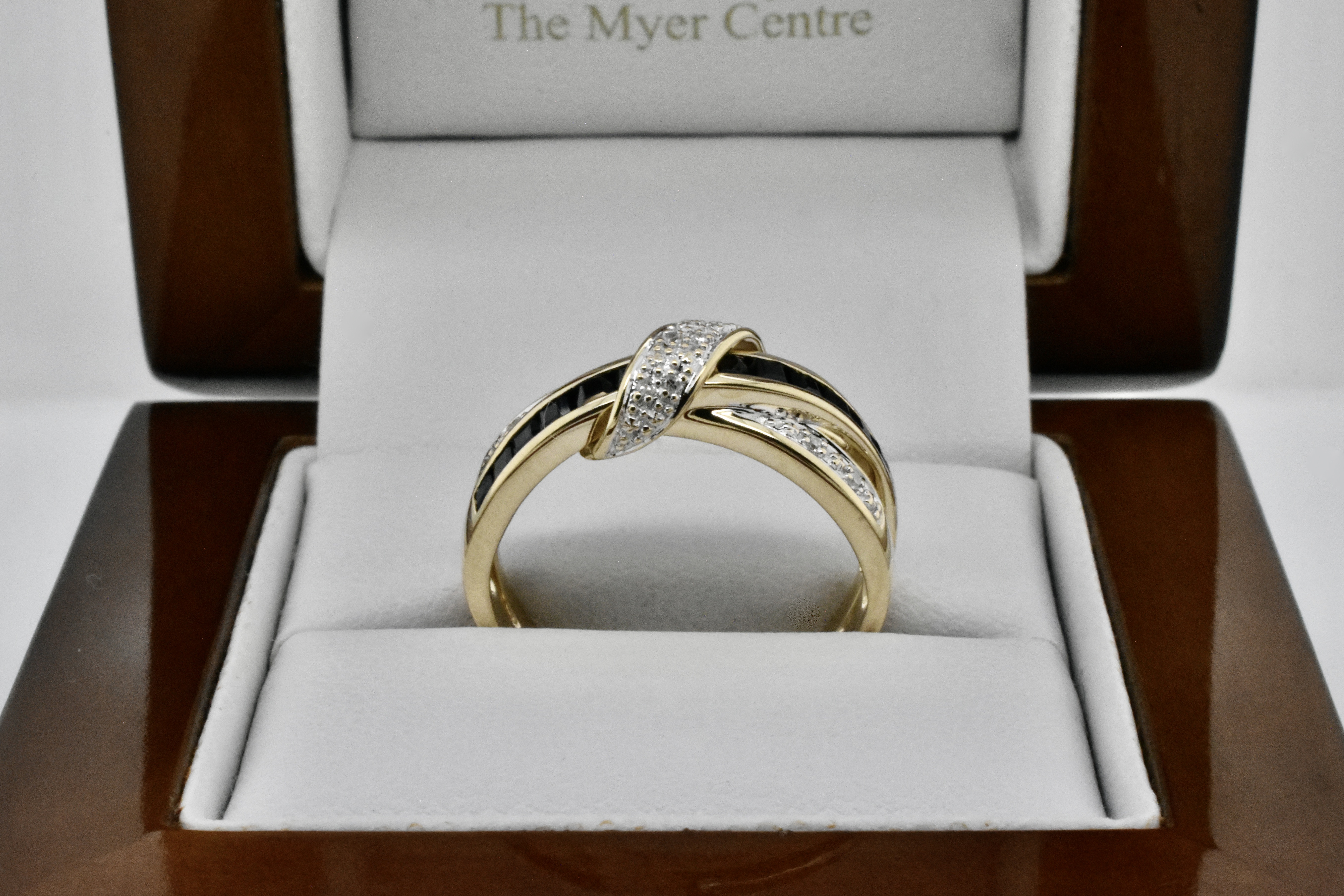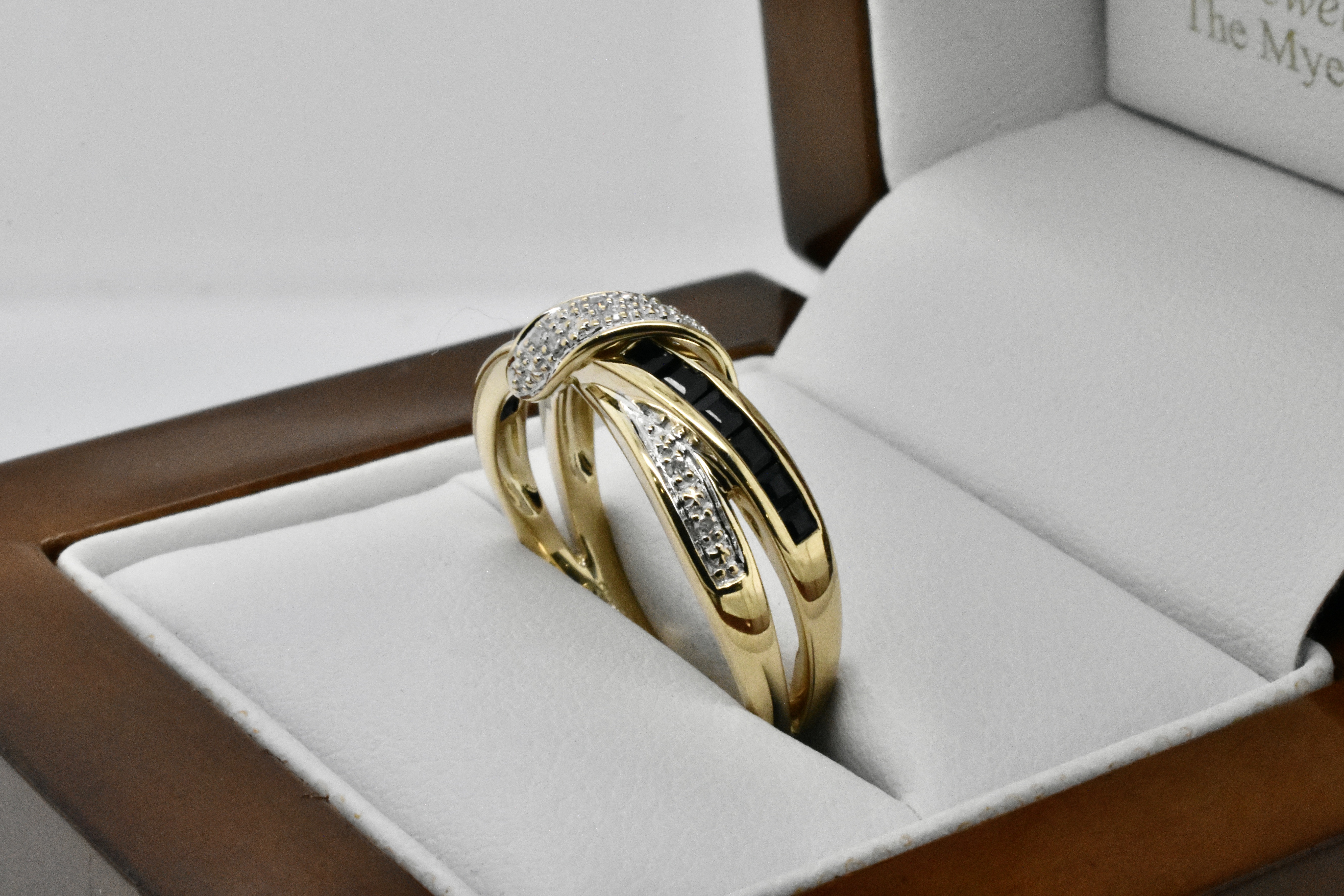 This modern yet elegant ring is made from 9ct yellow gold and features a band of princess cut black sapphires with a band and wrap around design of contrasting RBC sparkly, white diamonds with a split shoulder element. Finger size P