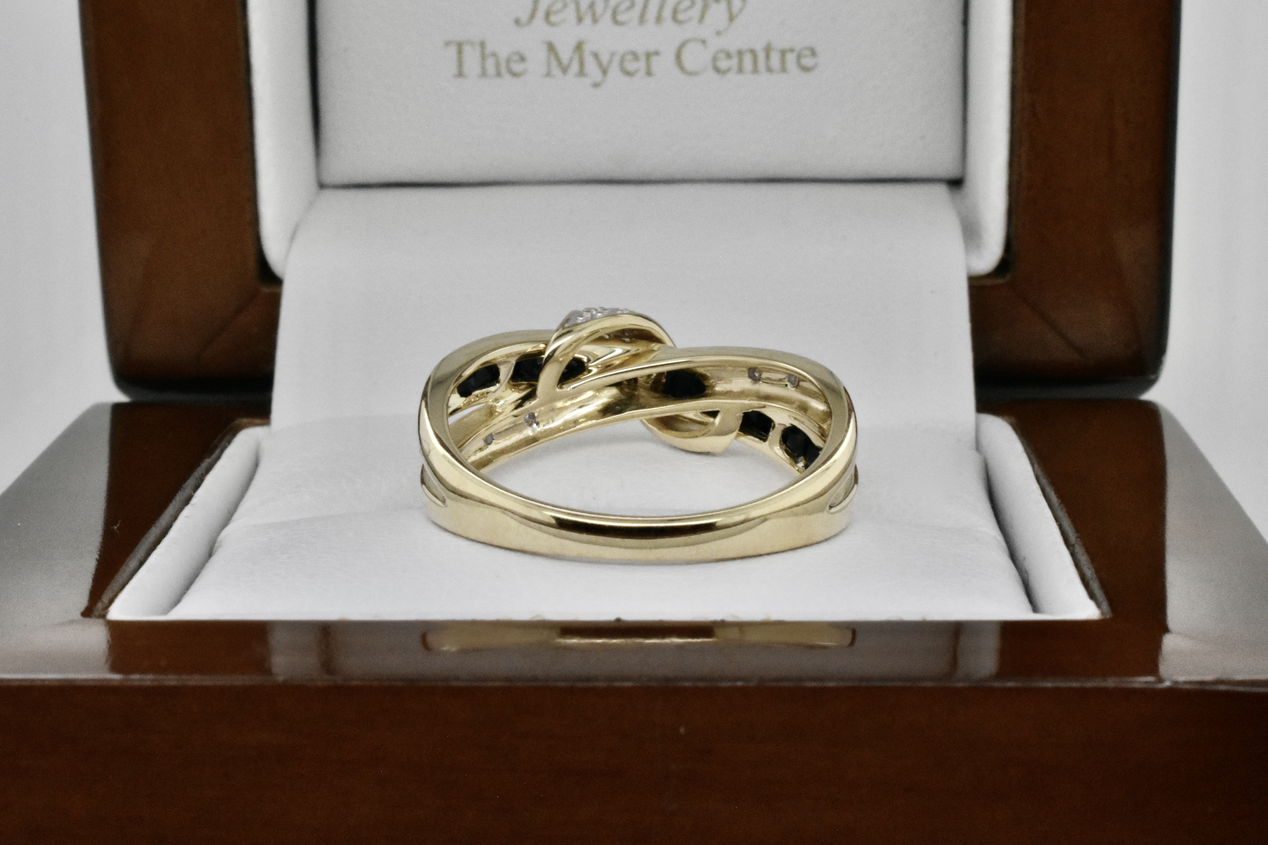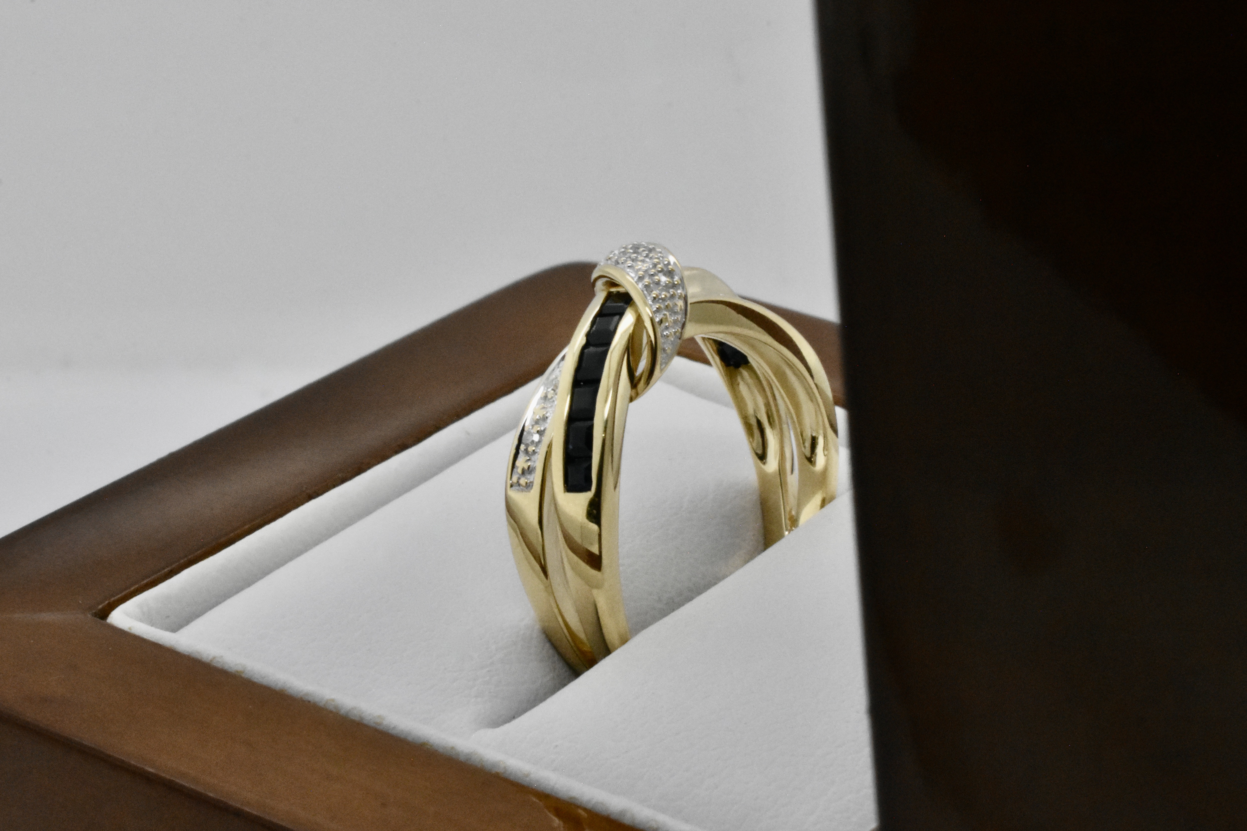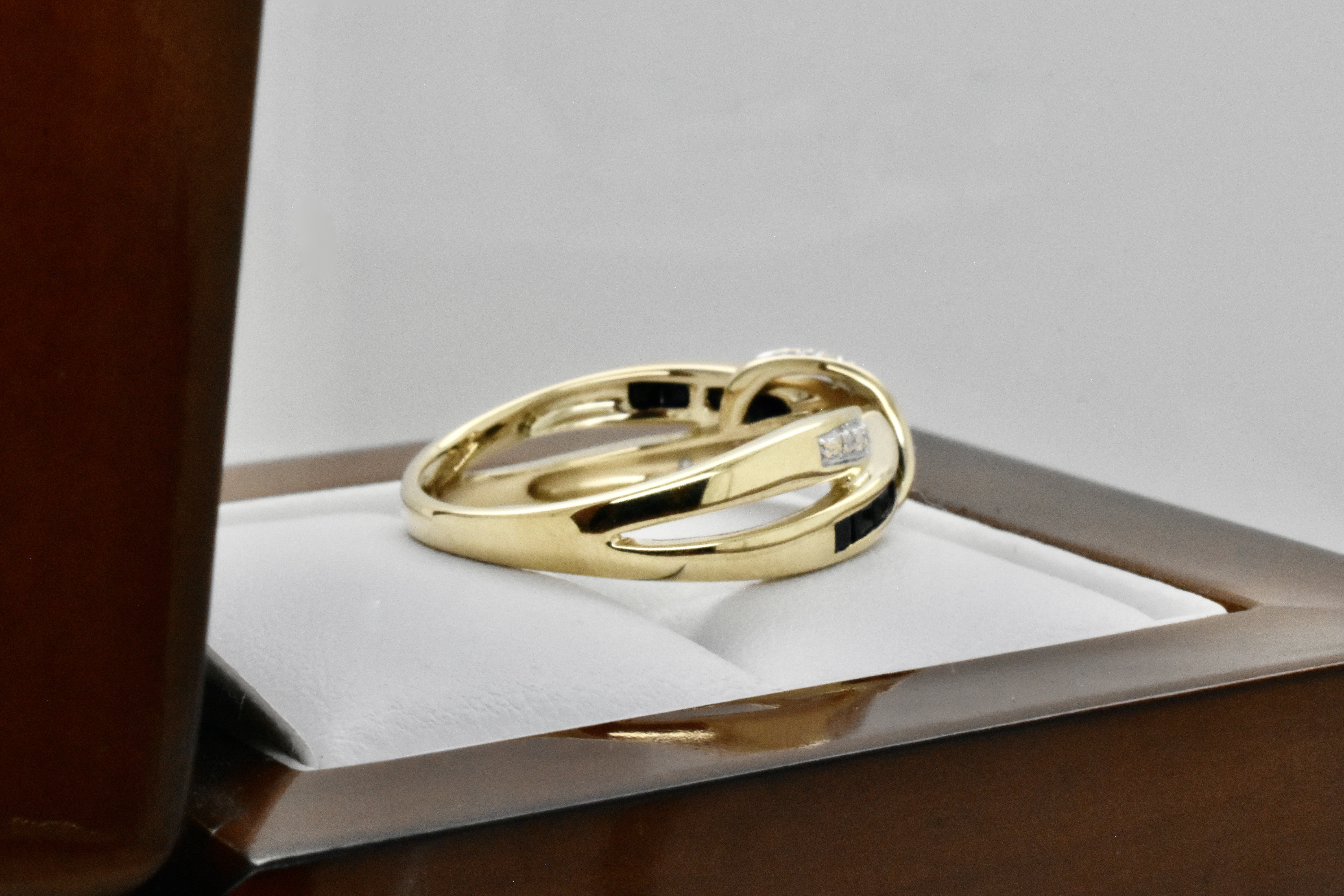 This modern yet elegant ring is made from 9ct yellow gold and features a band of princess cut black sapphires with a band and wrap around design of contrasting RBC sparkly, white diamonds with a split shoulder element. Finger size P