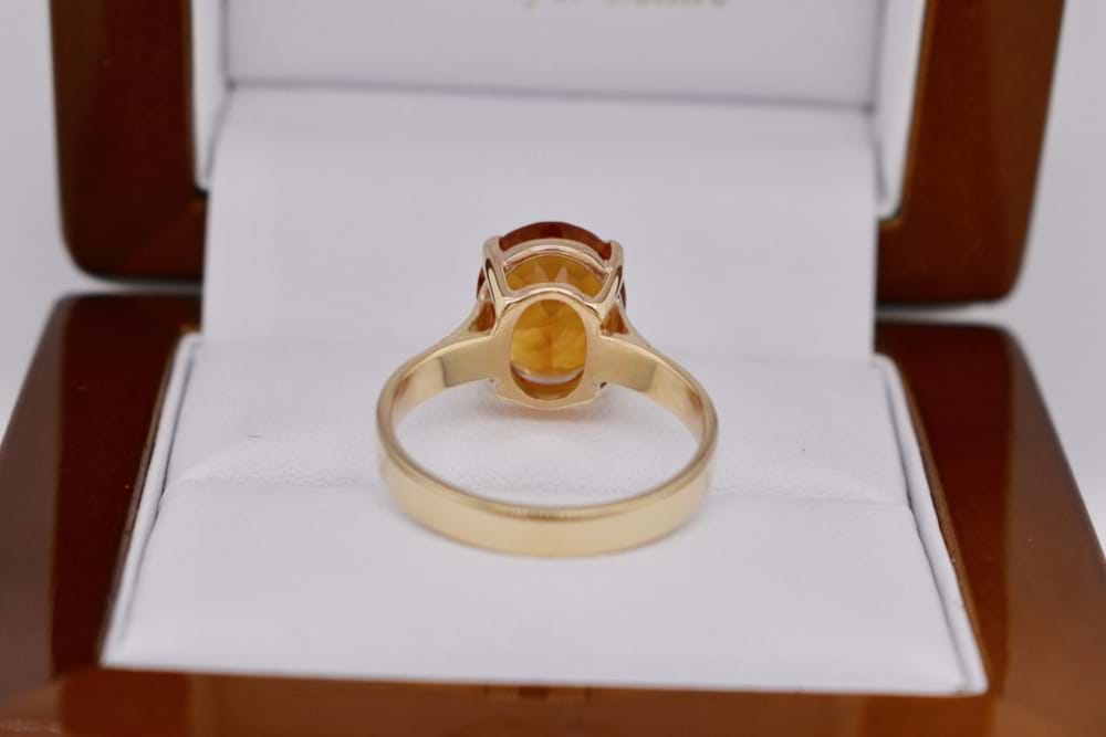 9ct yellow gold handmade ring featuring one gorgeous, faceted, oval, burnt orange citrine in a four claw setting. Stone measures 10.8x9mm. Finger size N