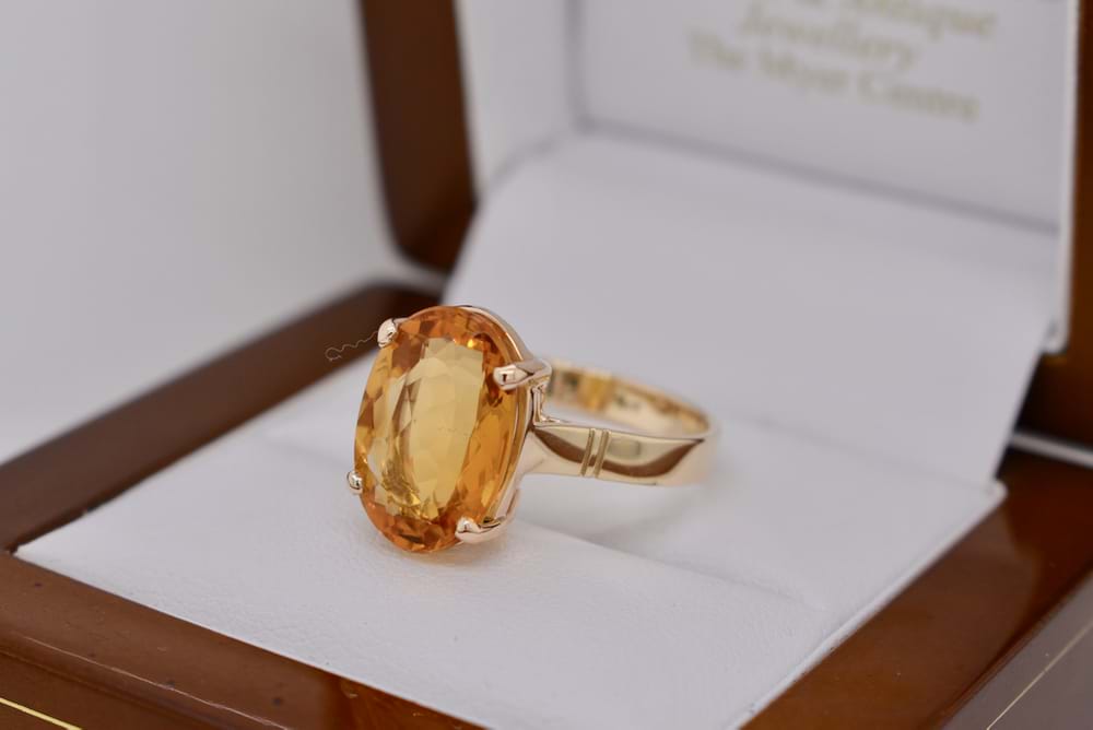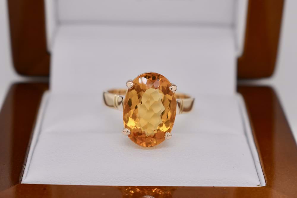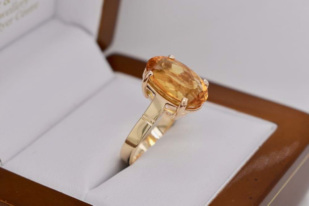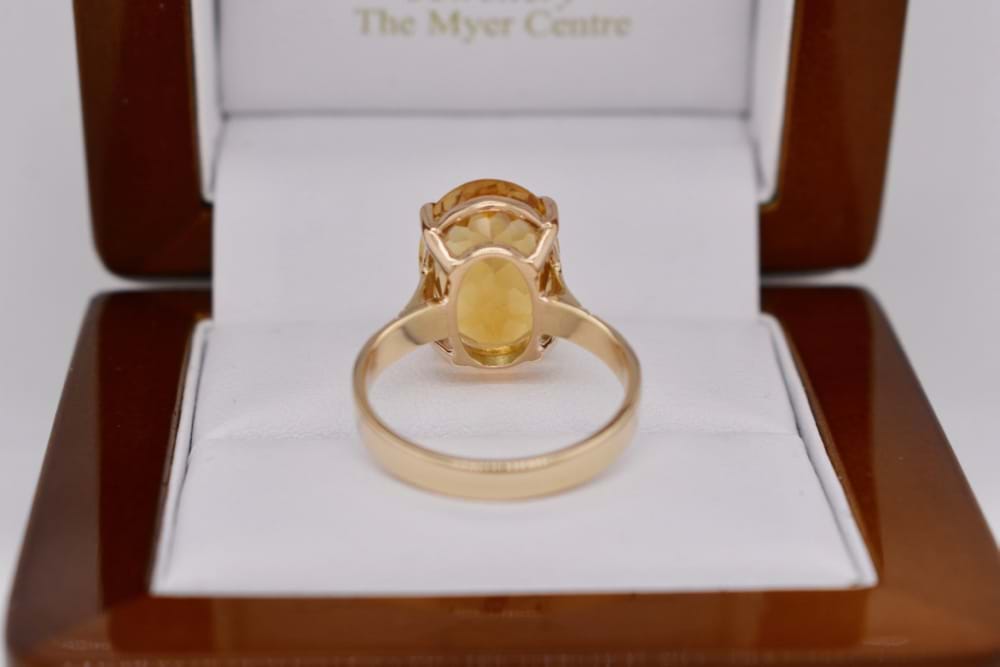 9ct yellow gold handmade ring featuring one gorgeous, faceted, oval, citrine in a four claw setting. Stone measures 15x10mm. Finger size O