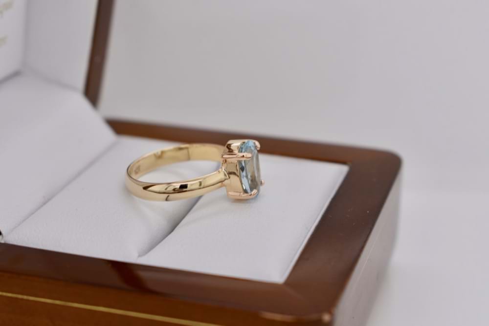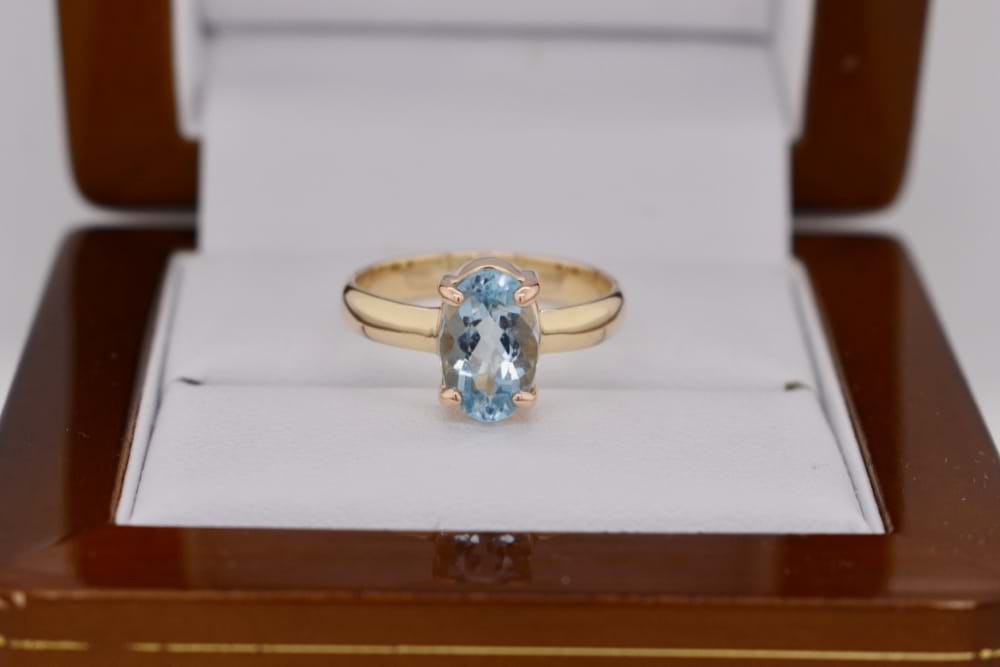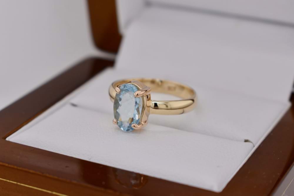 9ct yellow gold handmade ring featuring one gorgeous, faceted, oval, aquamarine in a four claw setting. Stone measures 9x6mm. Finger size L