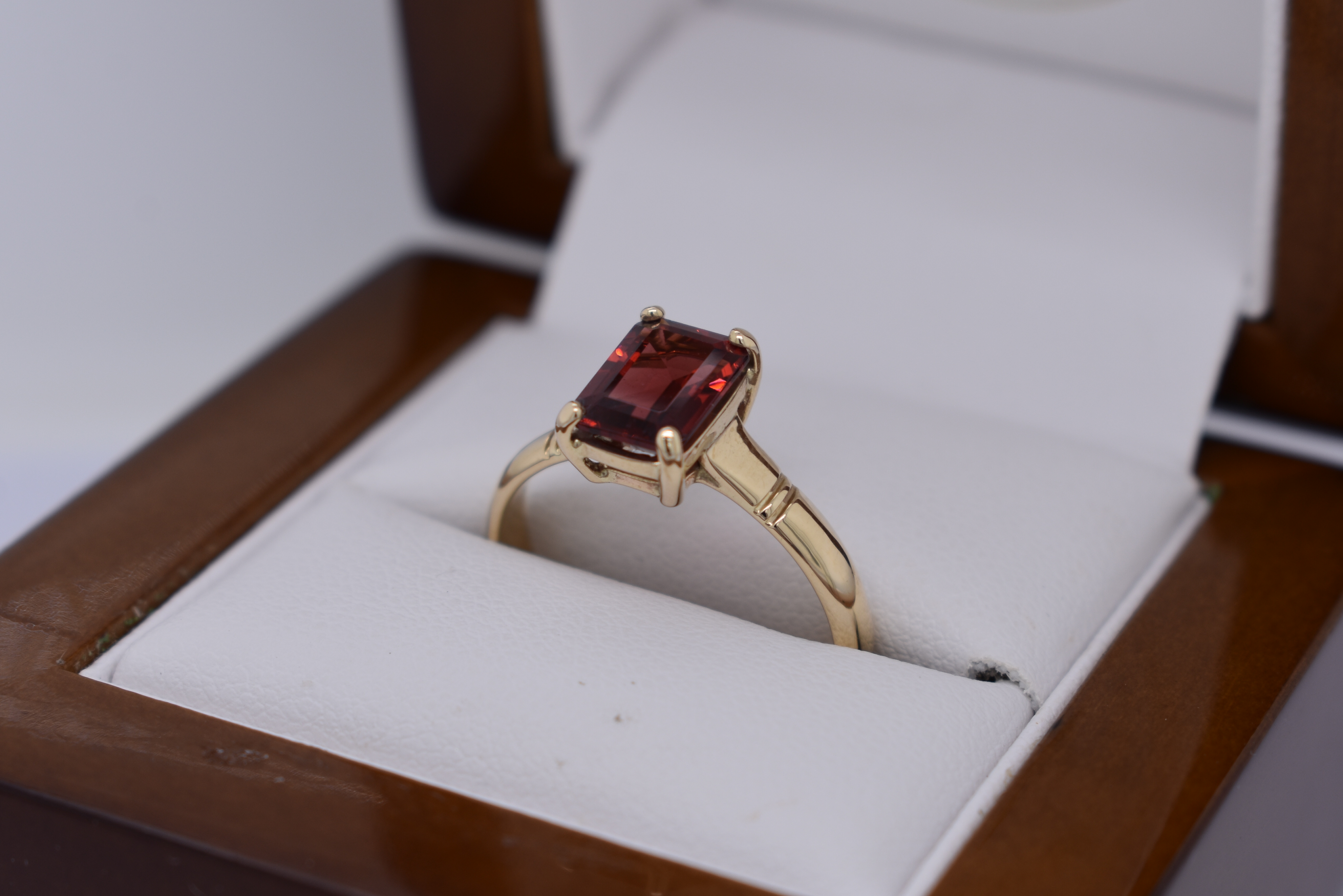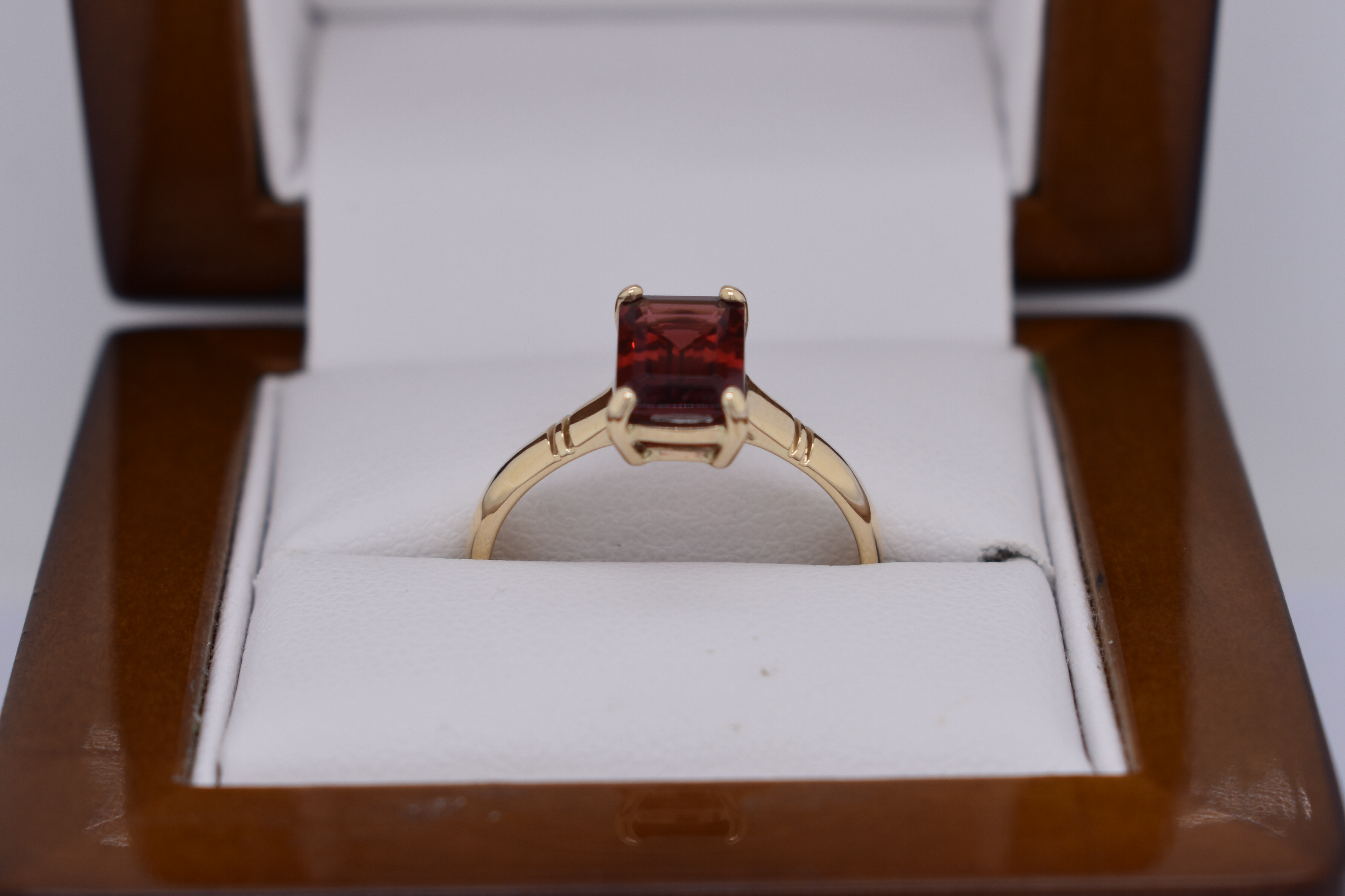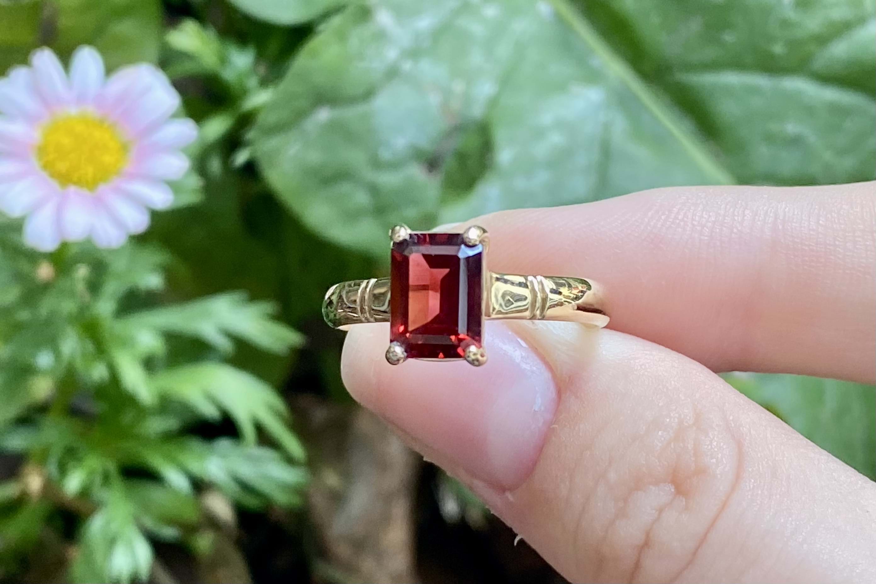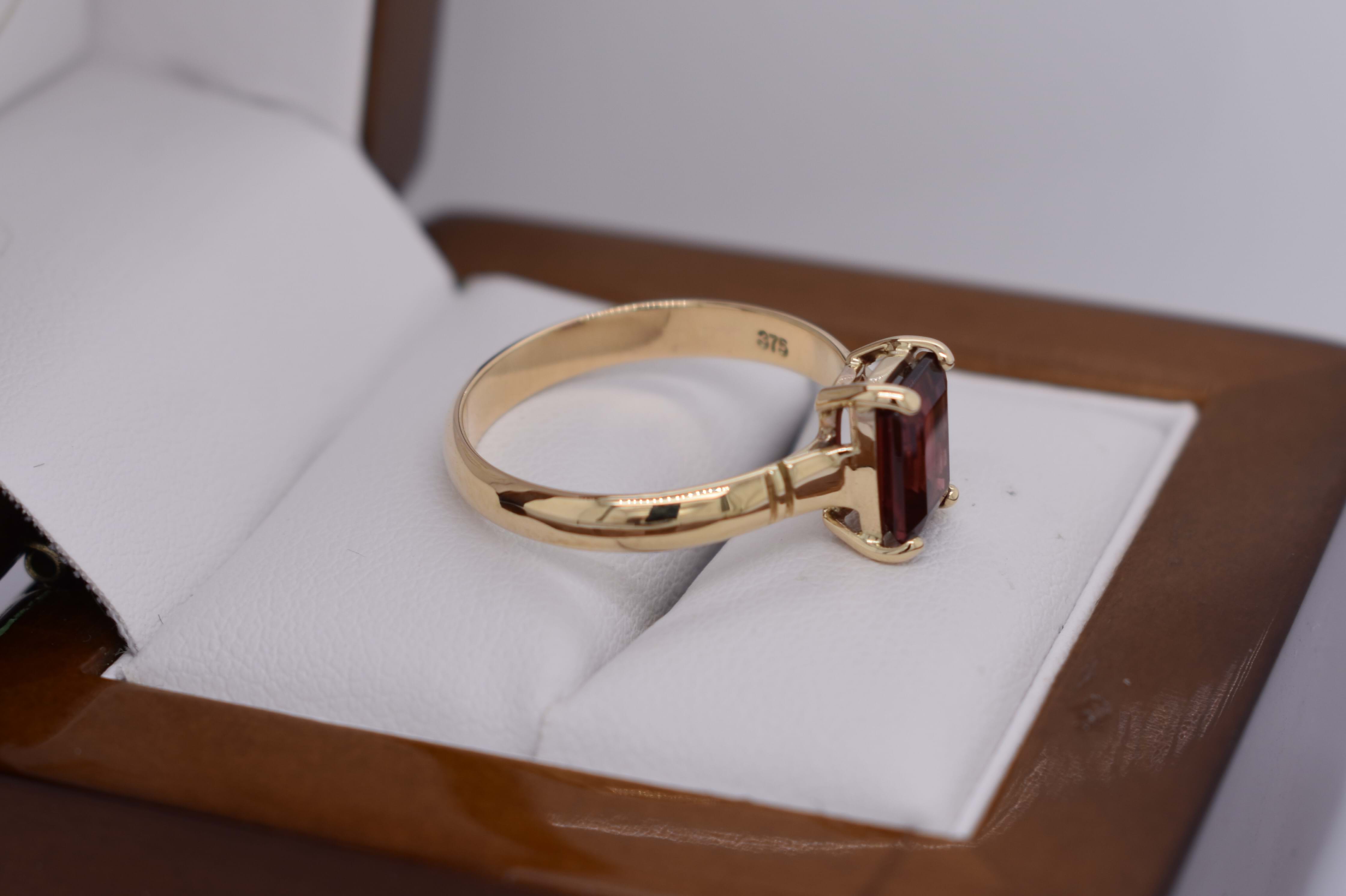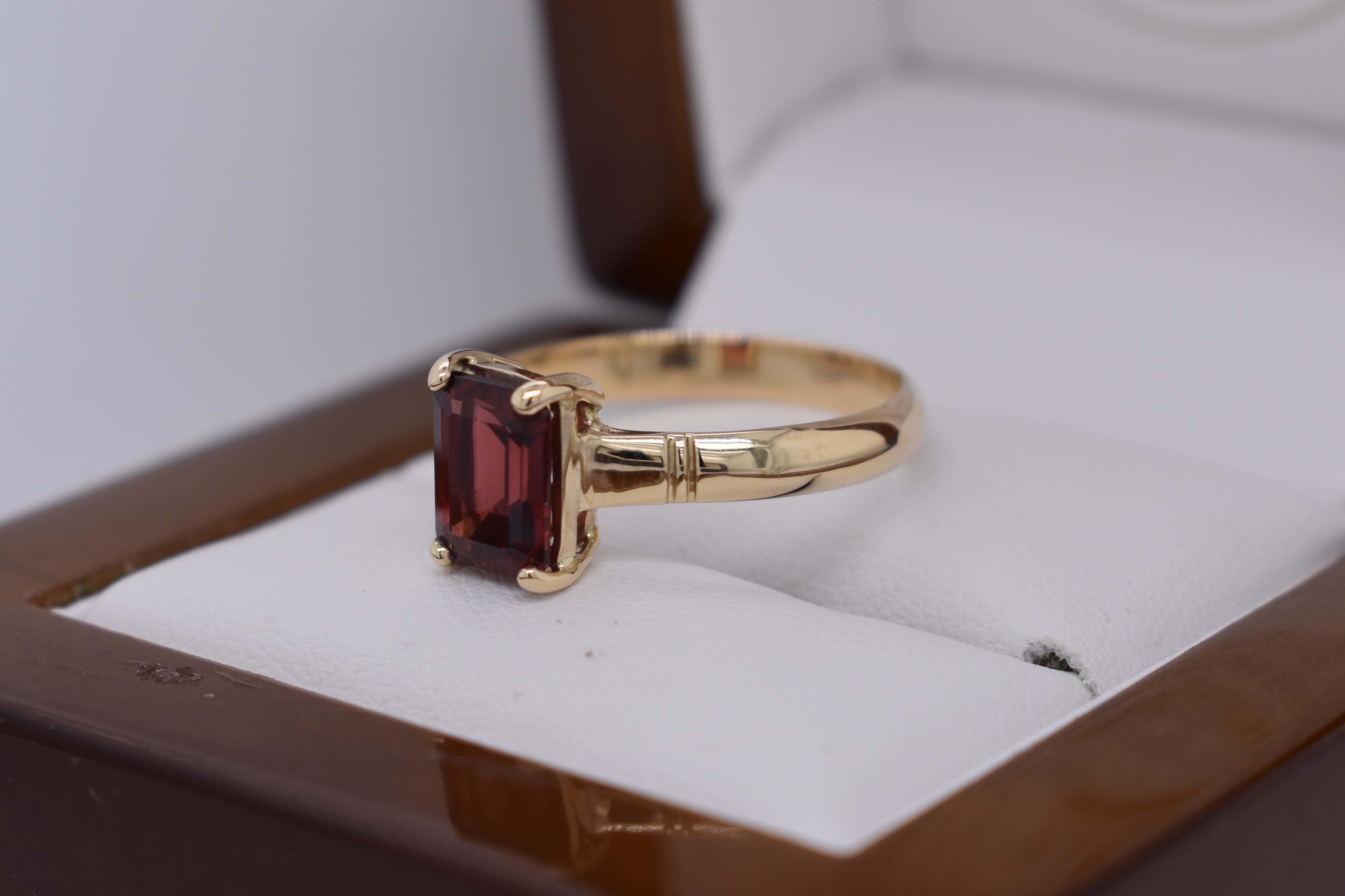A stunning emerald cut shaped garnet ring, four claw set, in 9ct yellow gold. This handmade ring measures 8.5x6.0mm and is completed with a grooved gold band. Finger size Q.