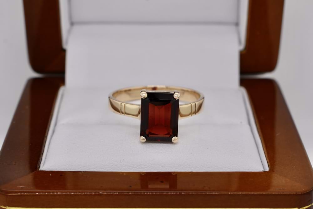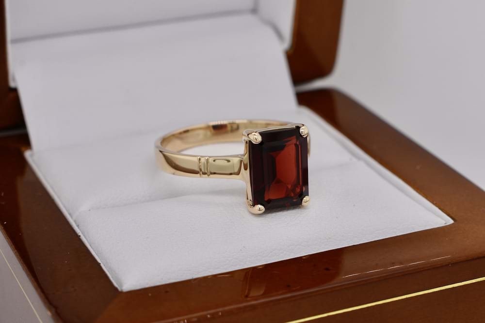 Handmade 9ct yellow gold ring featuring a four claw set emerald cut garnet measuring 10x8mm with a plain band. Finger size S