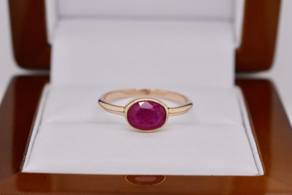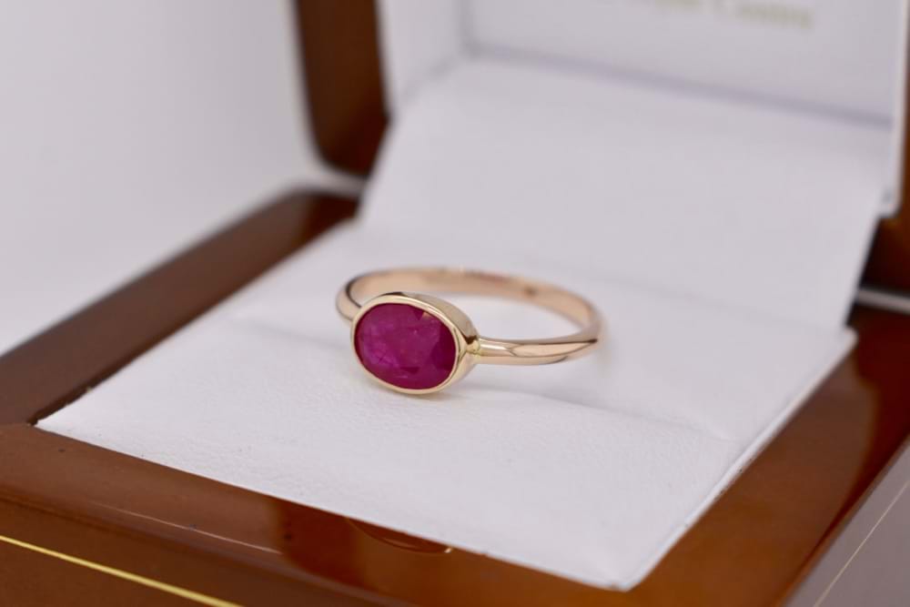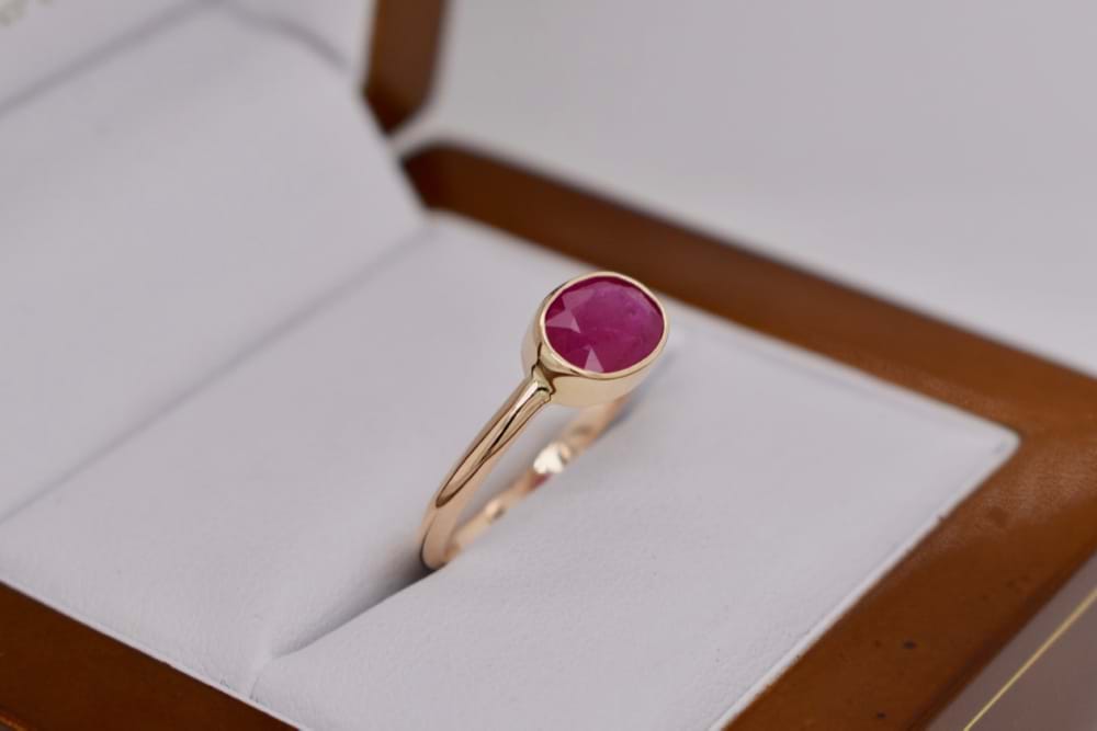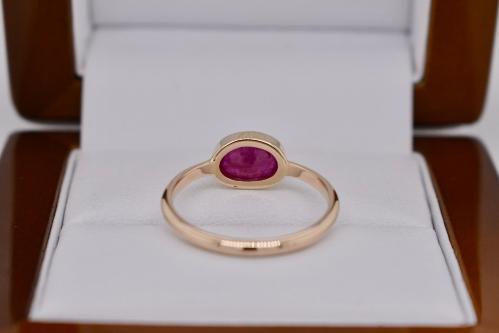 9ct yellow gold handmade ring bezel set with an oval 8x6mm opaque natural Ruby. Finger size N.5
