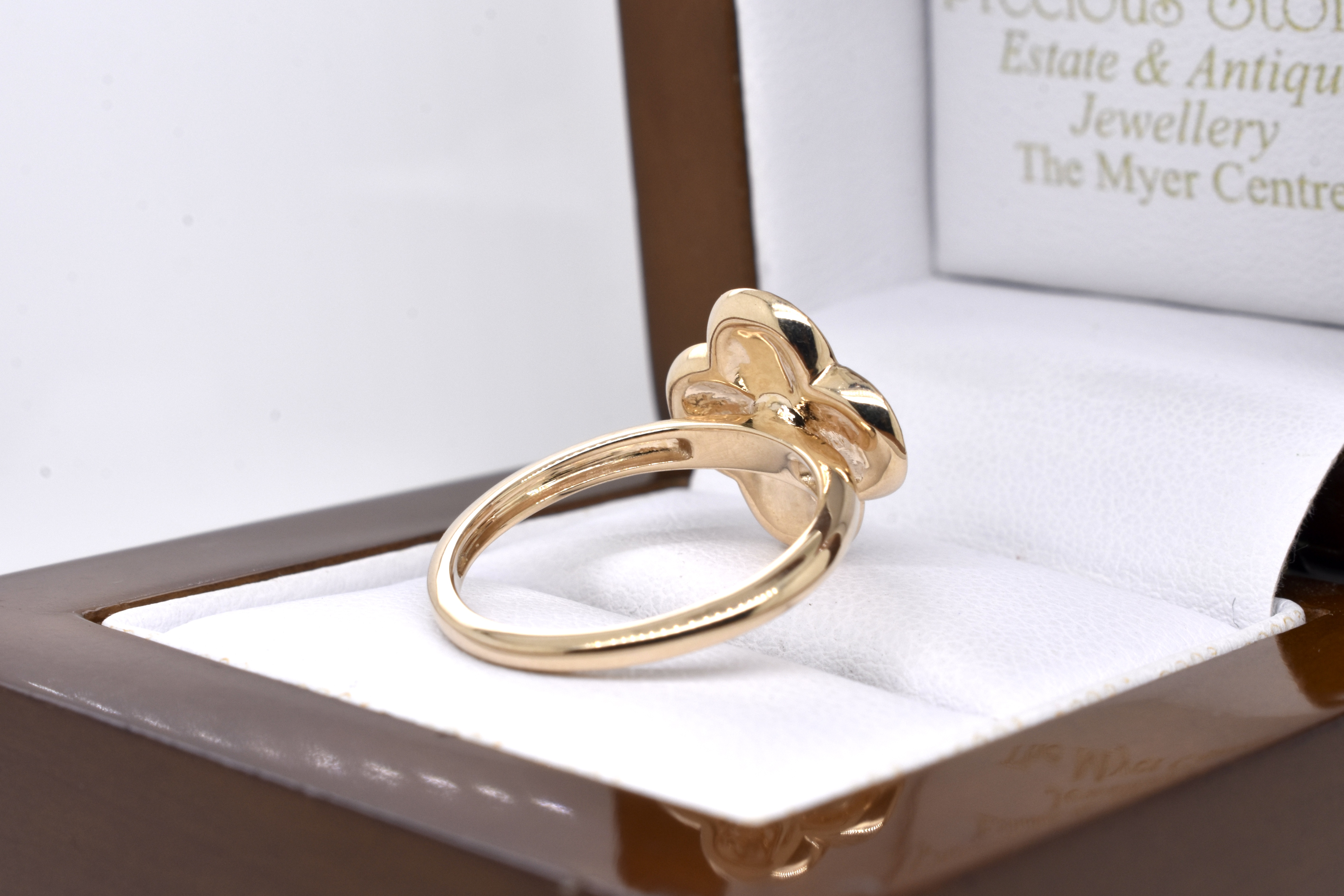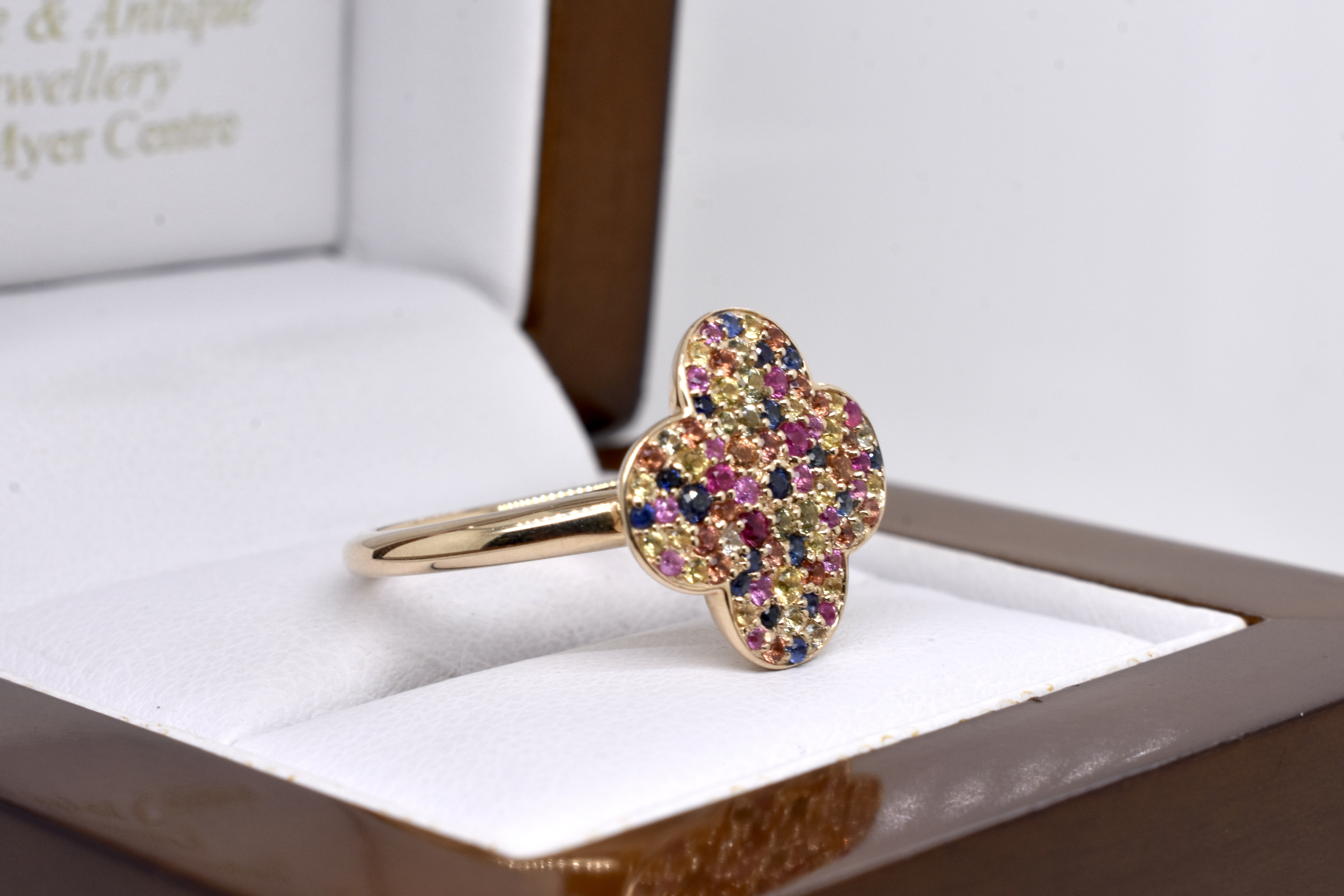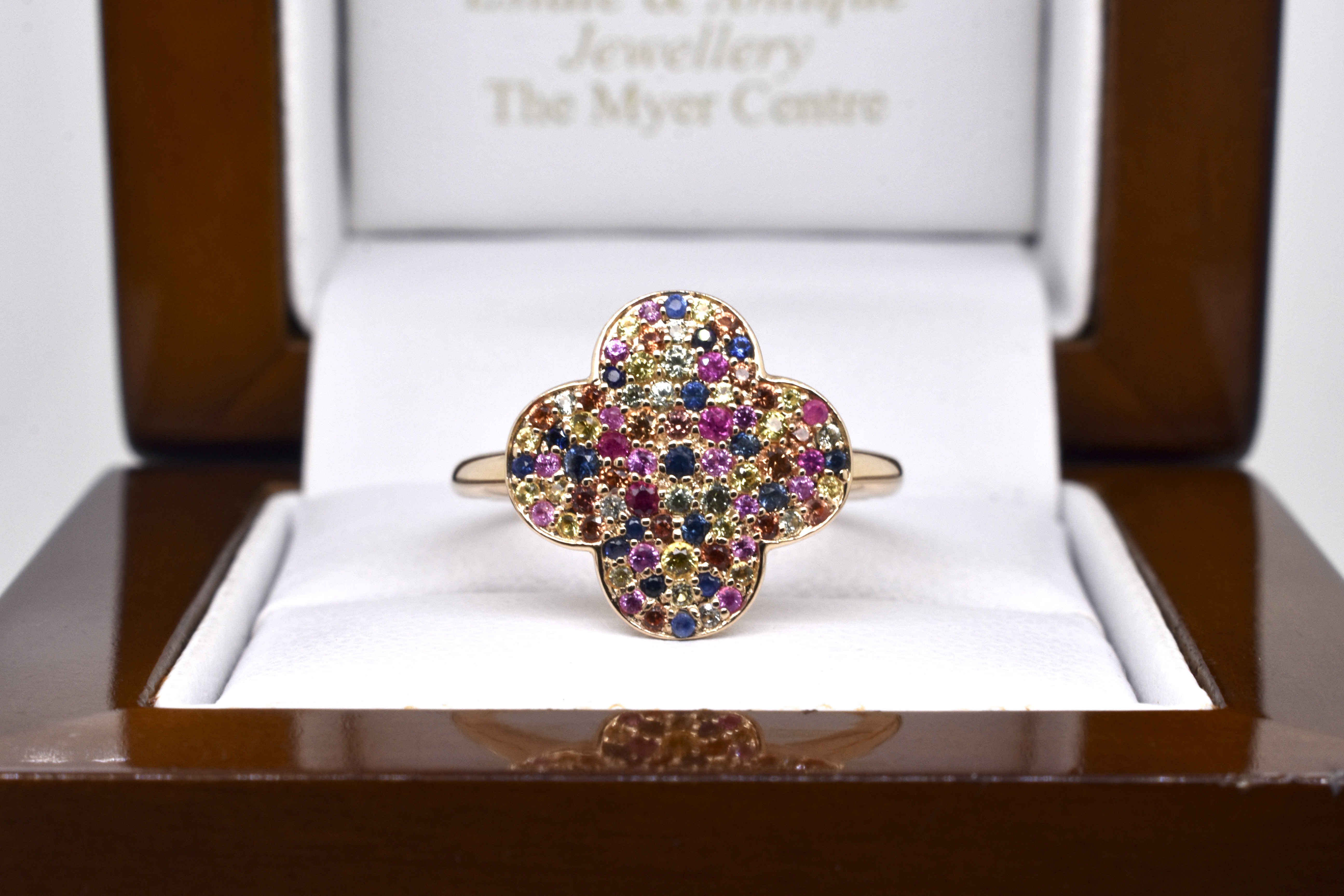 This charming and colourful ring is crafted from 9ct yellow gold, in a clover shape style and pave set with multicoloured natural sapphires in tones of orange, yellow, green, blue and pink. Clover measures approx. 15 x 15mm with 1.75ct of sapphires. Finger size N