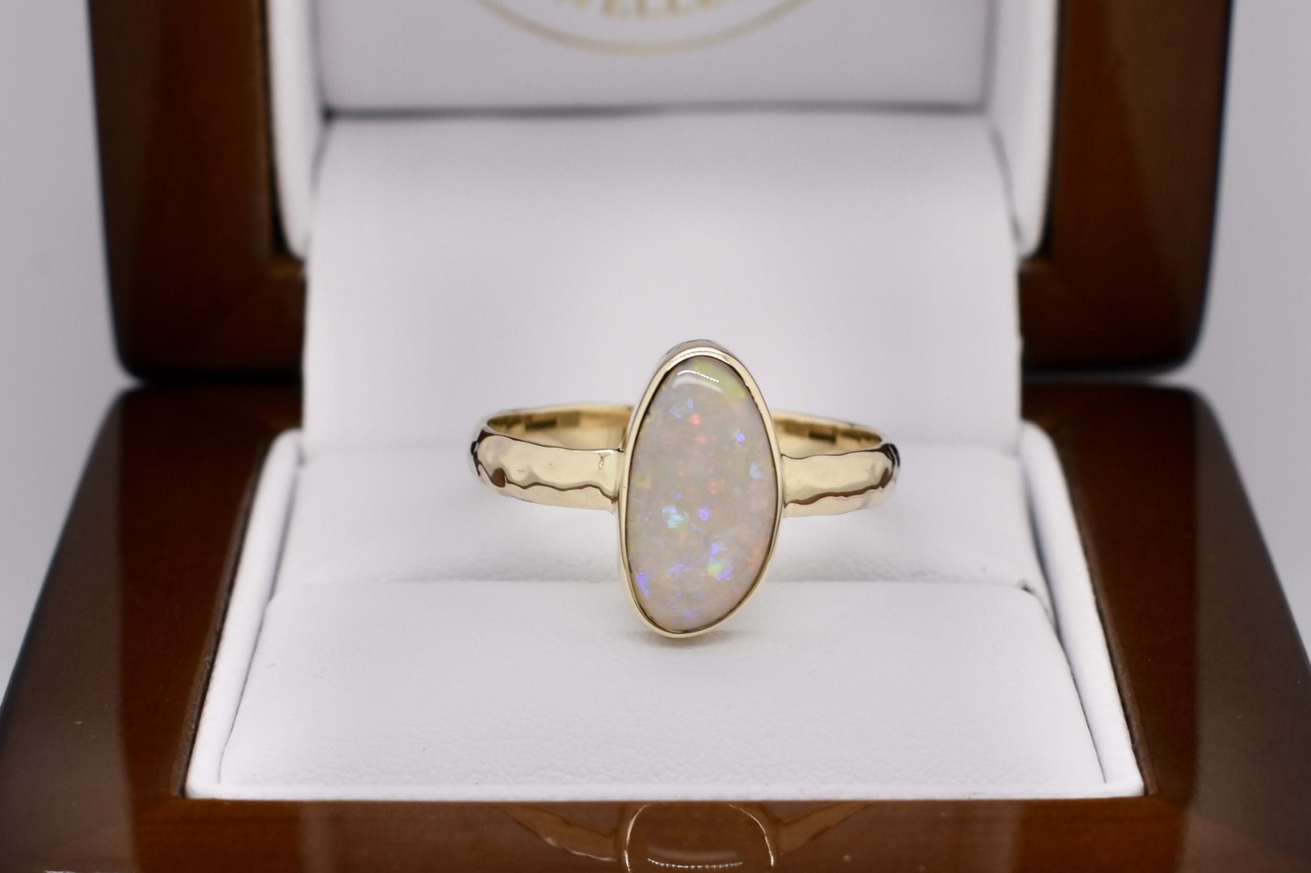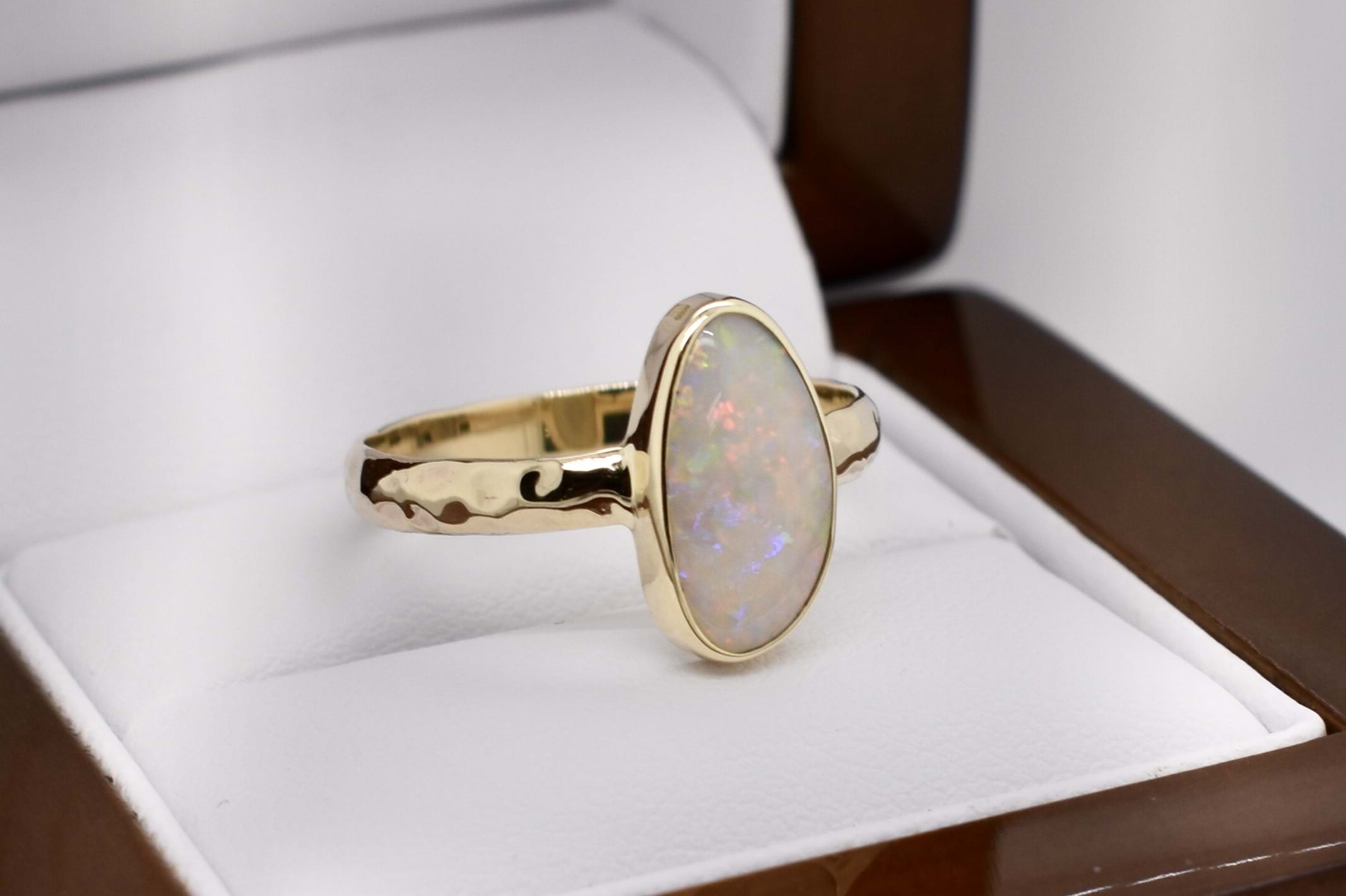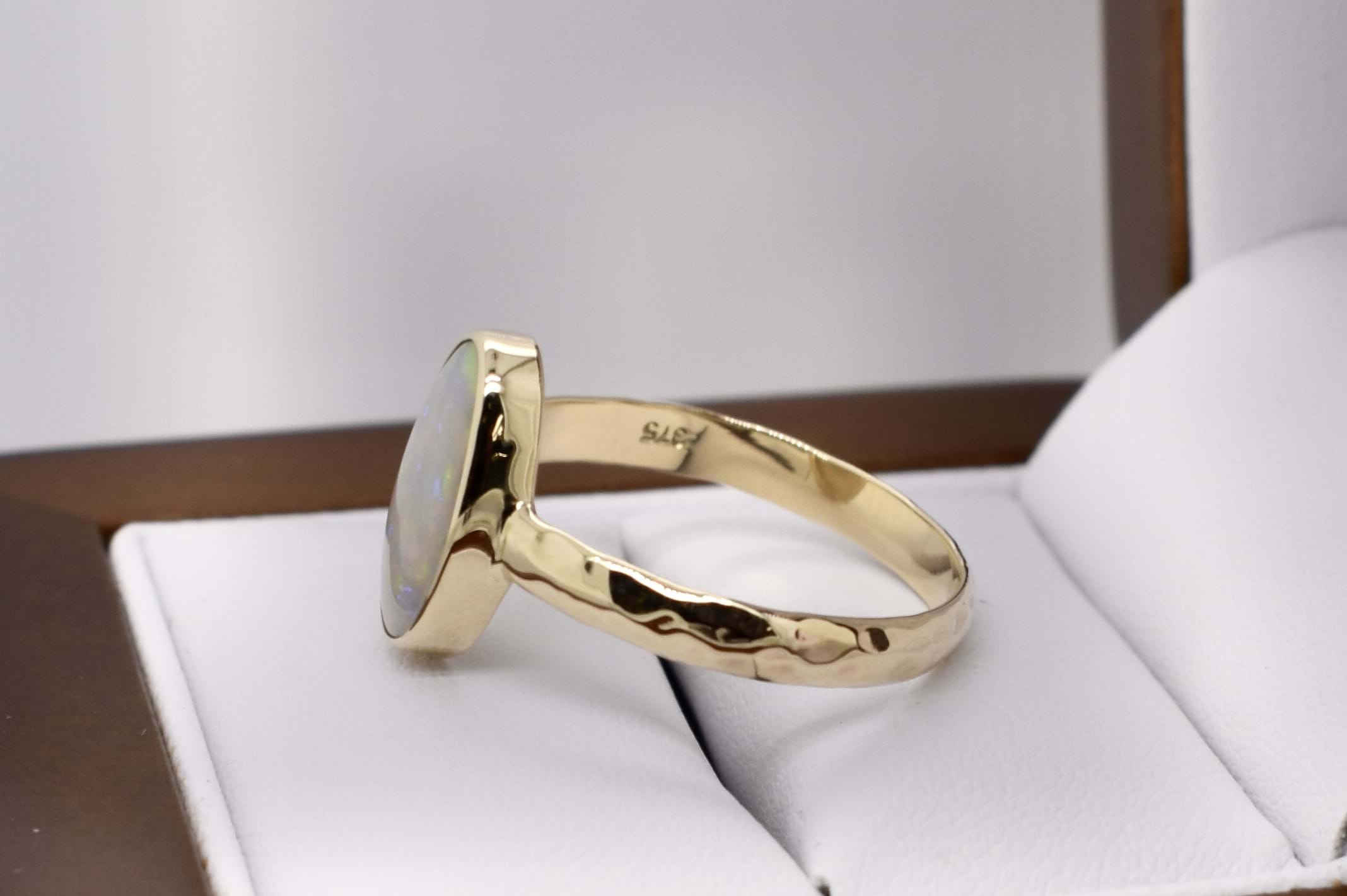 Beautiful solid 13.8x7.8mm Lightning Ridge opal ring, crafted in 9ct yellow gold. This opal is white and has flashes of red, yellow and blue throughout. It is bezel set with hammered detailing on the band. Finger size S.