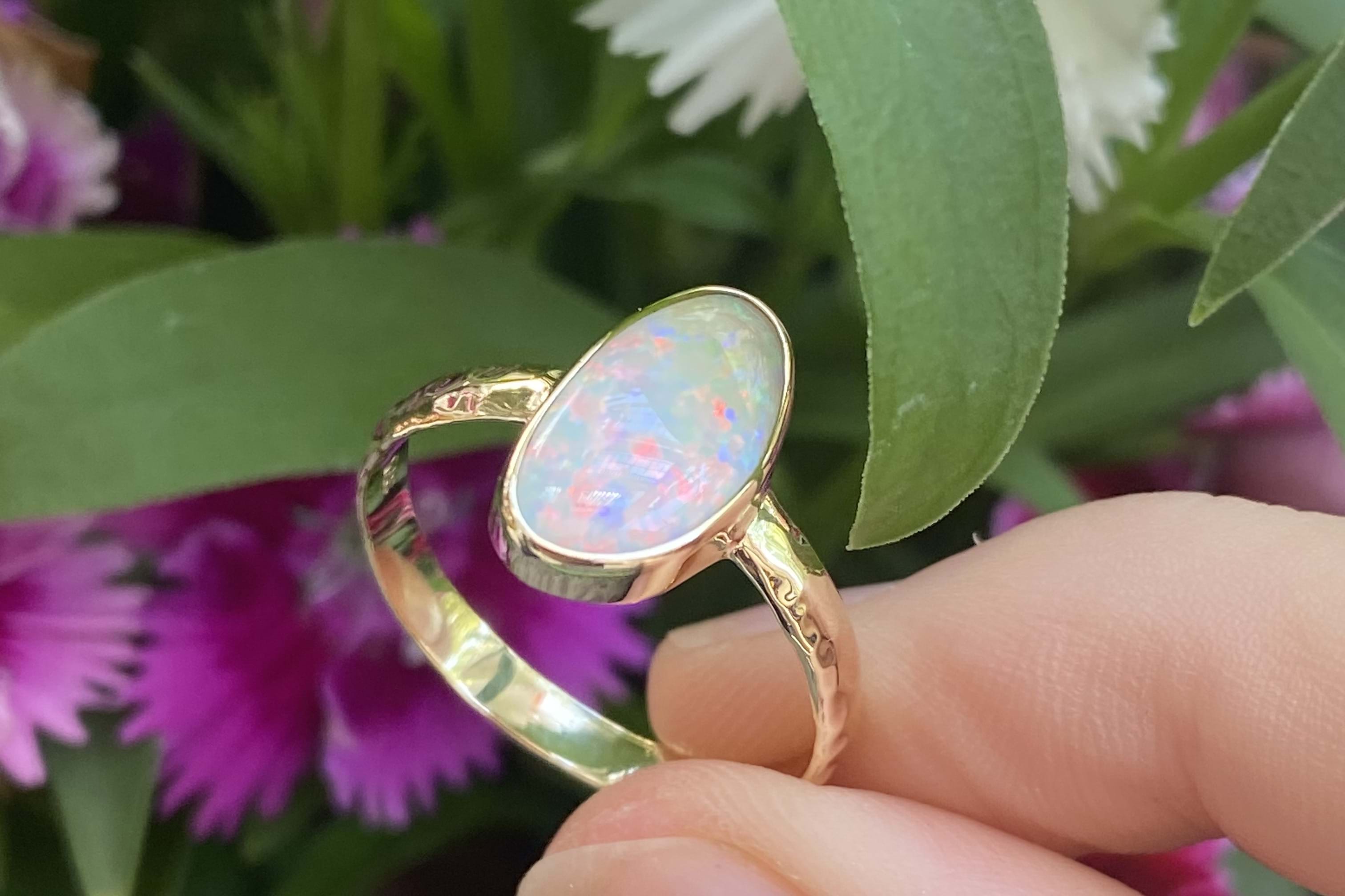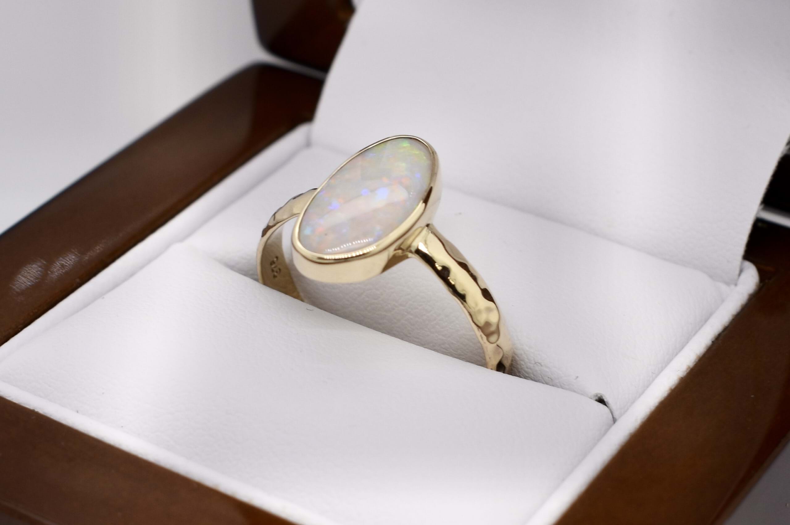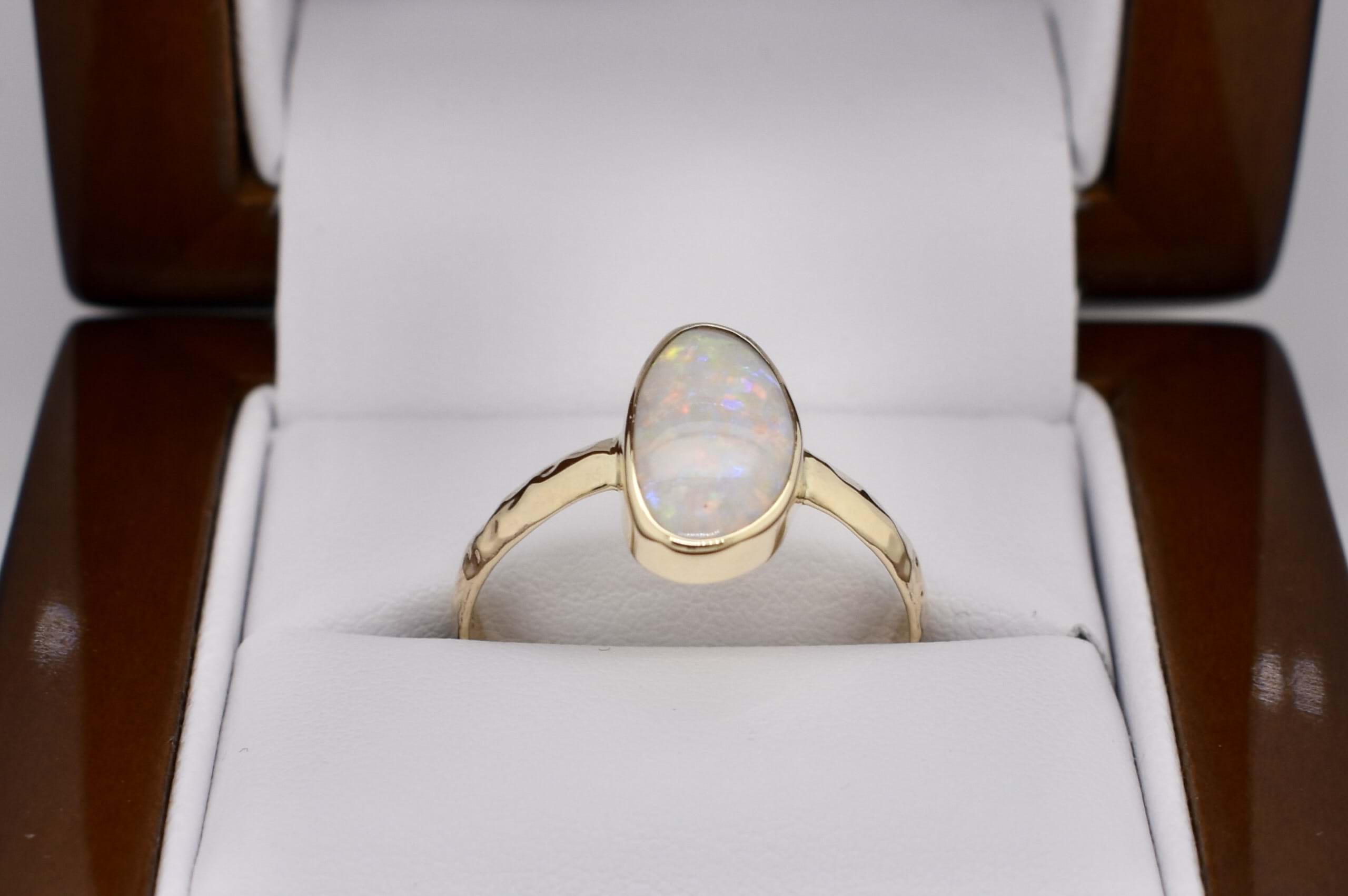 Beautiful solid 13.8x7.8mm Lightning Ridge opal ring, crafted in 9ct yellow gold. This opal is white and has flashes of red, yellow and blue throughout. It is bezel set with hammered detailing on the band. Finger size S.