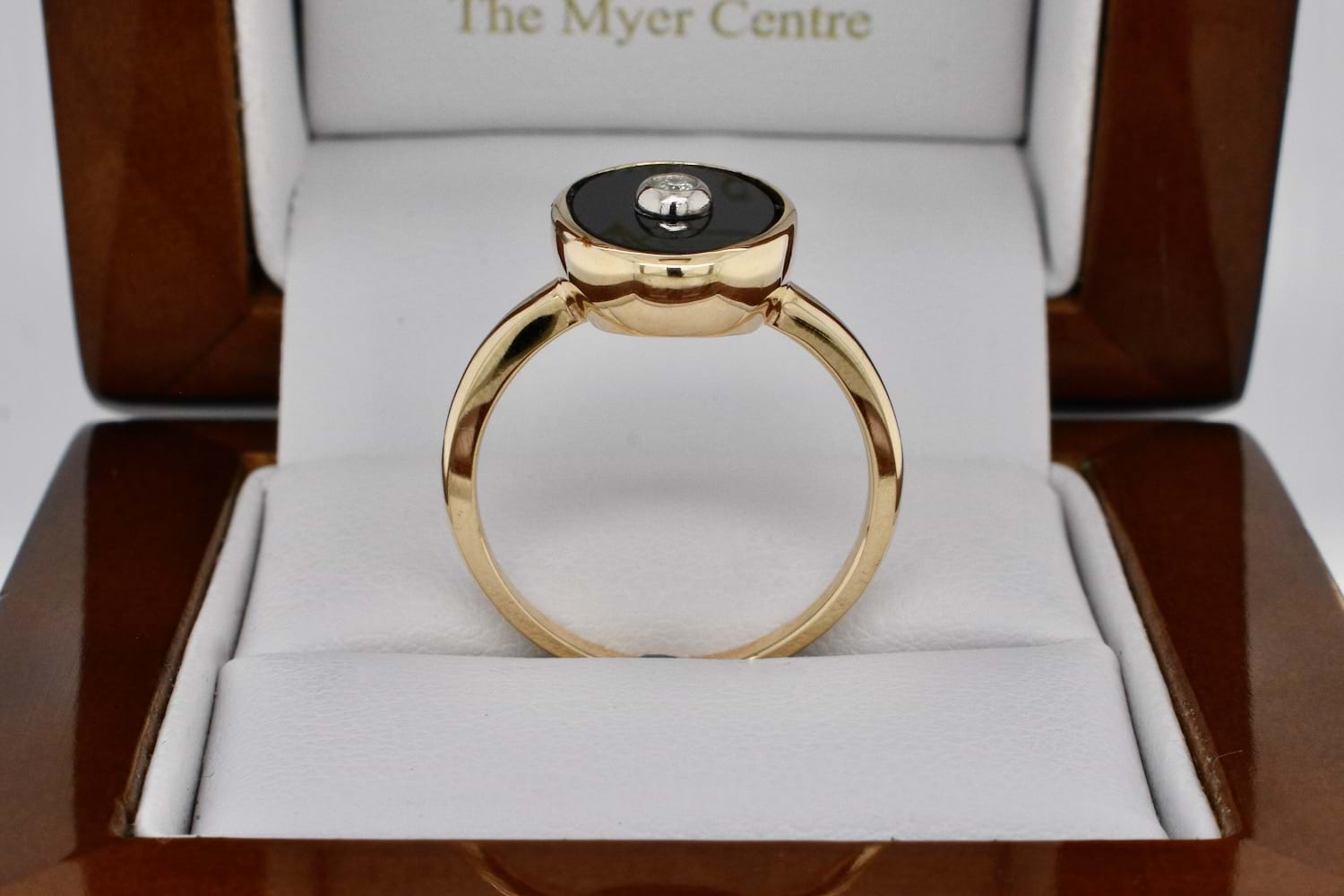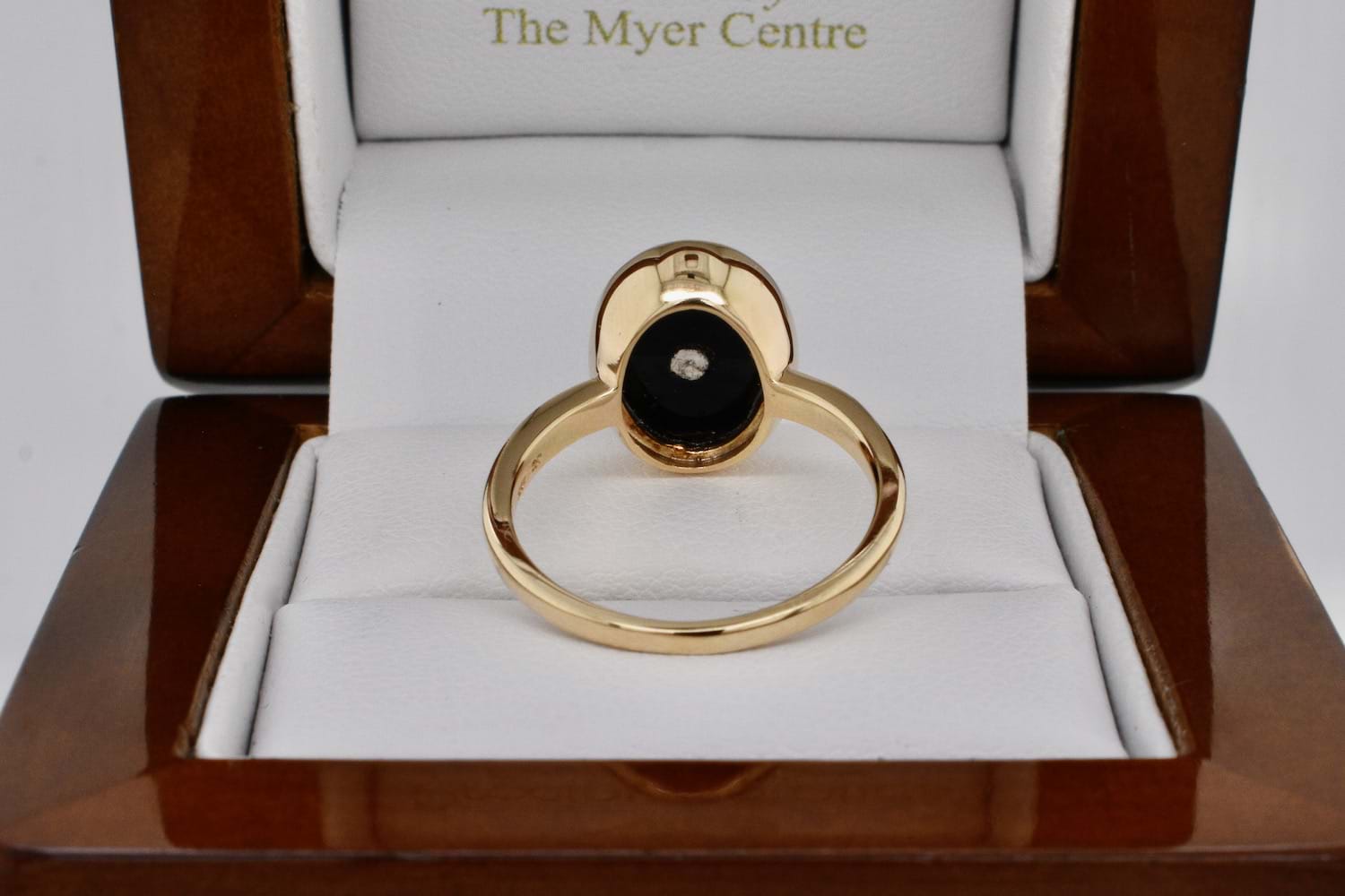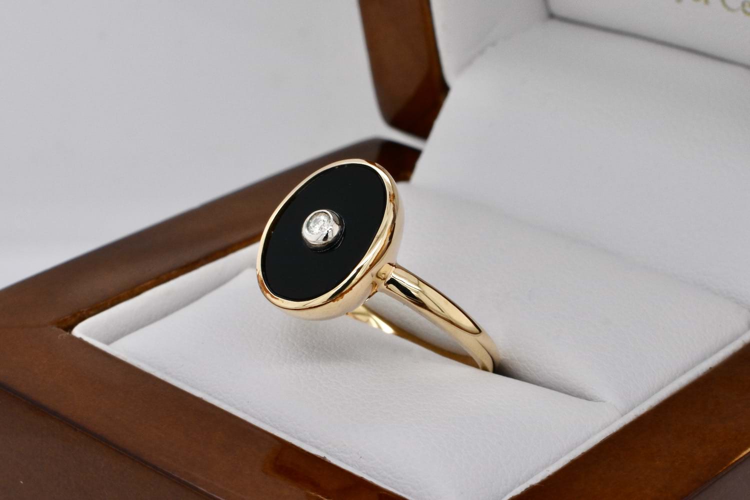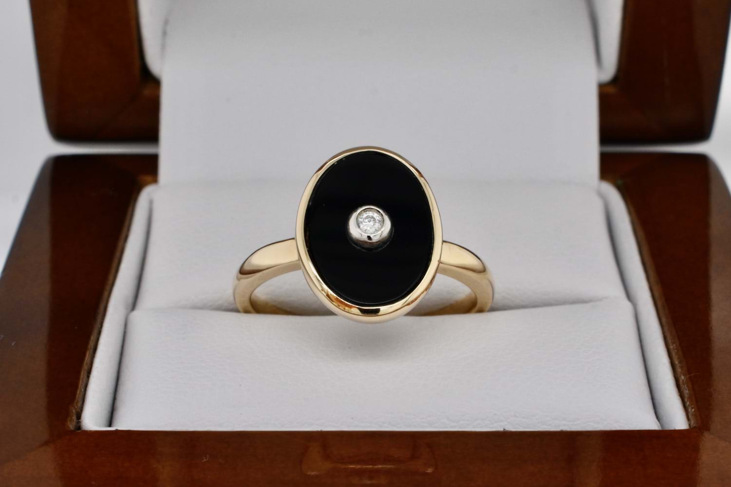 A 9ct yellow gold simple and classic ring featuring an oval panel of black onyx in a yellow gold bezel with a shimmering white diamond, white gold bezel set, in the centre on a plain band. Ring top measures approx 13.7x10mm. Finger size N