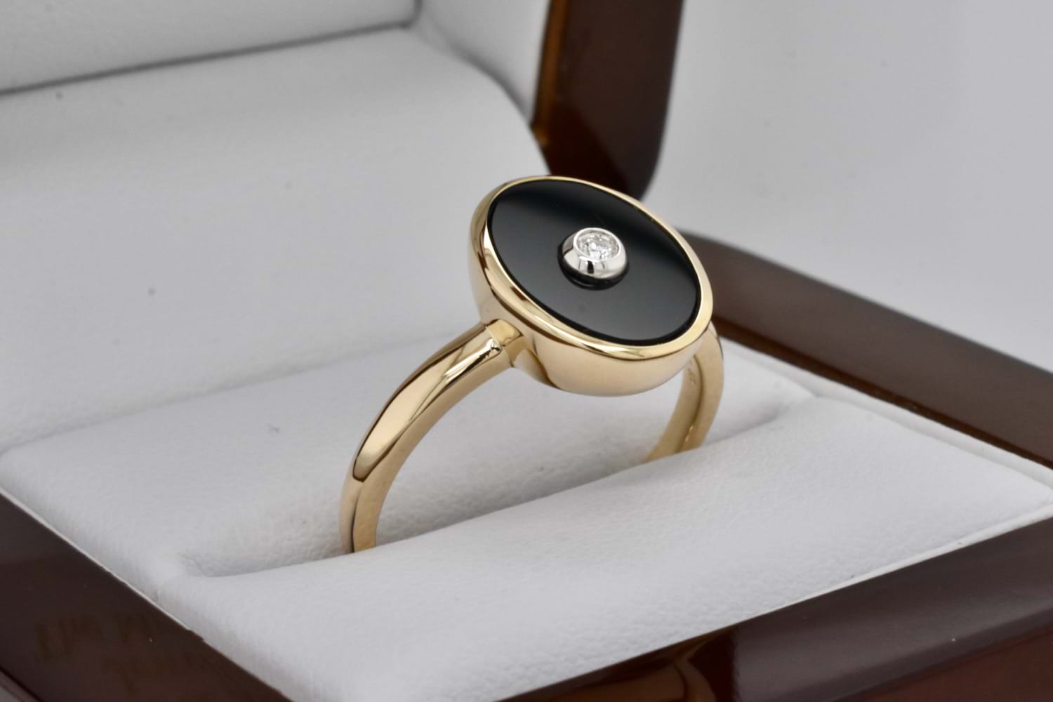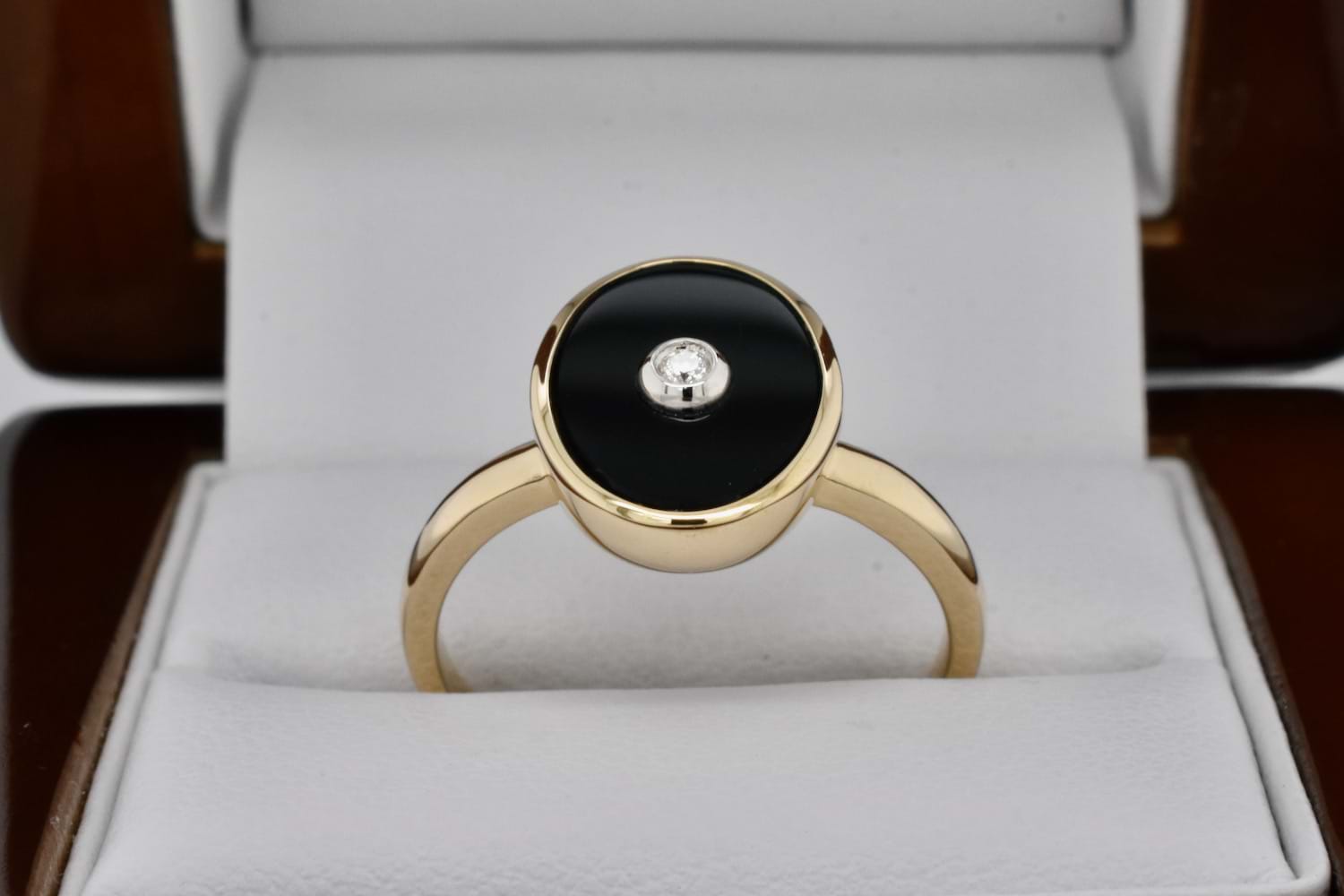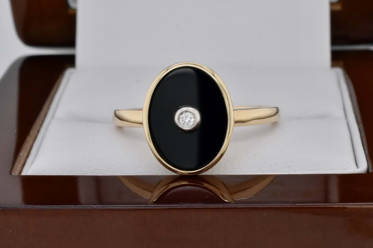 Simple and timeless 9ct yellow gold dress ring featuring oval onyx bezel set with a white gold bezel set round diamond in the centre and plain band. Finger size R