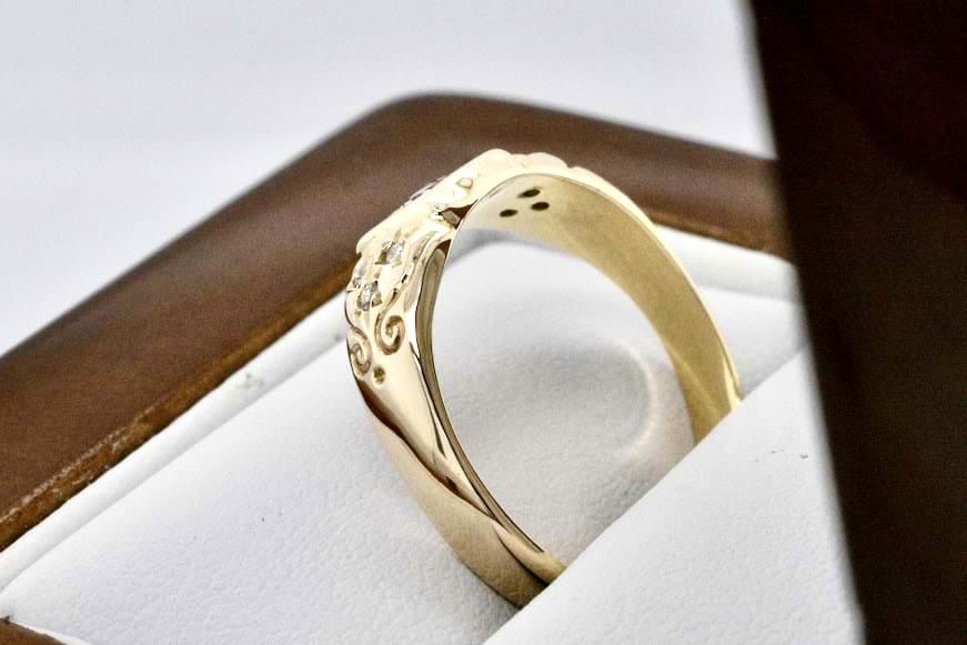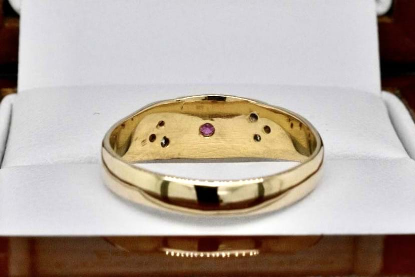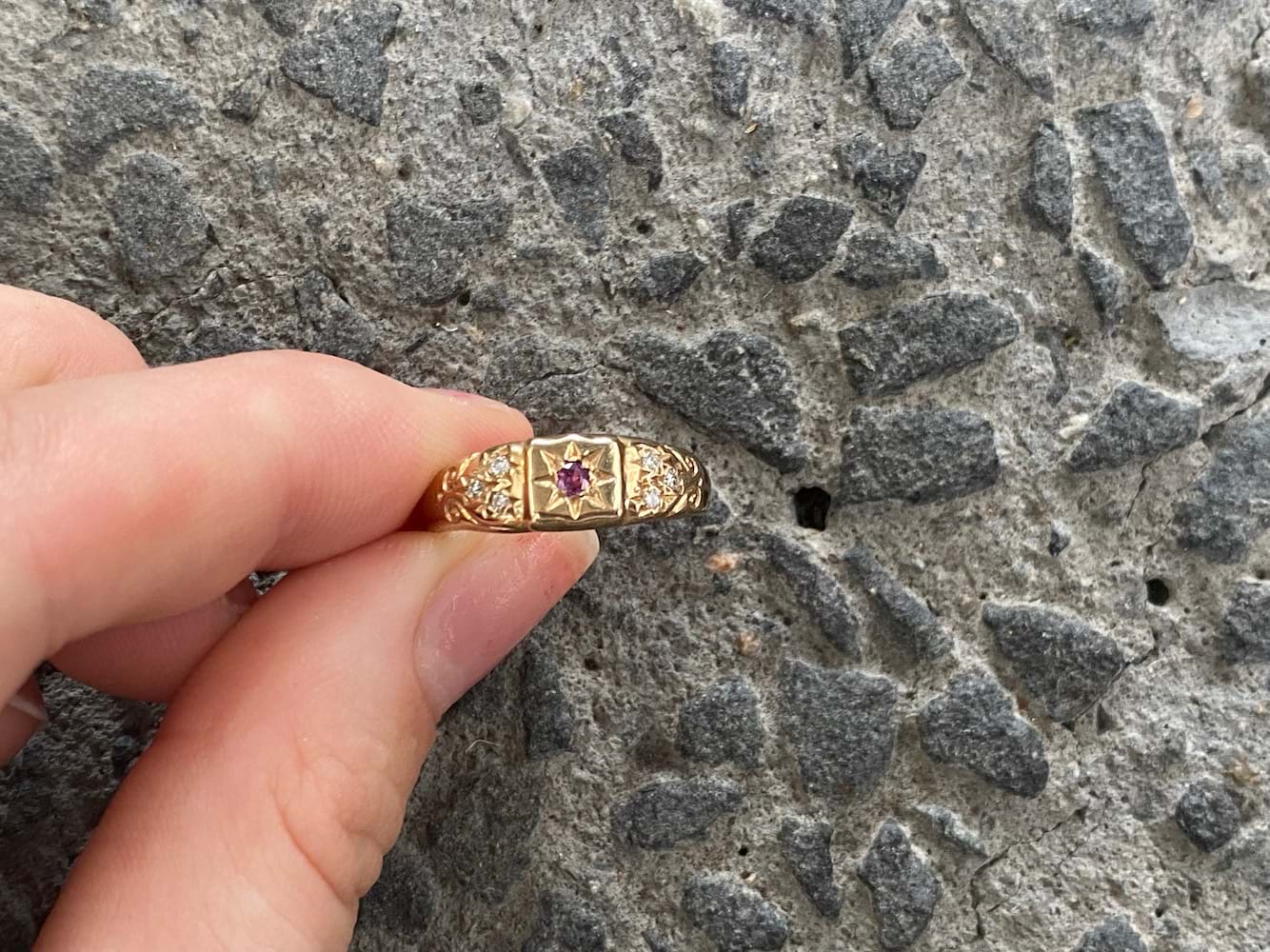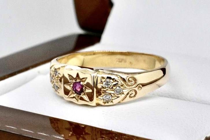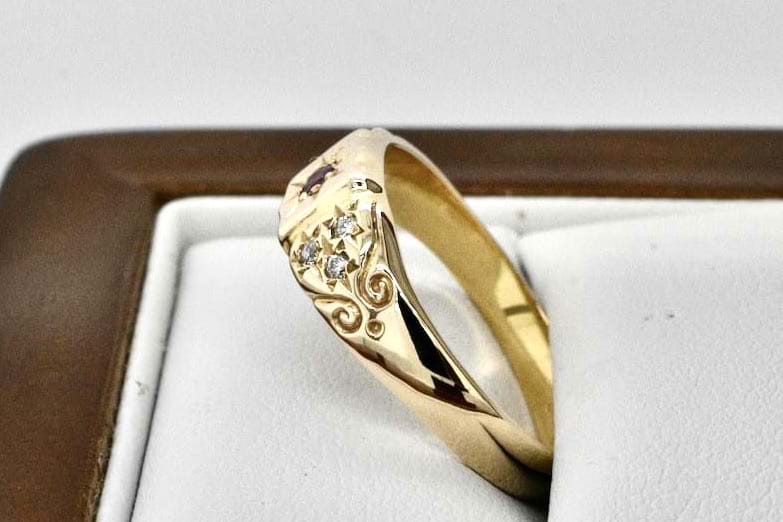A stunning antique inspired gypsy ring made in 9ct yellow gold, star set with a 2.2mm round pinkish-purple ruby with three white round diamonds also star set either side with beautiful scroll detailing. The flat band measures approximately 6.2mm wide. Finger size P+