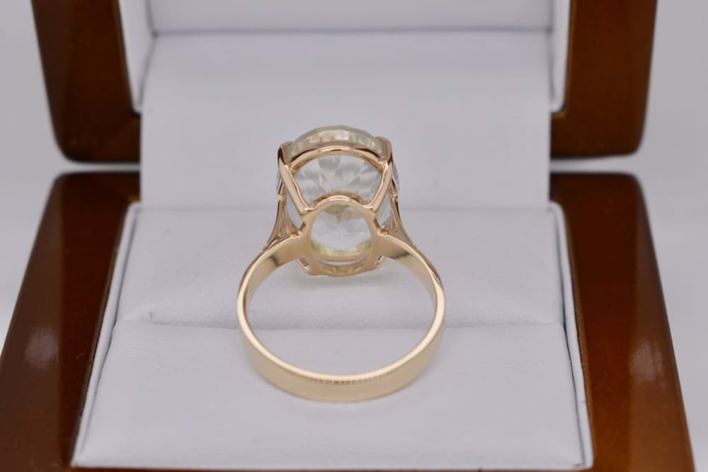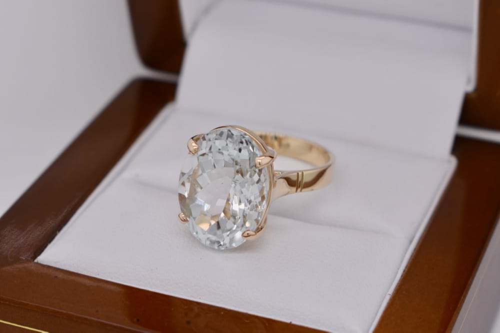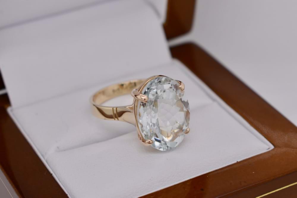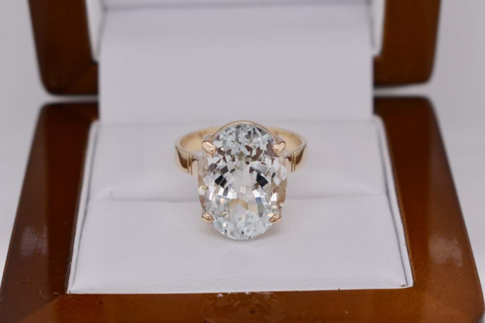 9ct yellow gold handmade ring featuring one sparkling faceted, oval, unheated topaz in four claw setting. Stone measures 16x10mm. Finger size M