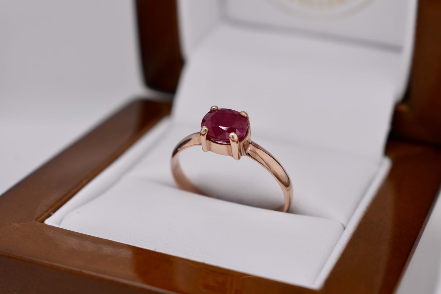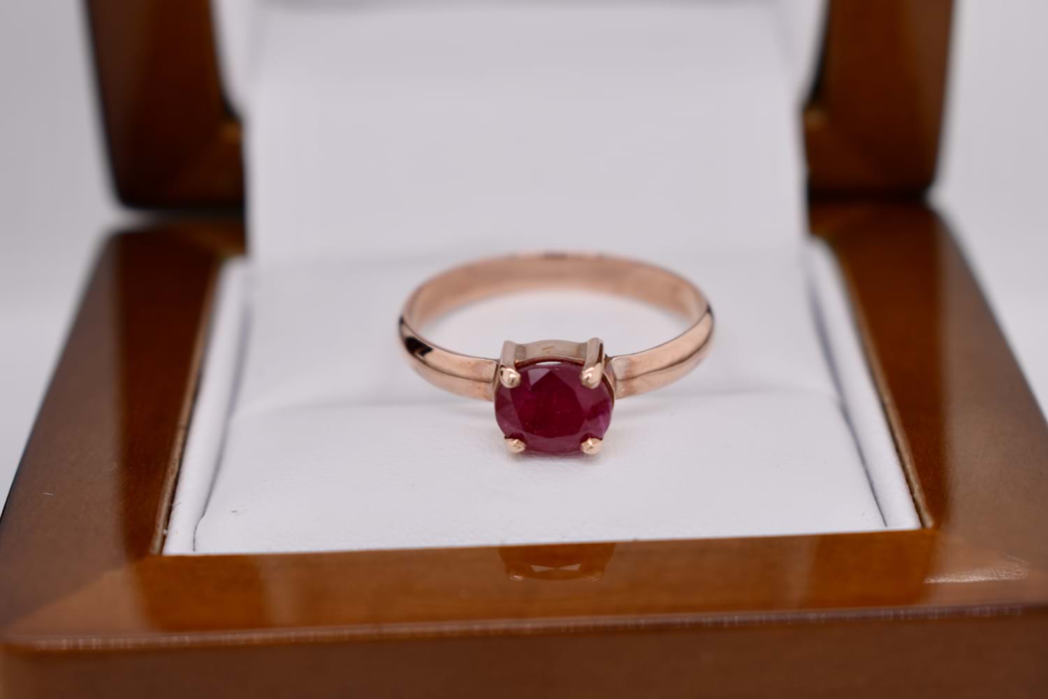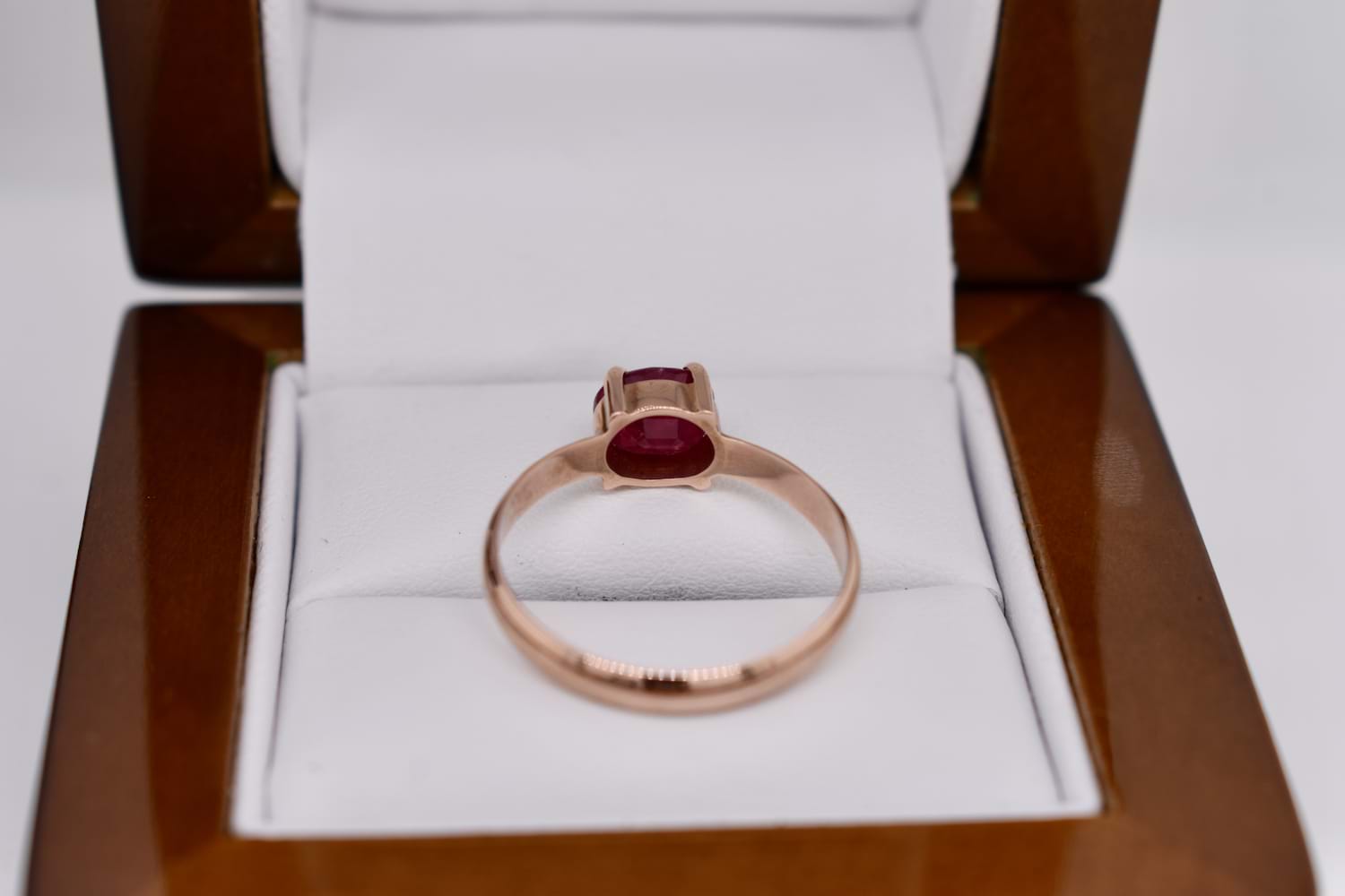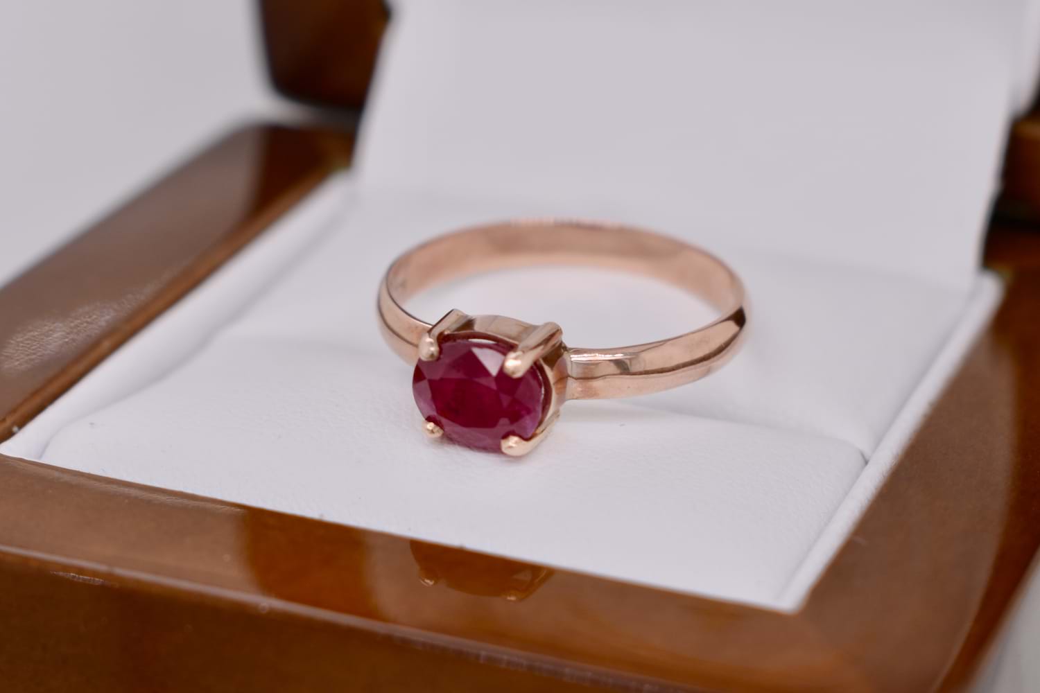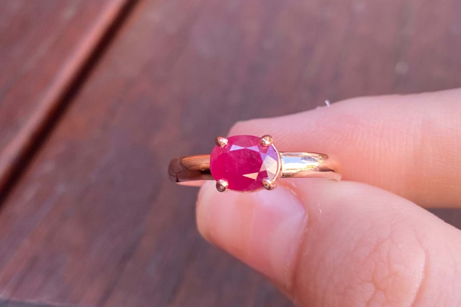 This pretty ring is handmade in 9ct rose gold, set with an oval shape pink ruby measuring approx. 7 x 6mm, east/west set in four claws with plain band. Finger size Q