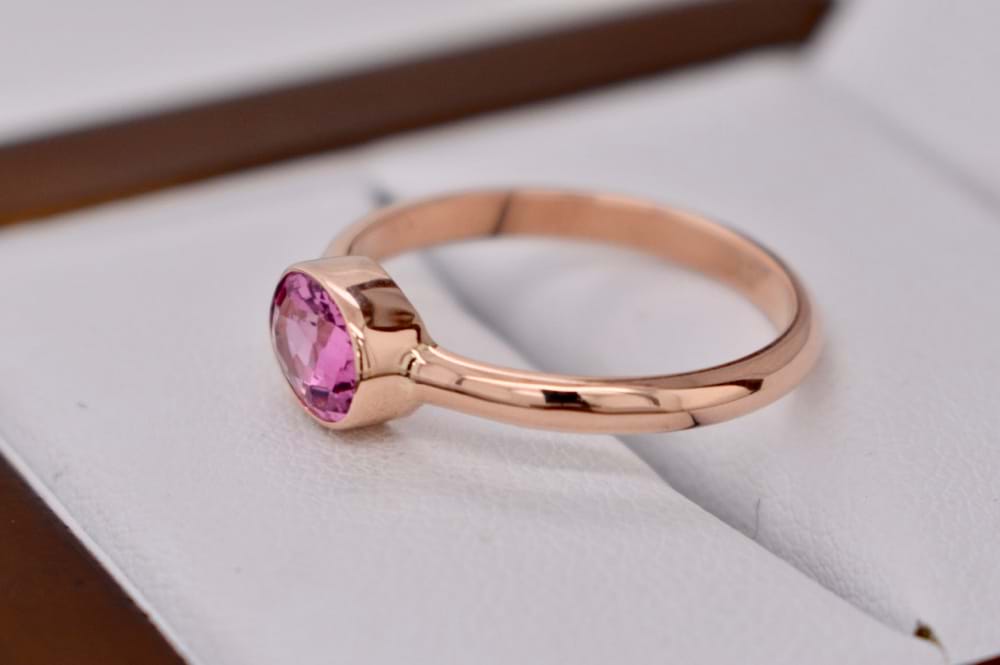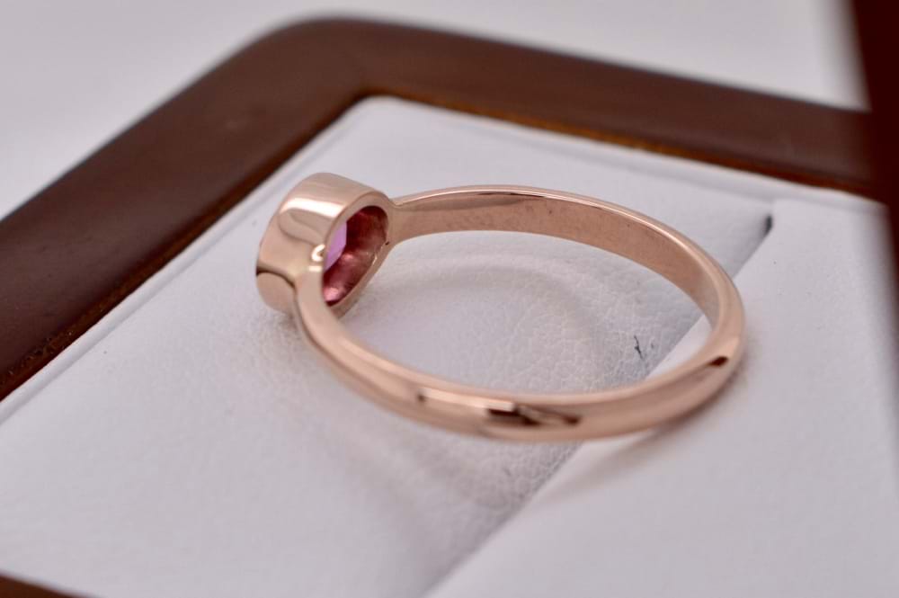A stunning, bright, candy pink tourmaline faceted into an oval measuring approximately 7x6mm set into a handmade 9ct rose gold bezel setting.