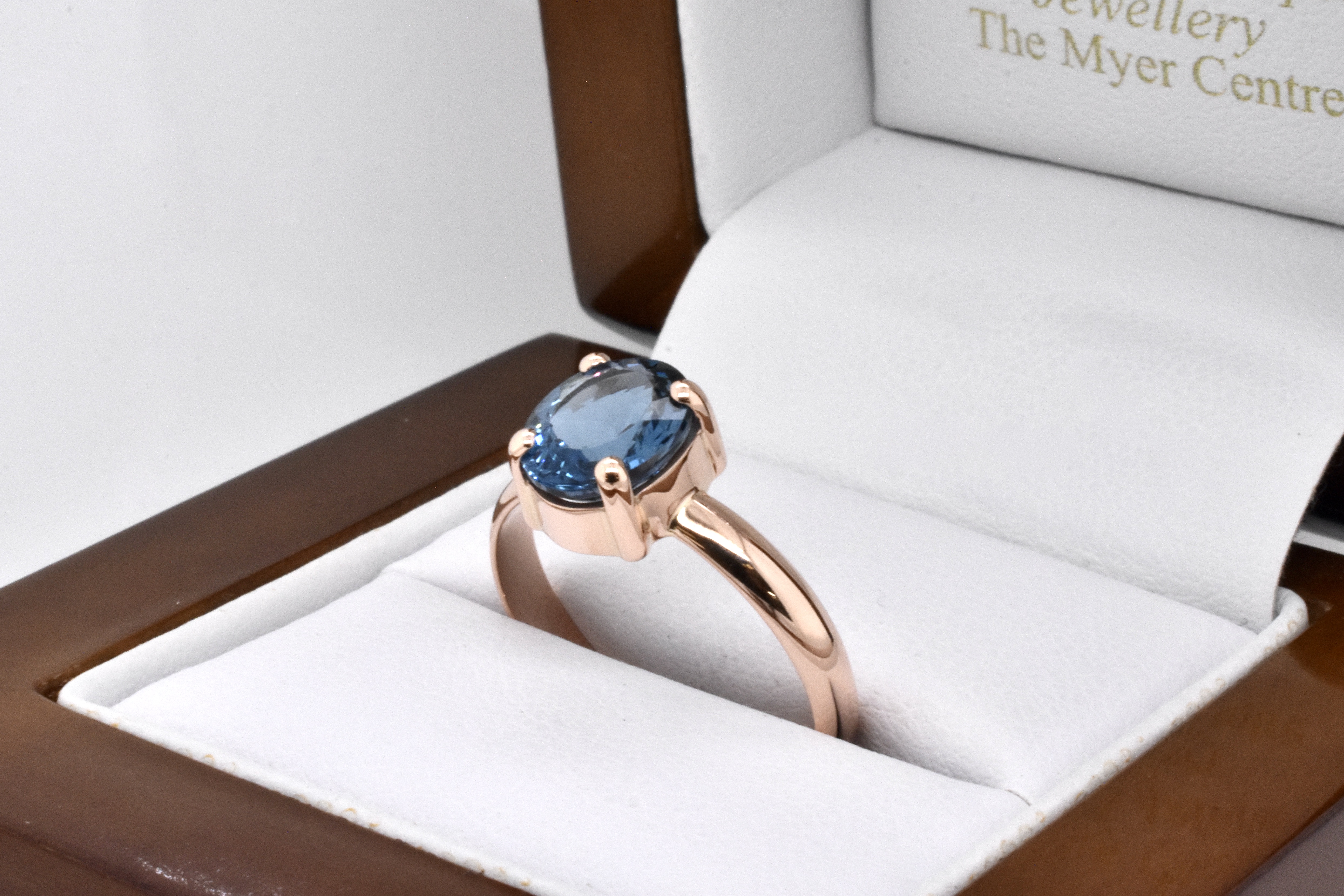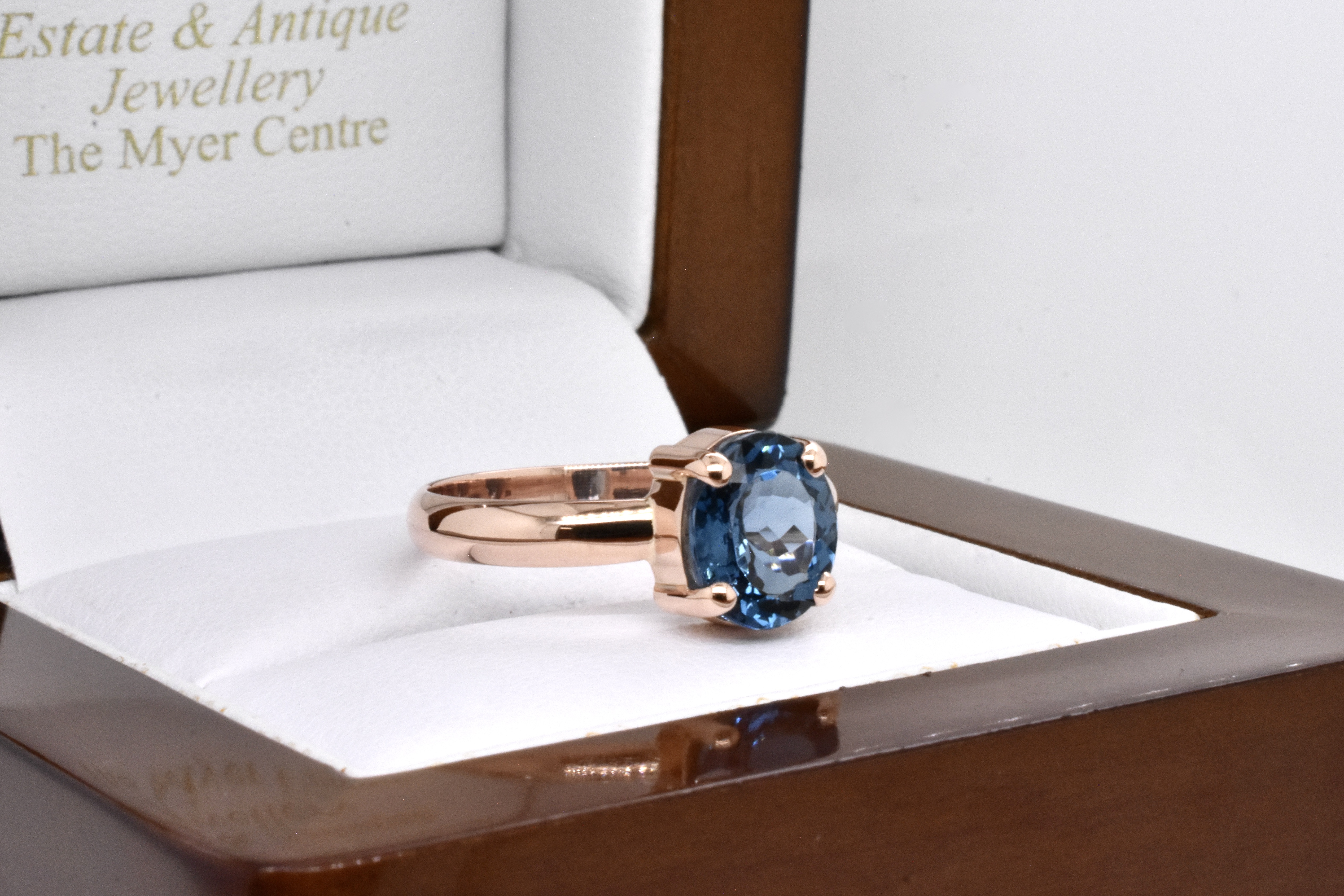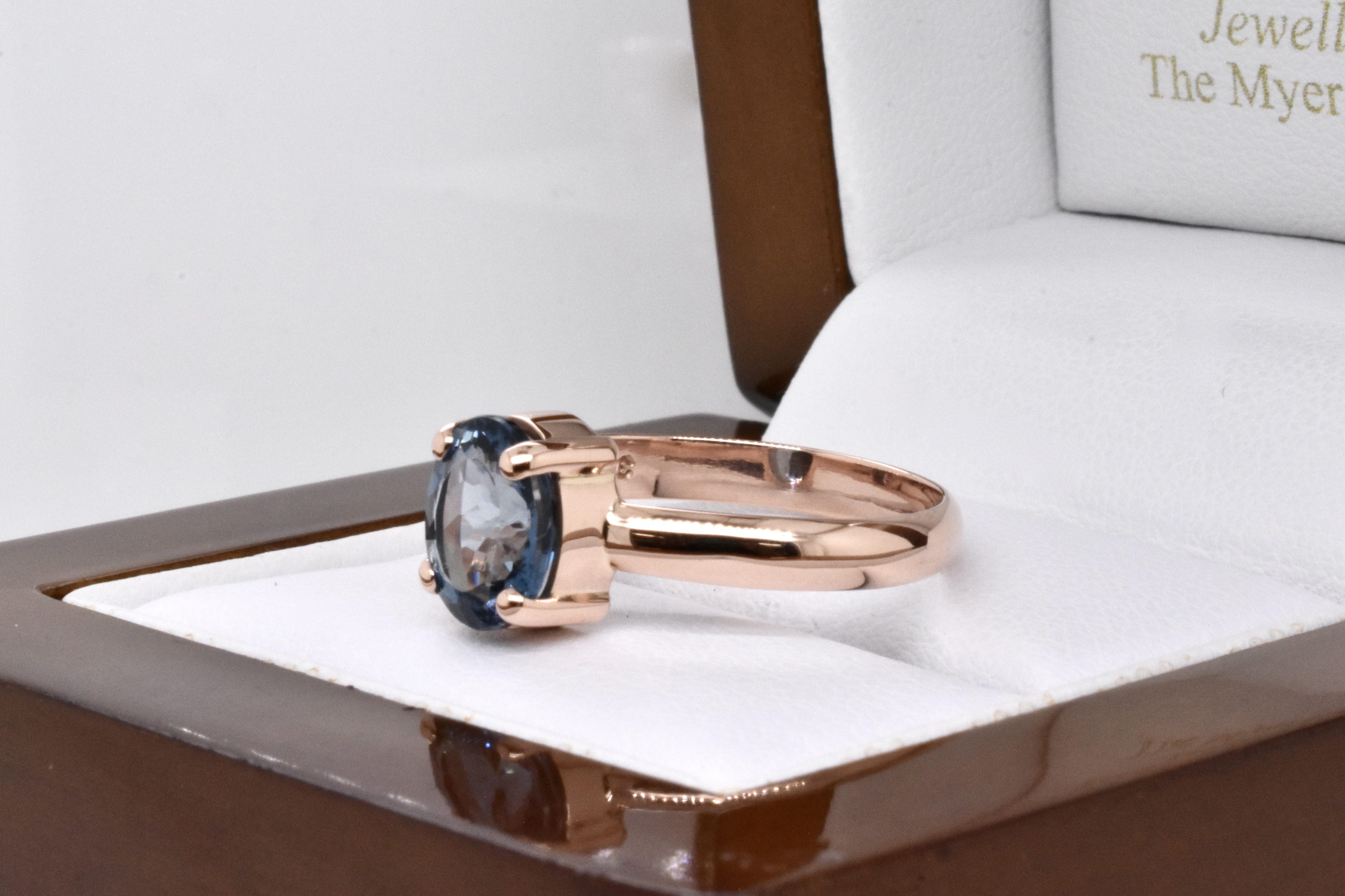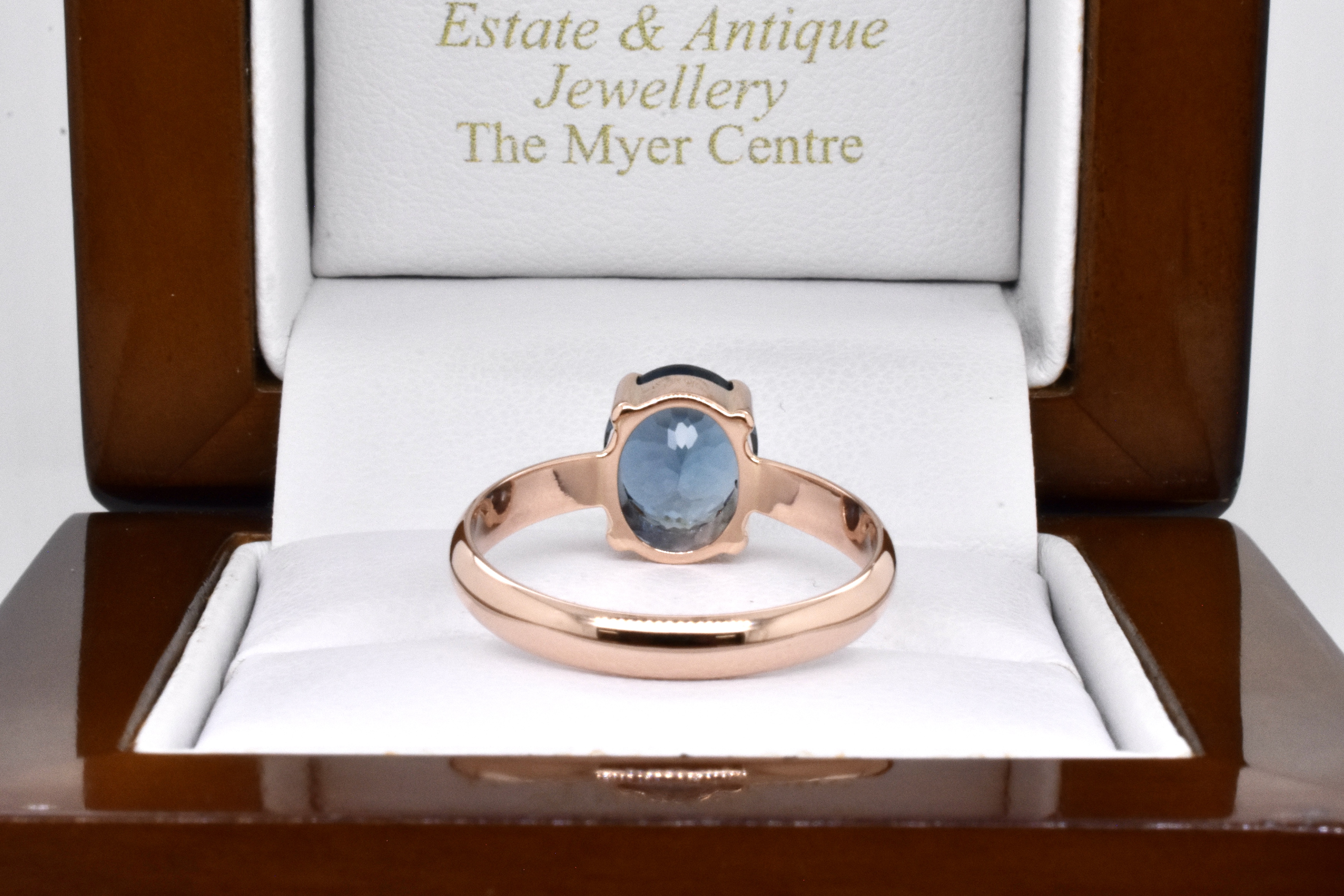 A simple and contemporary ring, handmade in 9ct rose gold and set with an approx. 9 x 7.5mm oval London blue topaz, 4 claw set with a plain band. Finger size P