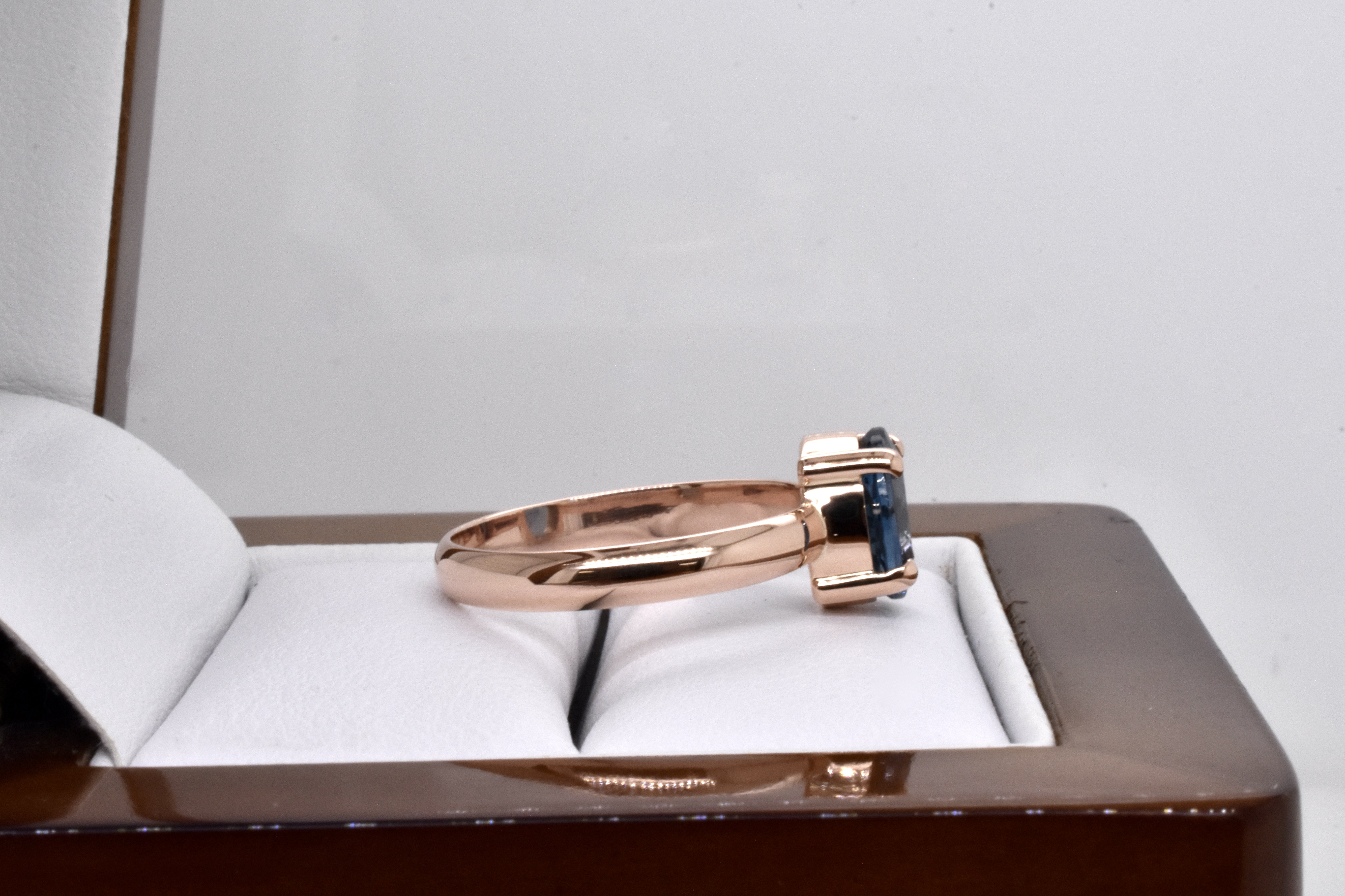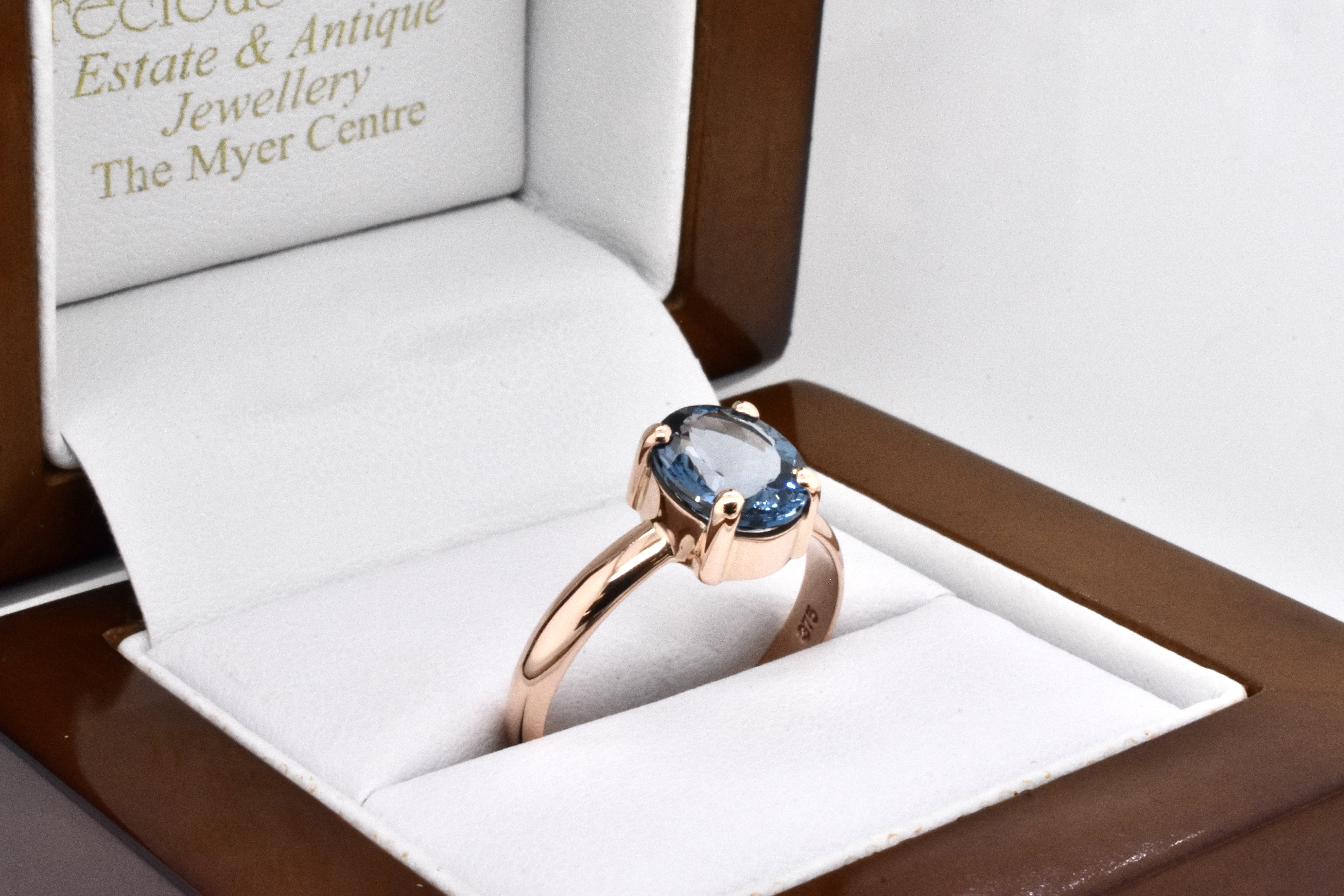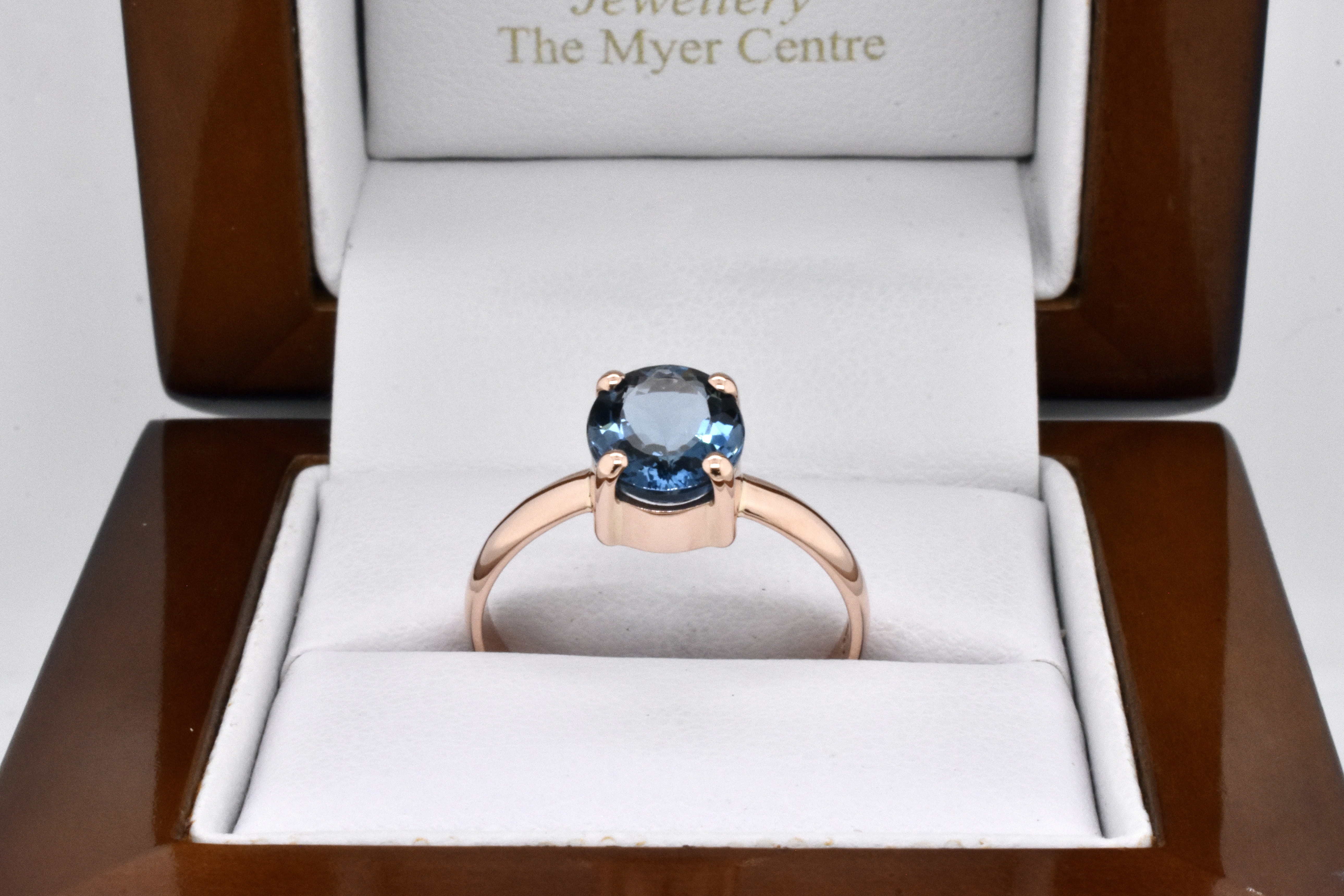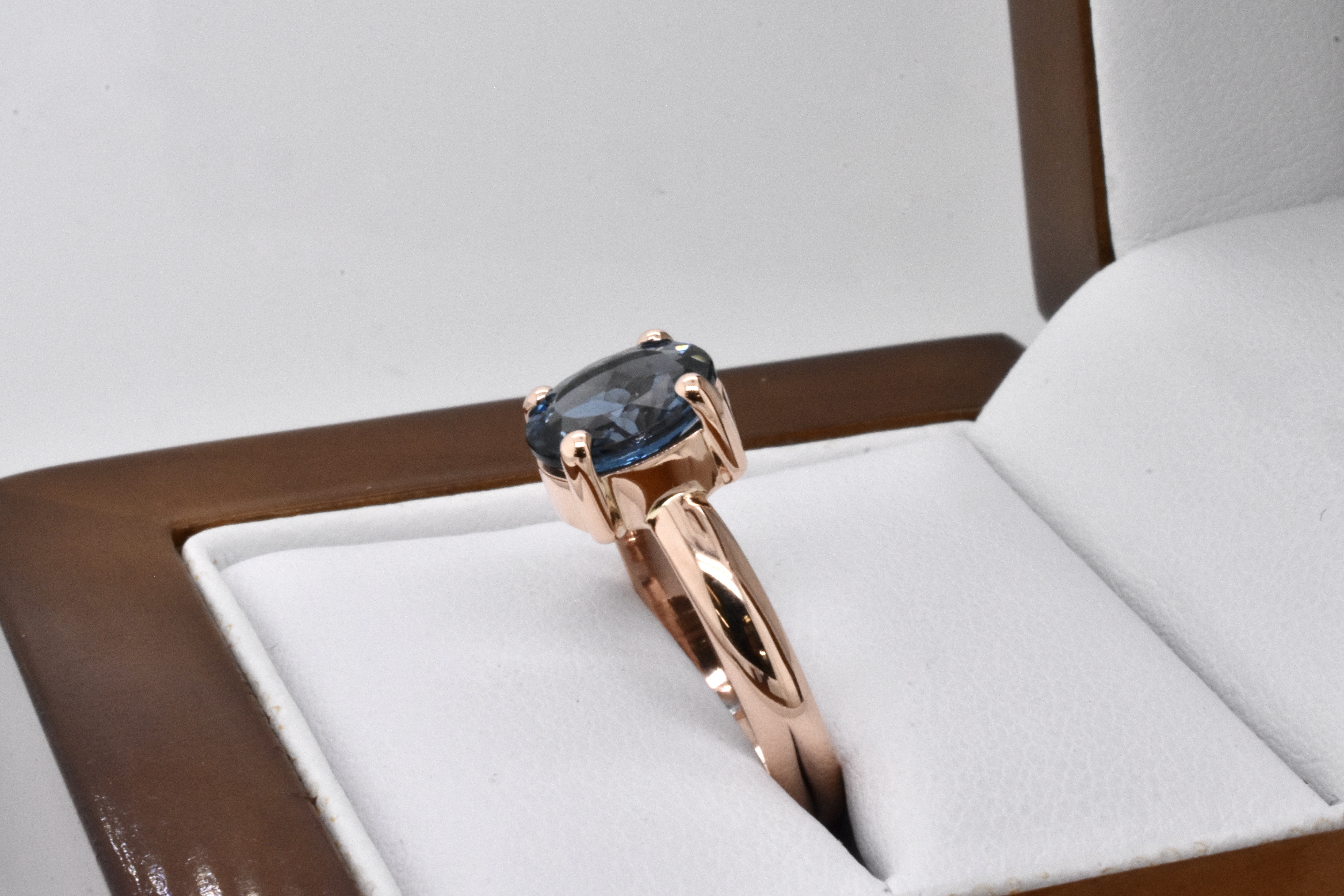 A simple and contemporary ring, handmade in 9ct rose gold and set with an approx. 9 x 7.5mm oval London blue topaz, 4 claw set with a plain band. Finger size P