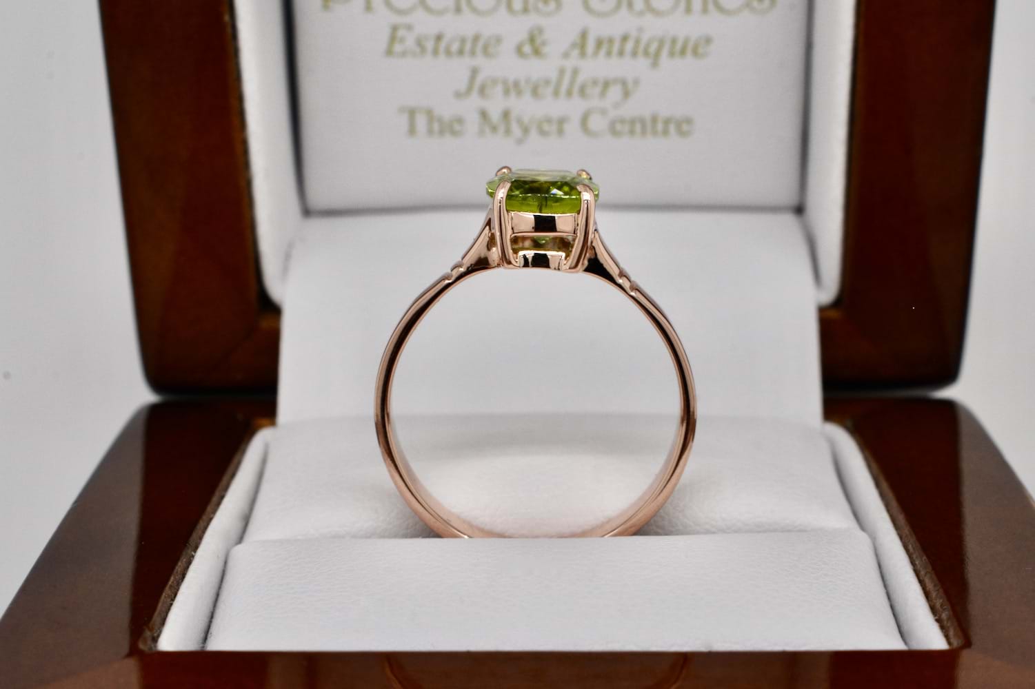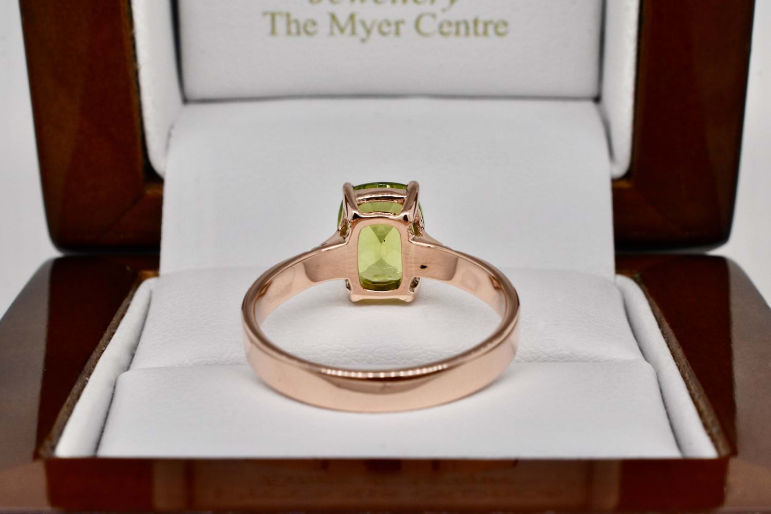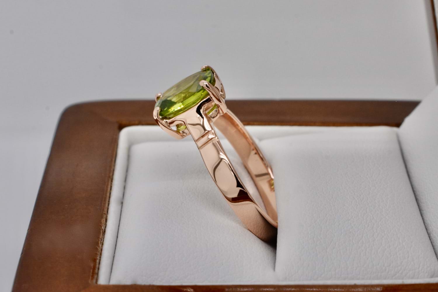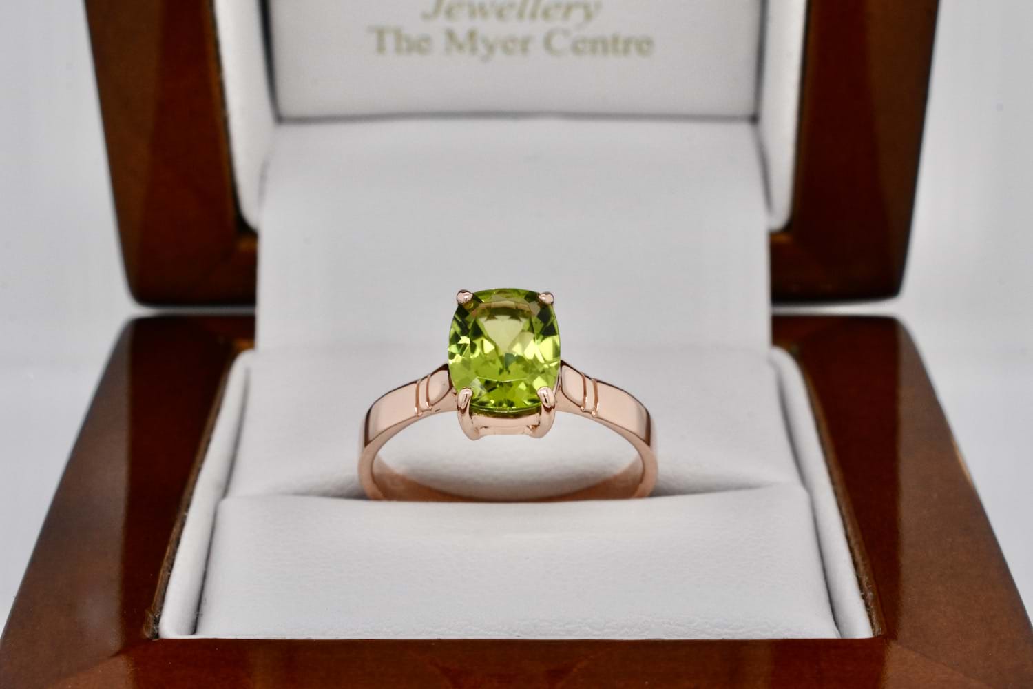 Handmade 9ct rose gold ring featuring a four claw set cushion shape peridot measuring approx. 9x7mm with a plain, flat, band. Finger size O+