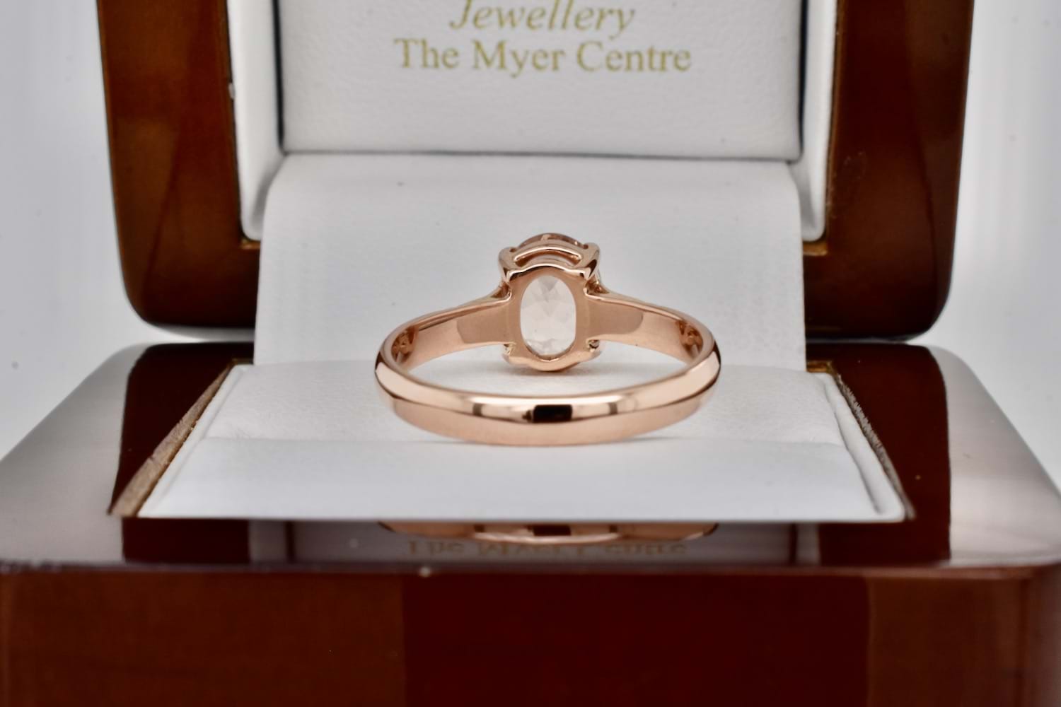 Stunning and timeless ring handcrafted in 9ct rose gold featuring a blush peach oval morganite measuring approx. 9x7mm four claw set with a plain flat band profile. Finger size R