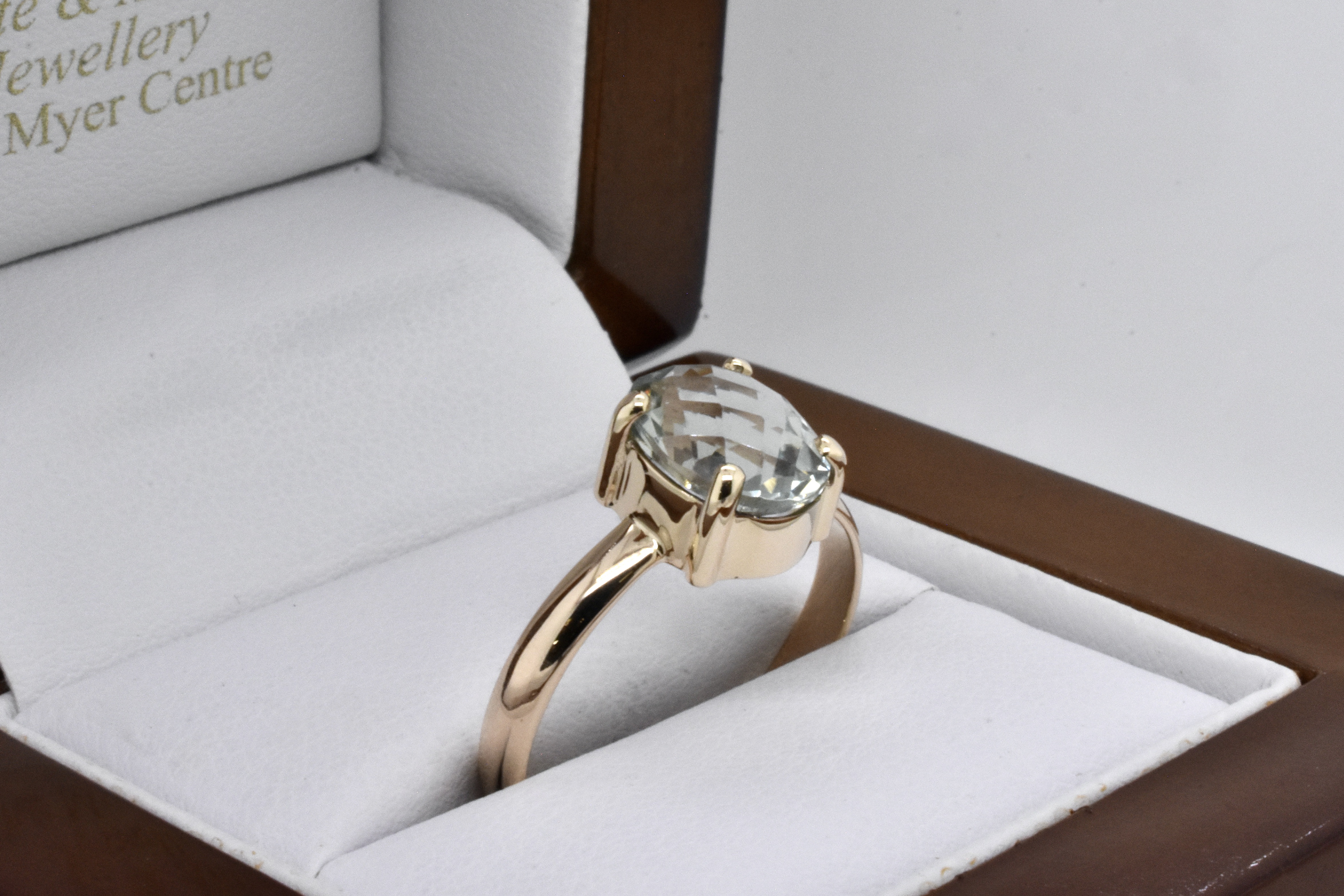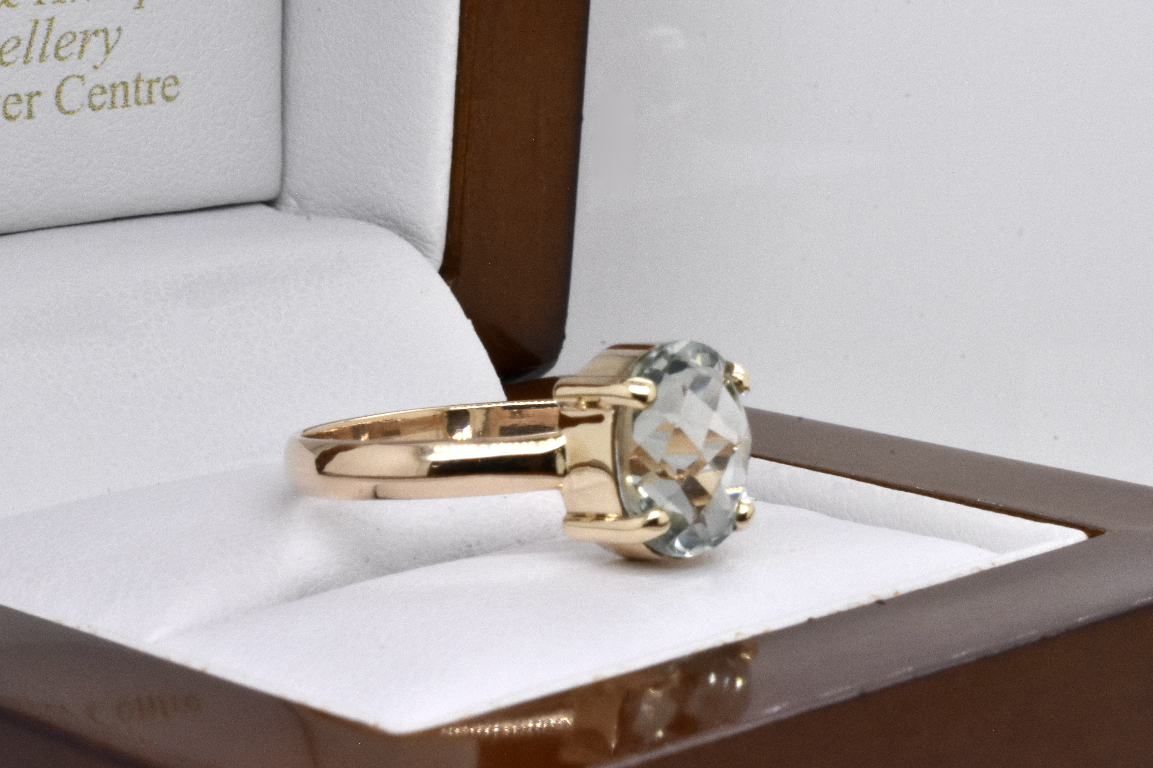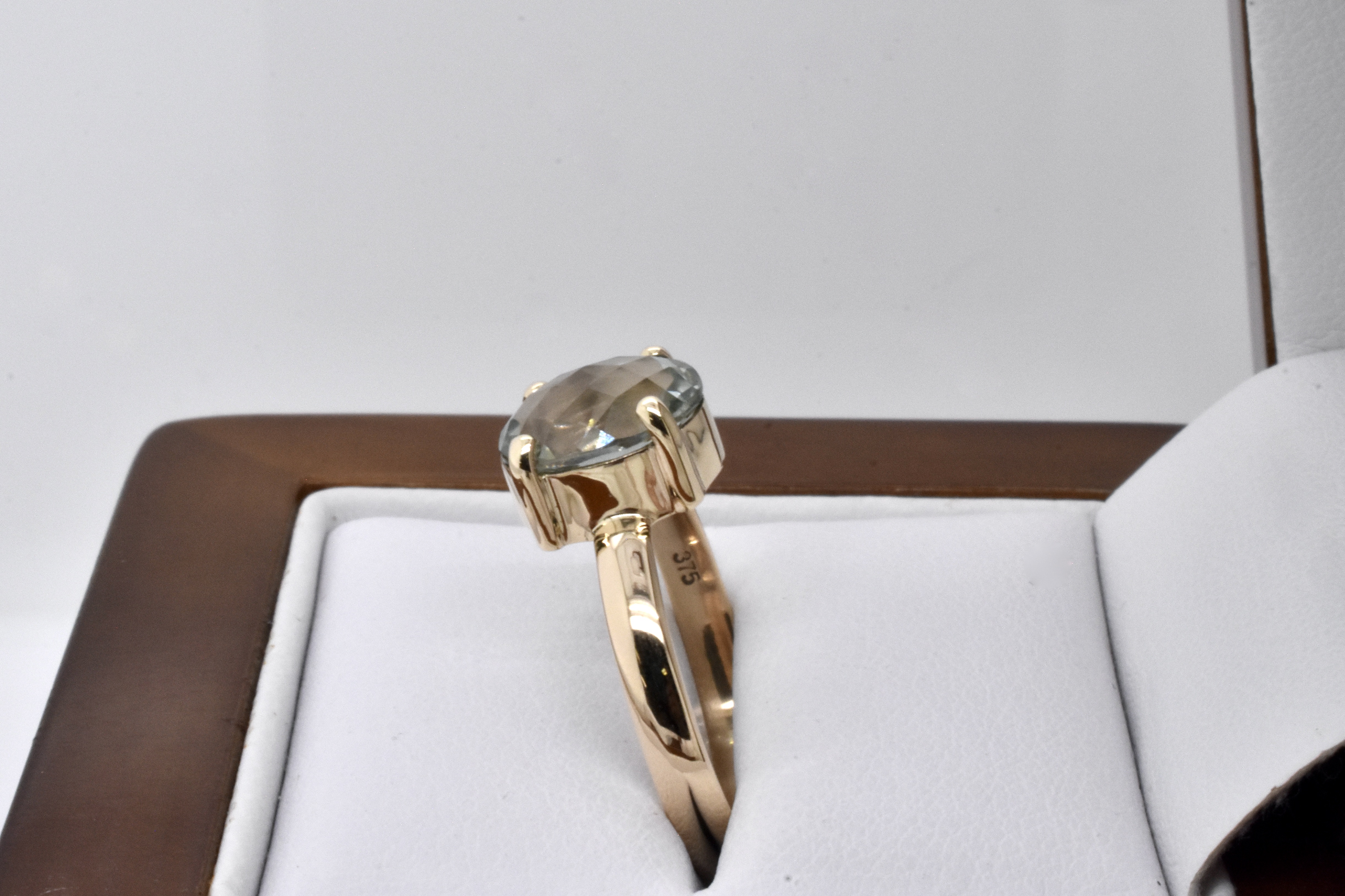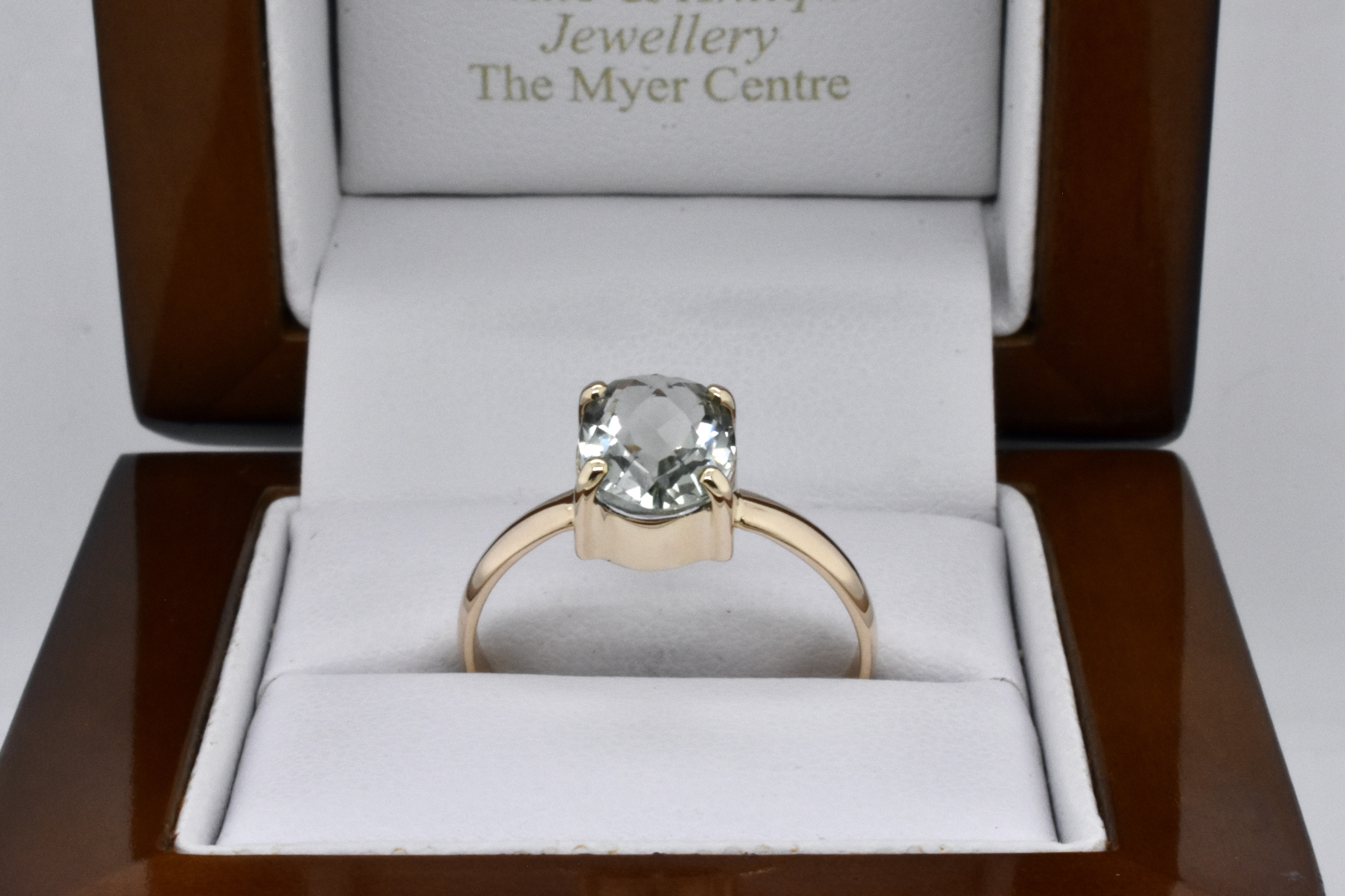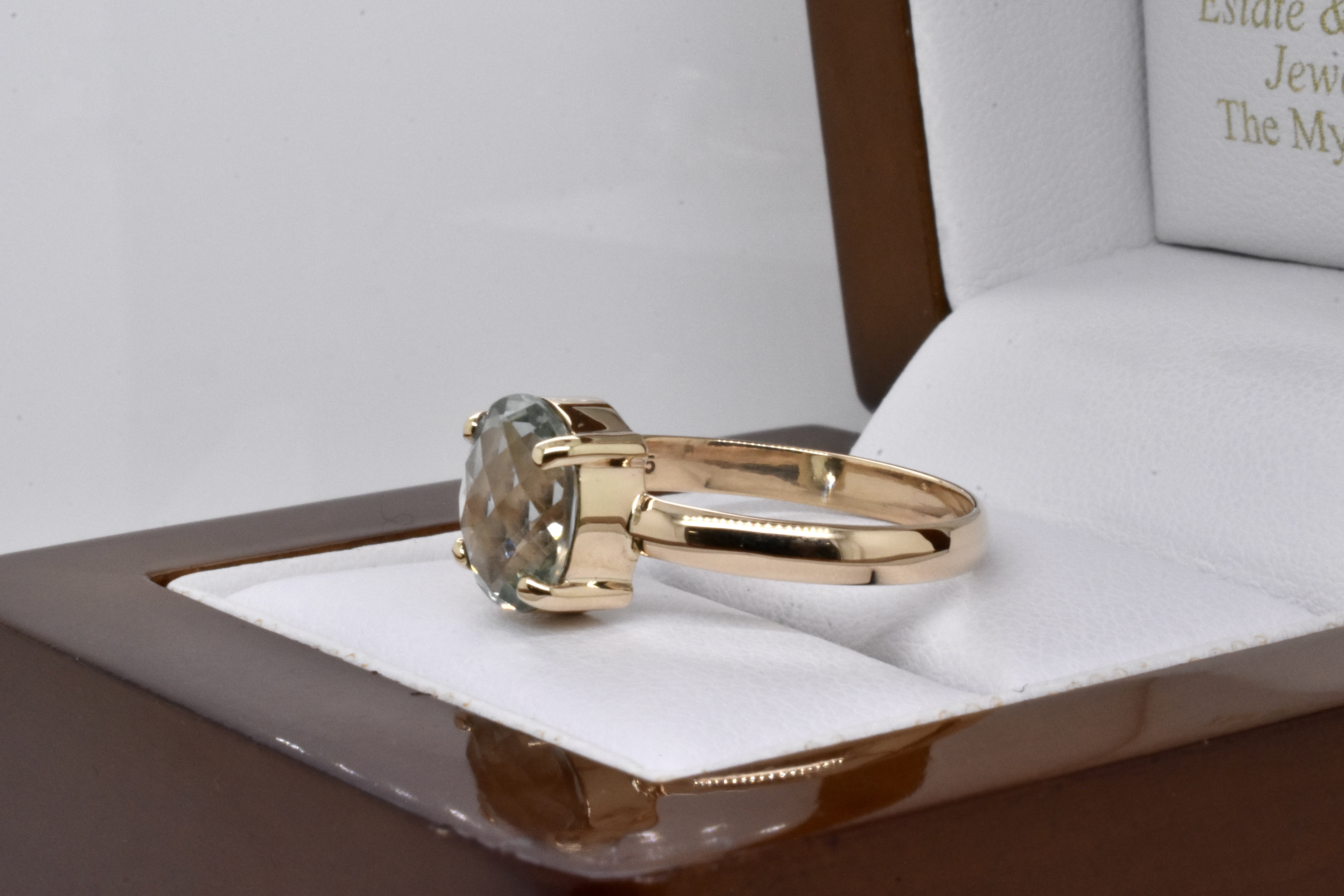 A simple and pretty handmade 9ct yellow gold ring set with an approx. 10 x 8mm oval prasiolite with sparkly chequerboard faceting, 4 claw set with a plain band. Finger size R