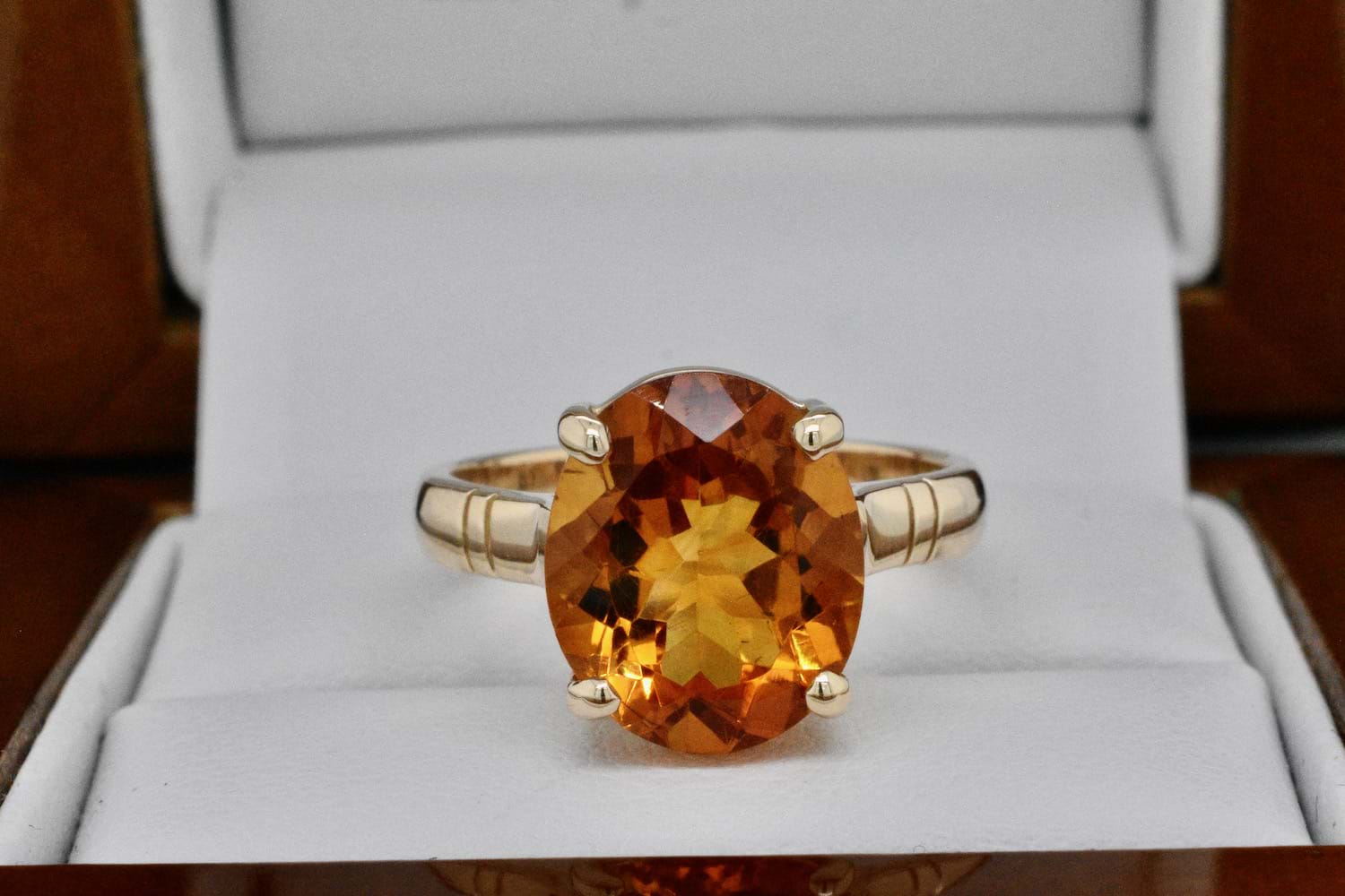 Striking handmade 9ct yellow gold ring featuring an oval citrine measuring approx.13x10mm set into a four claw setting with a flat band profile. Finger size M