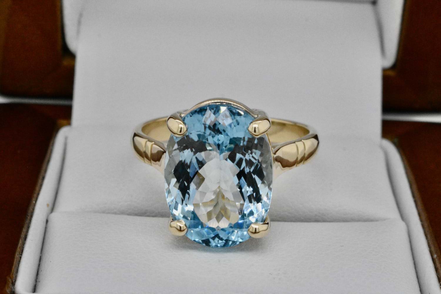 Stunning faceted oval sky blue topaz measuring 16x10mm set into a simple and timeless handmade 9ct yellow gold four claw ring. Finger size Q+