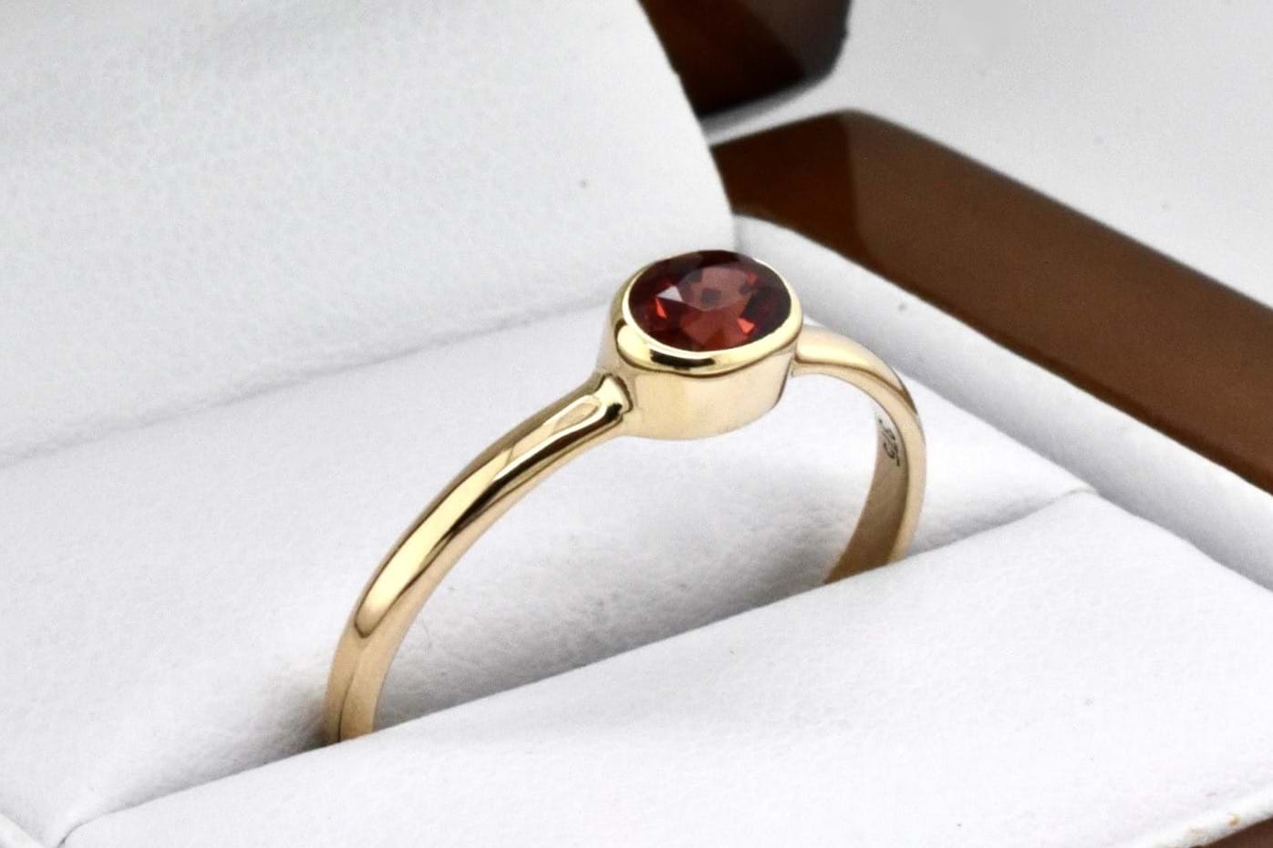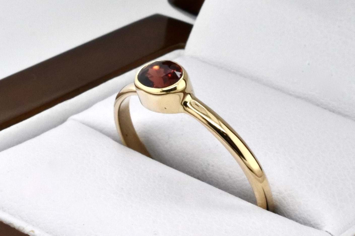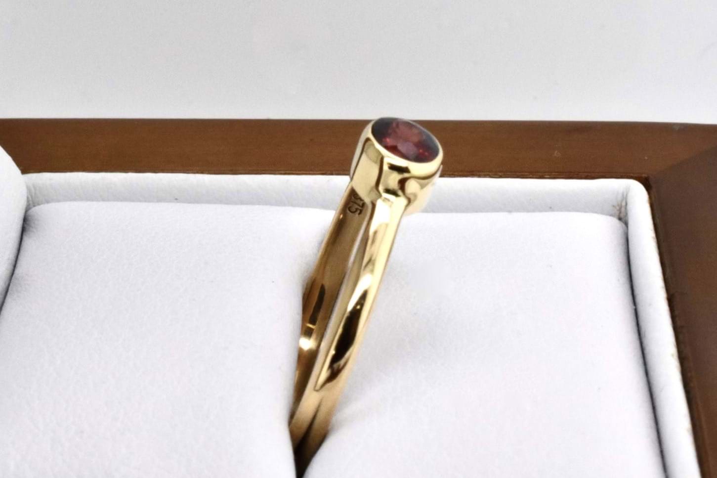 A beautiful handmade 9ct yellow gold ring set with a 6 x 5mm approx. oval red spinel in an east/west bezel setting with a plain band. Finger size Q