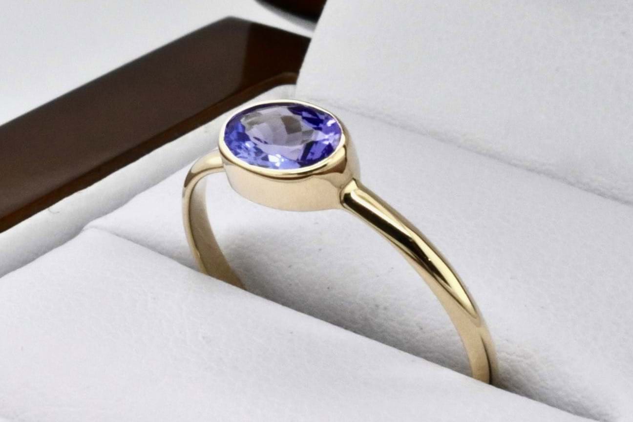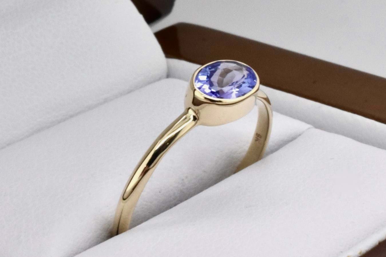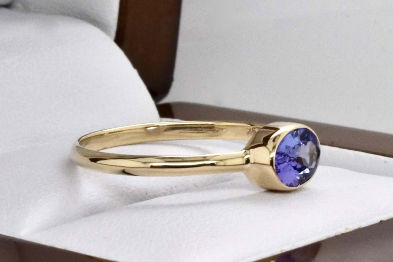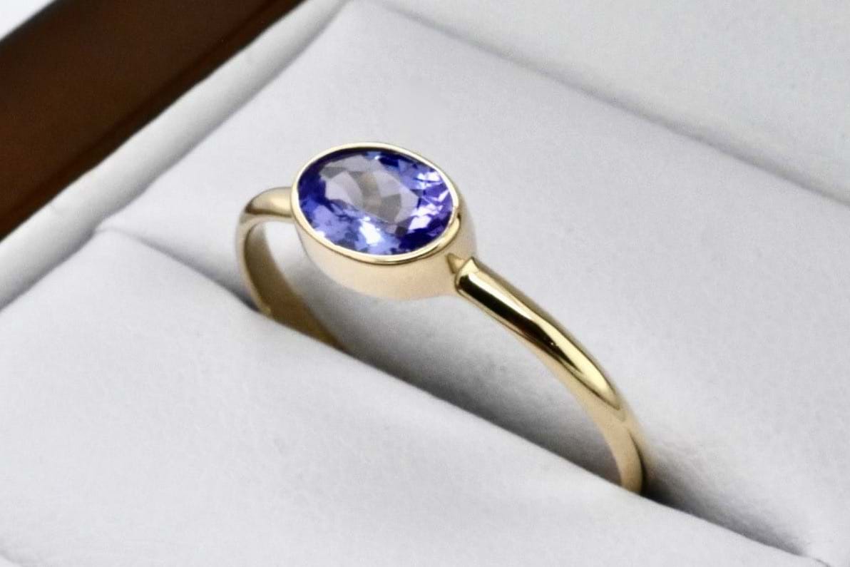 A simple ring, handmade and crafted in 9ct yellow gold set with a 7.5 x 6mm oval tanzanite, bezel set on a plain band. Finger size Q
