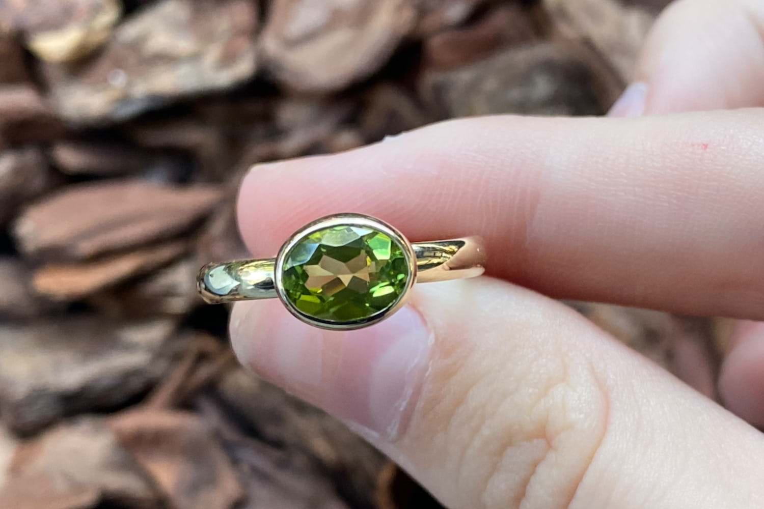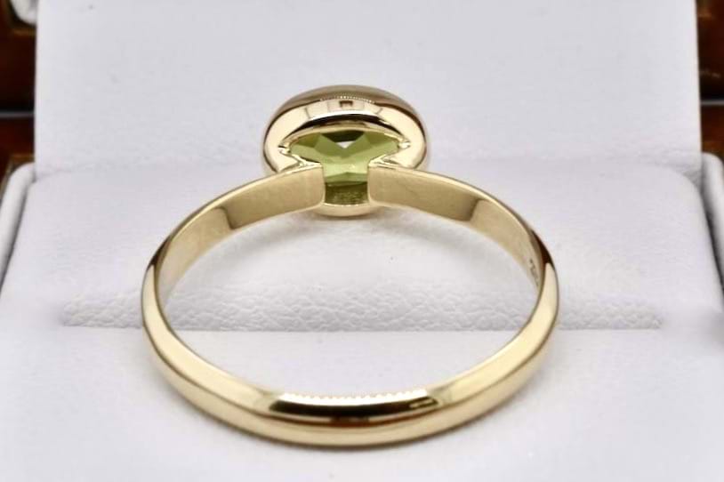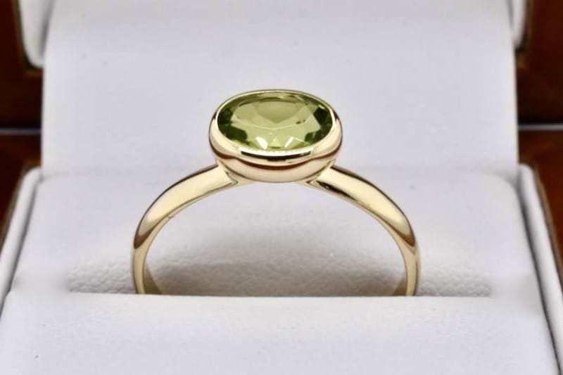 A simple and beautiful handmade ring, crafted in 9ct yellow gold and set with an oval shape peridot measuring approx. 9 x 8mm, east/west in a bezel setting with plain band. Finger size S