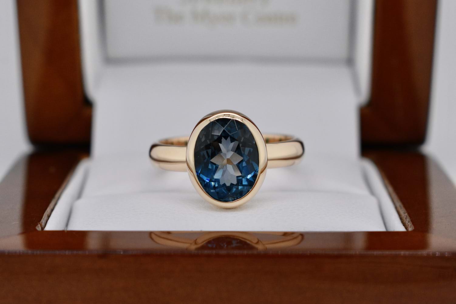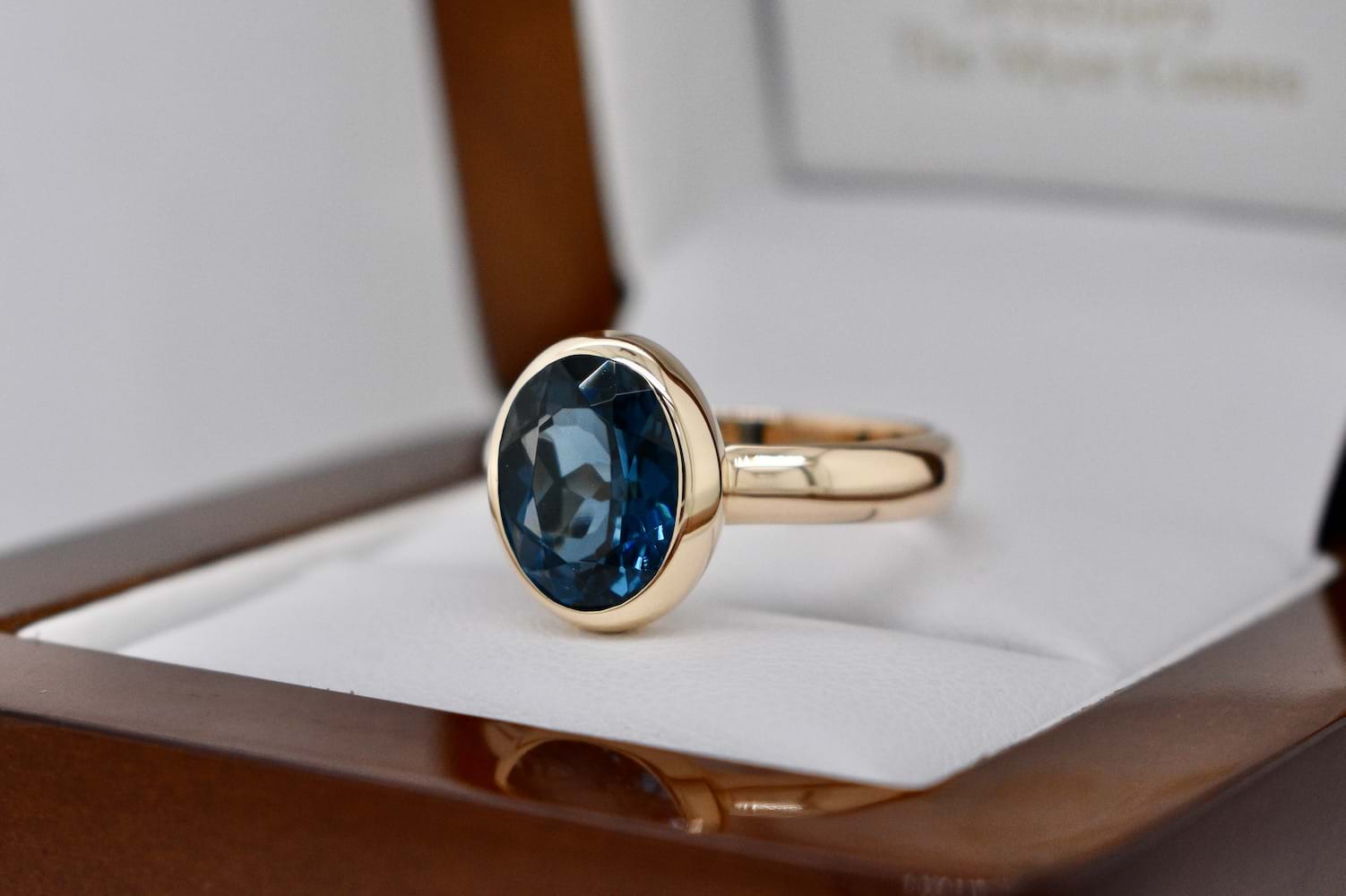 Classic and gorgeous handmade 9ct yellow gold ring with a solid band and a bezel set 3.20ct London blue topaz measuring 10x8mm oval. Finger size O. Independent Valuation Supplied