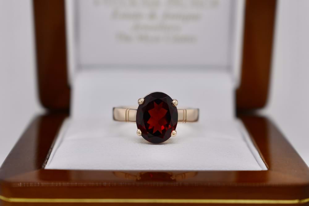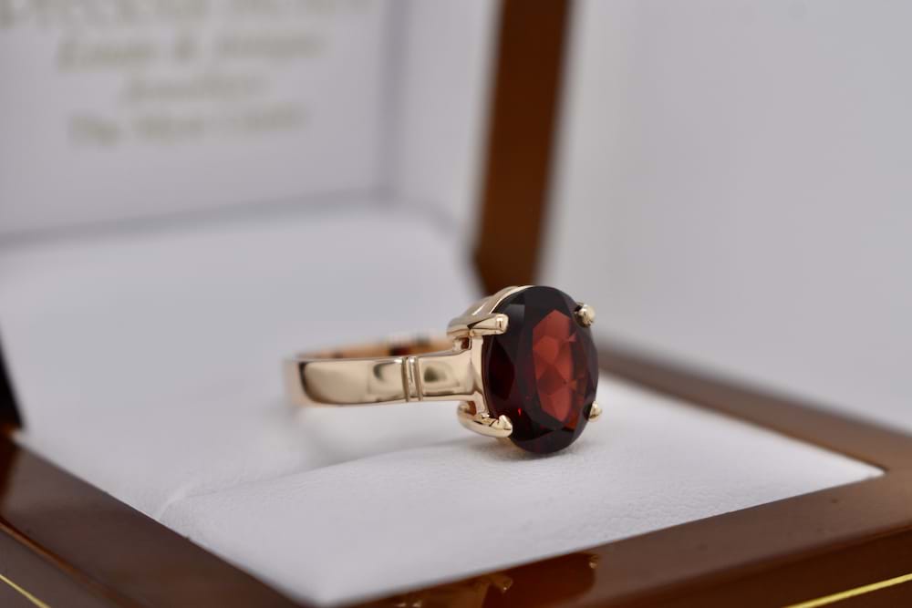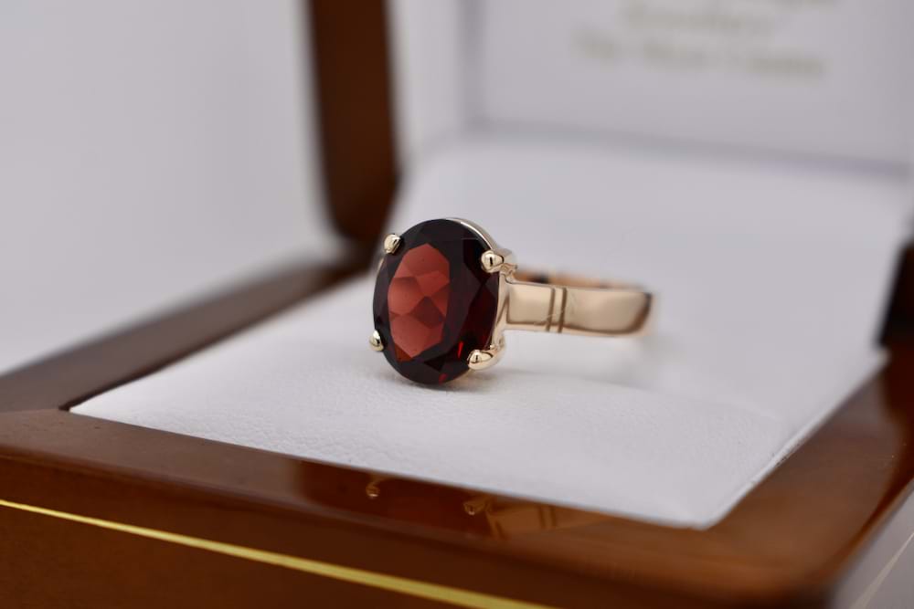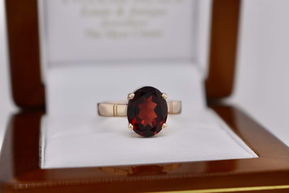 This lovely handmade 9ct yellow gold ring features a faceted oval garnet measuring 11 x 9mm set into 4 claws. Finger size Q