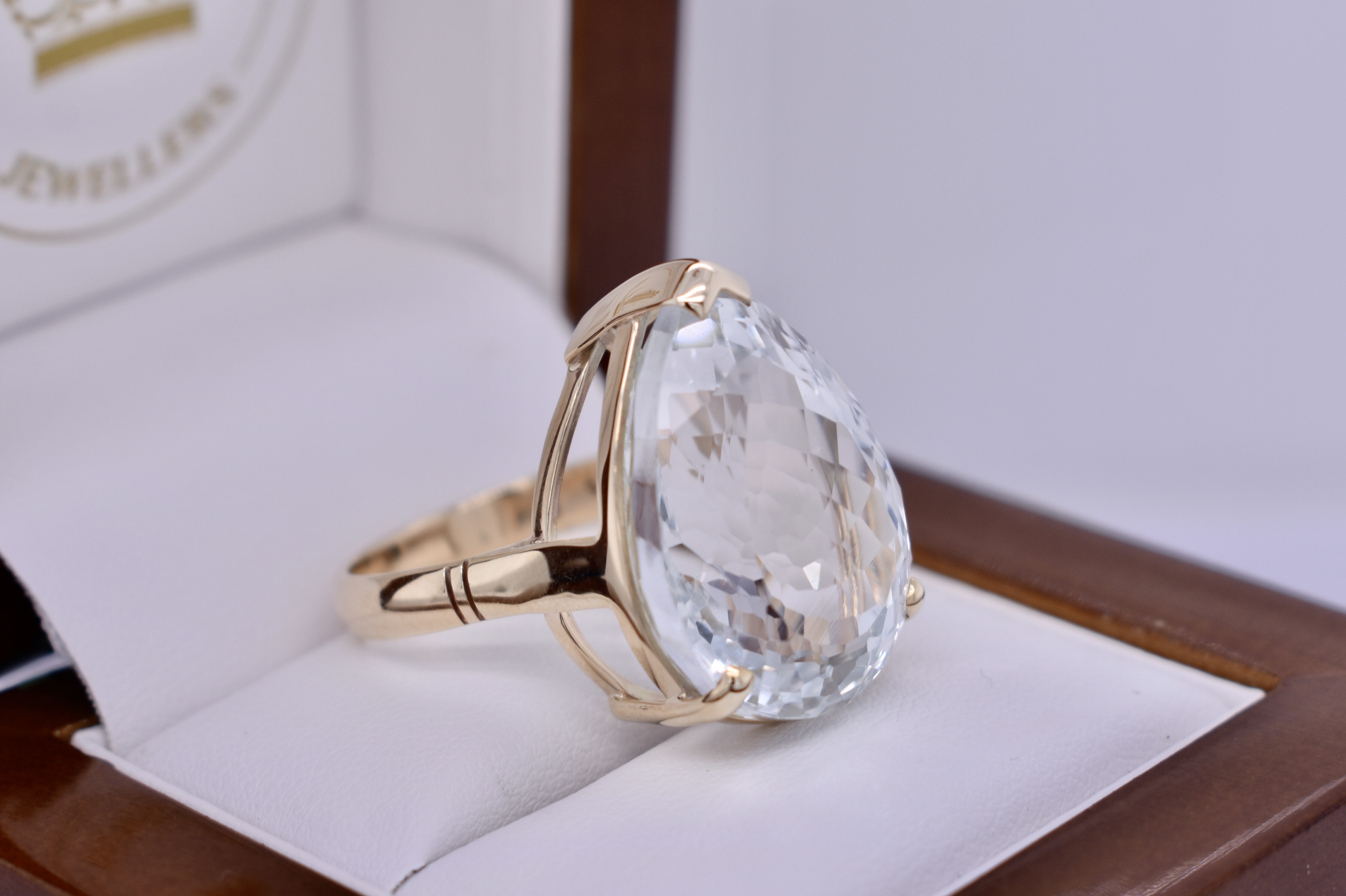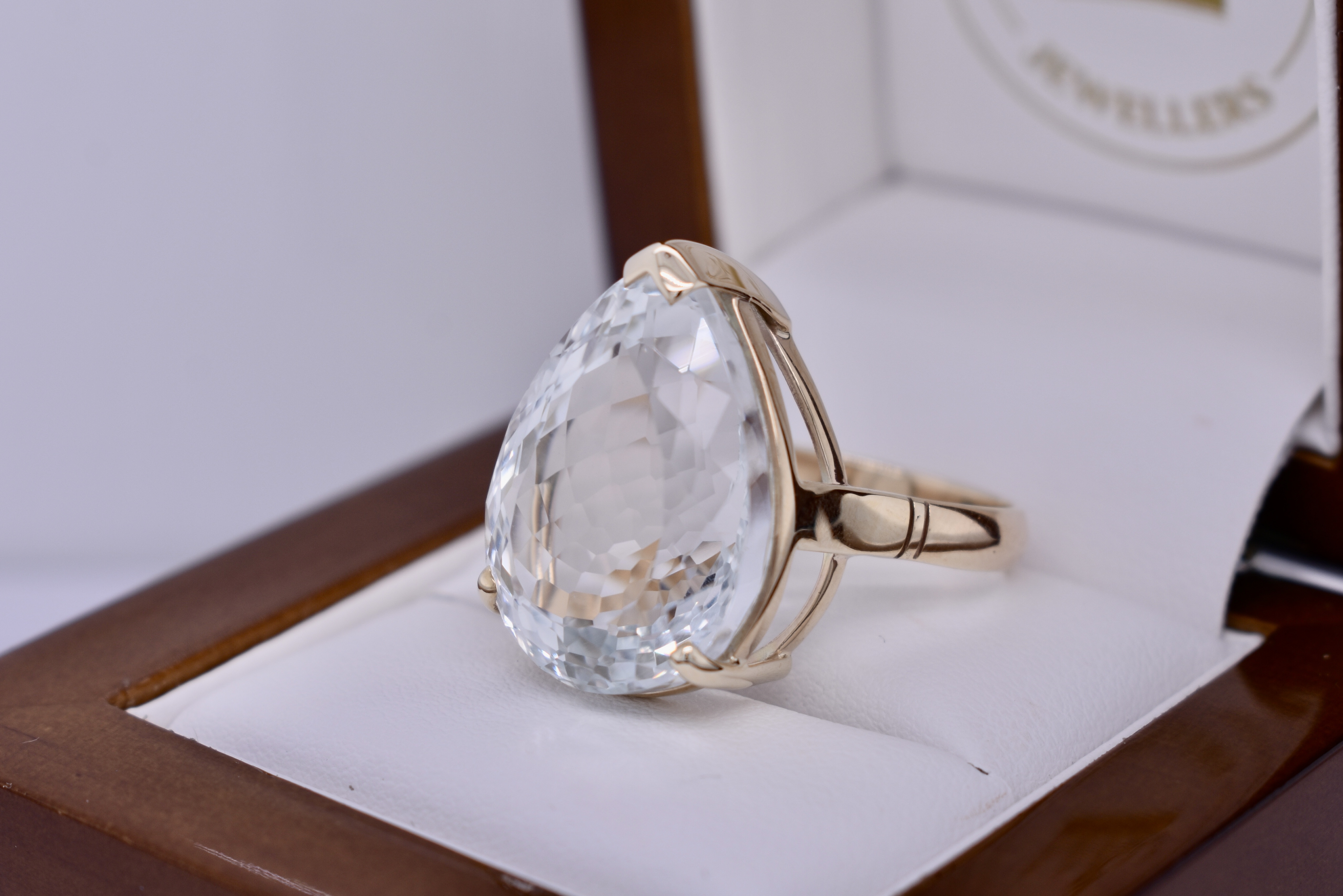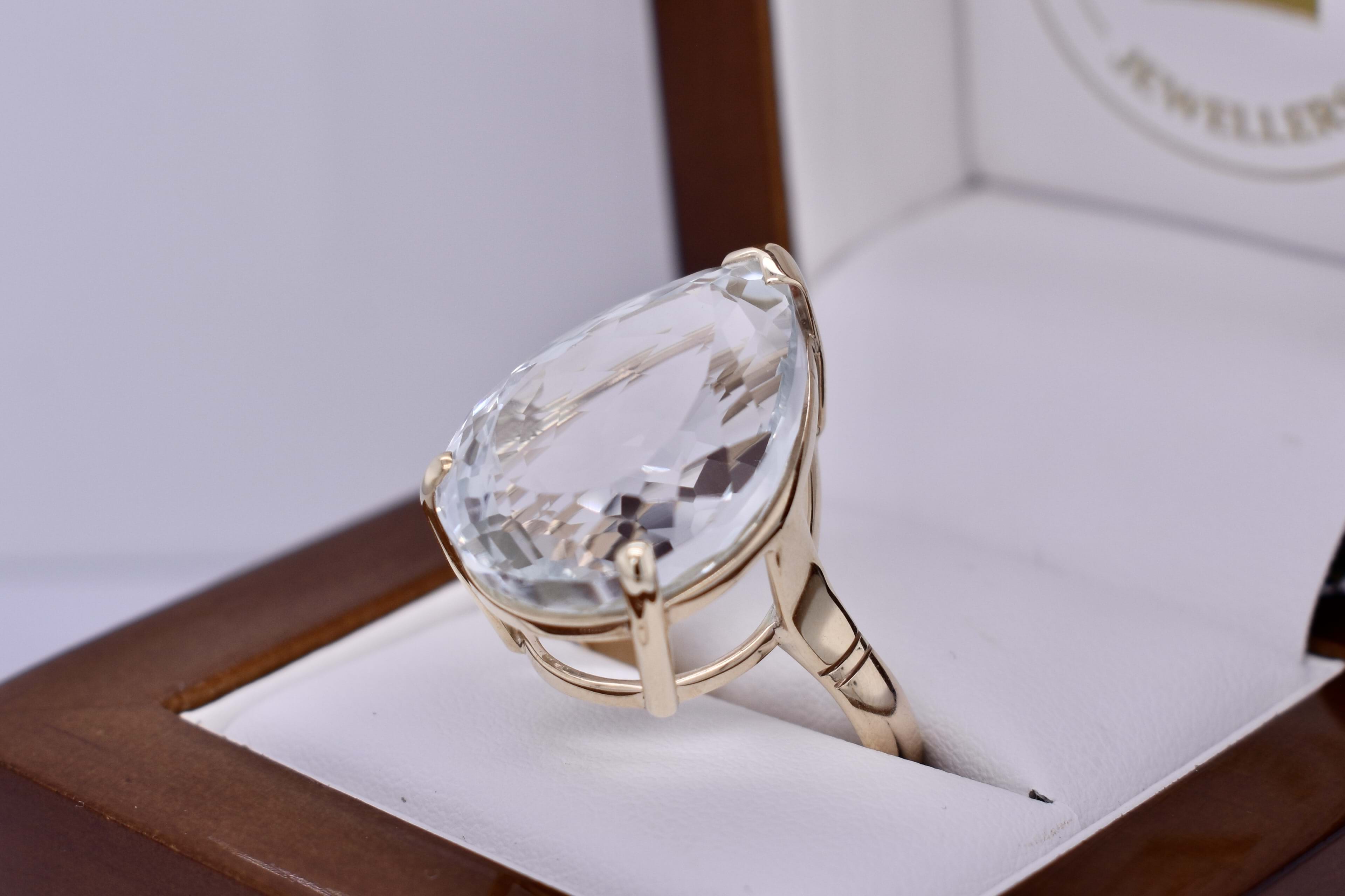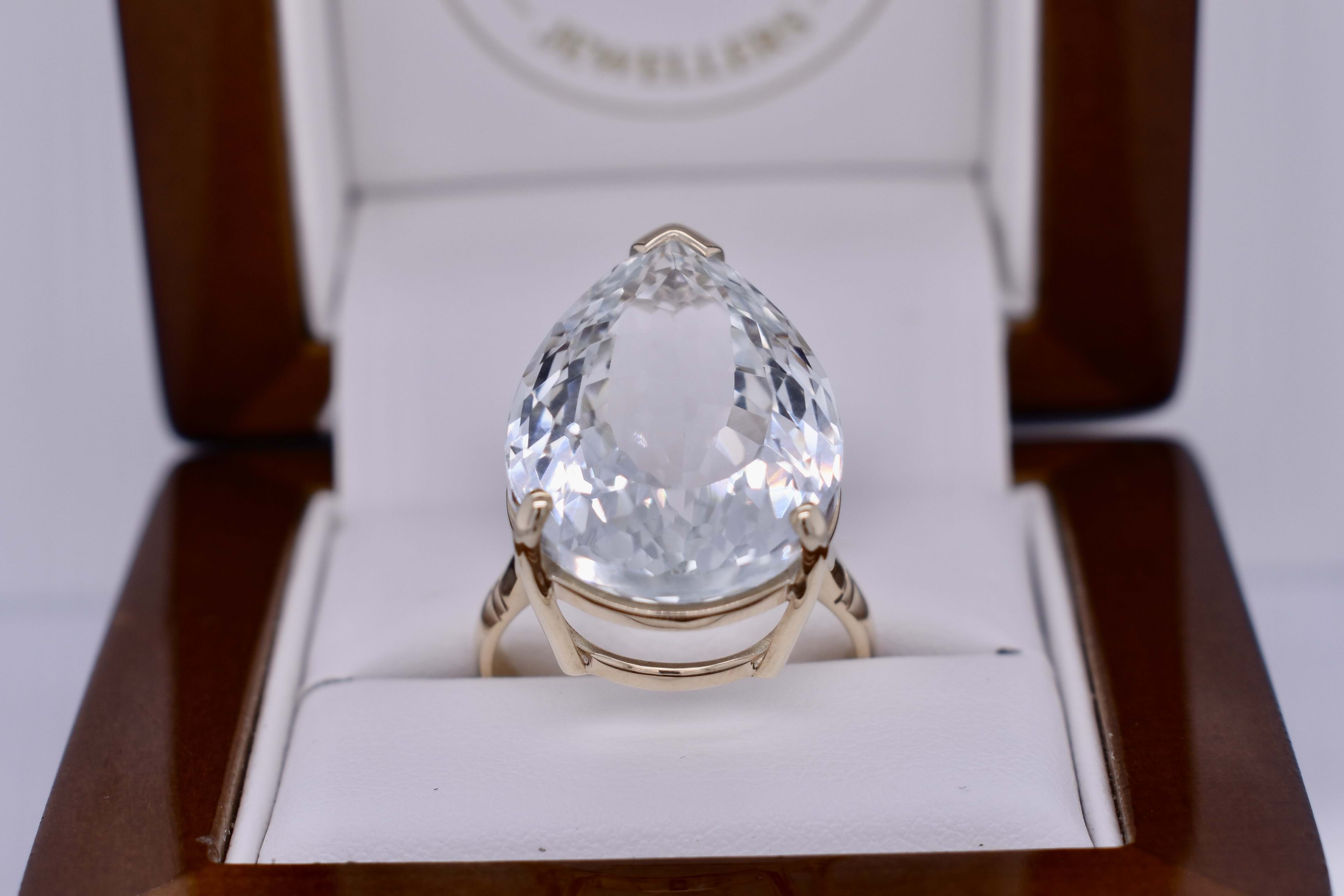 Spectacular large pear shaped ring, featuring a 22.70x18.19mm white topaz, 2 claw and cap set in a handmade 9ct yellow gold setting. Completed with a plain band. Finger size Q+.