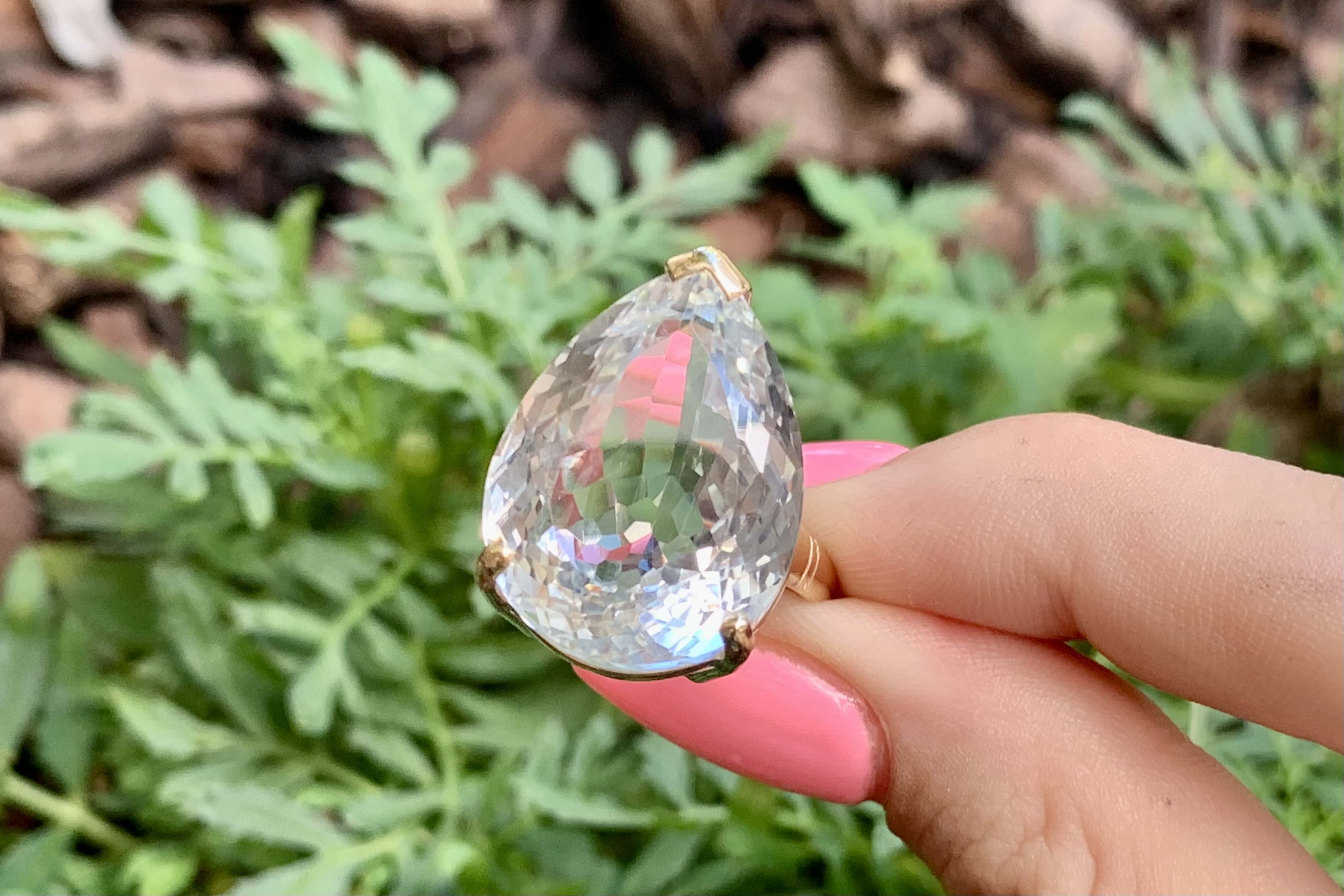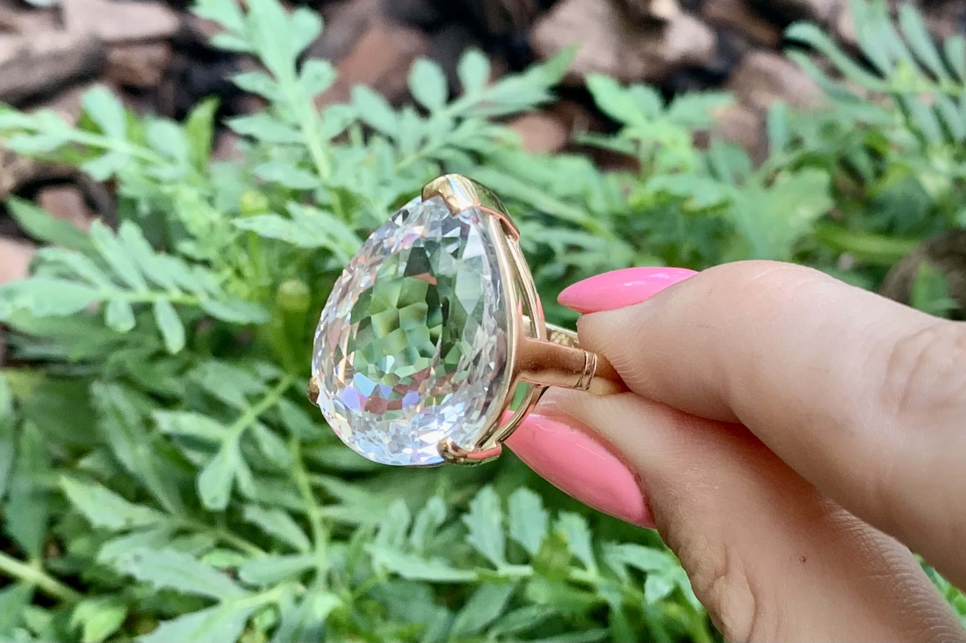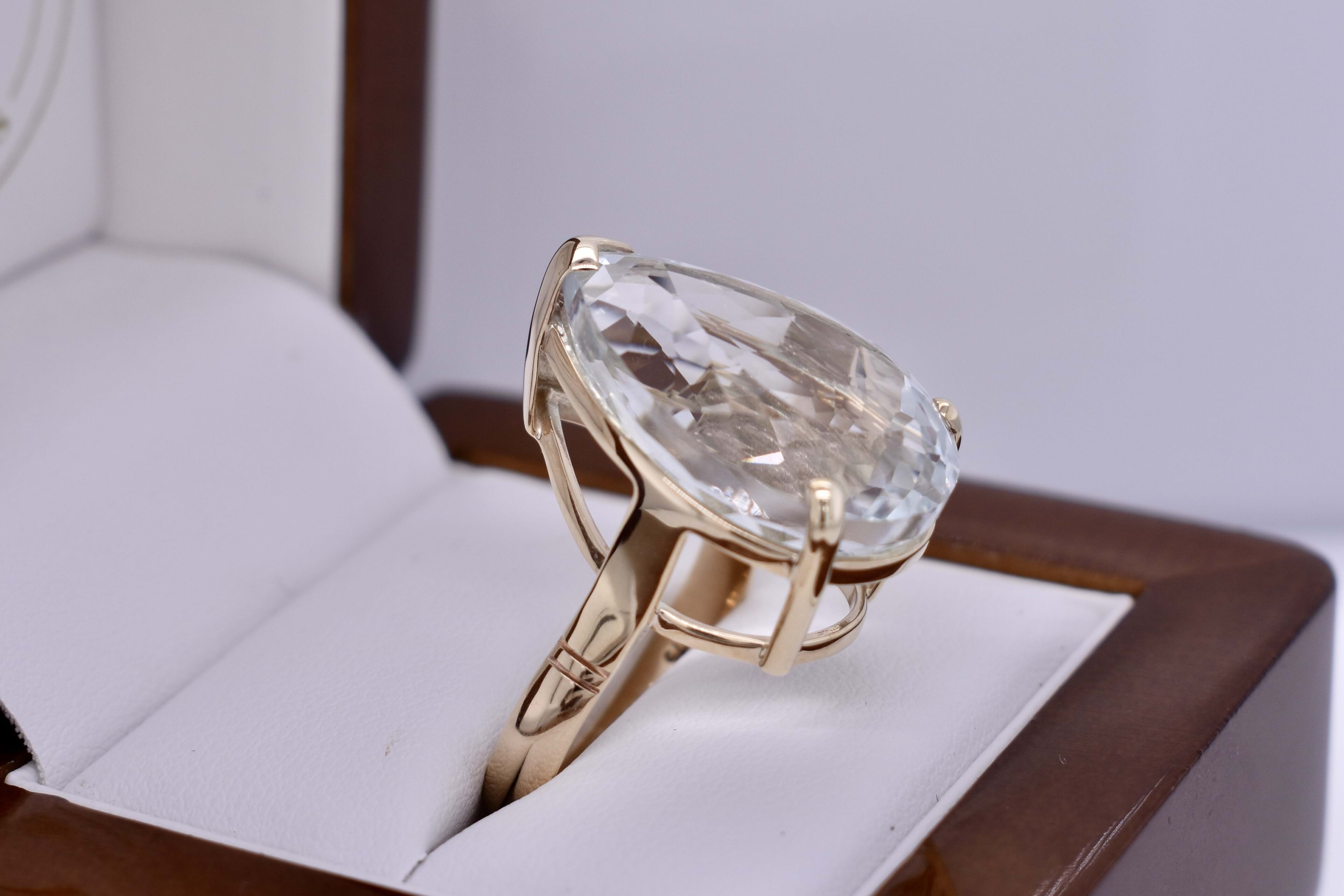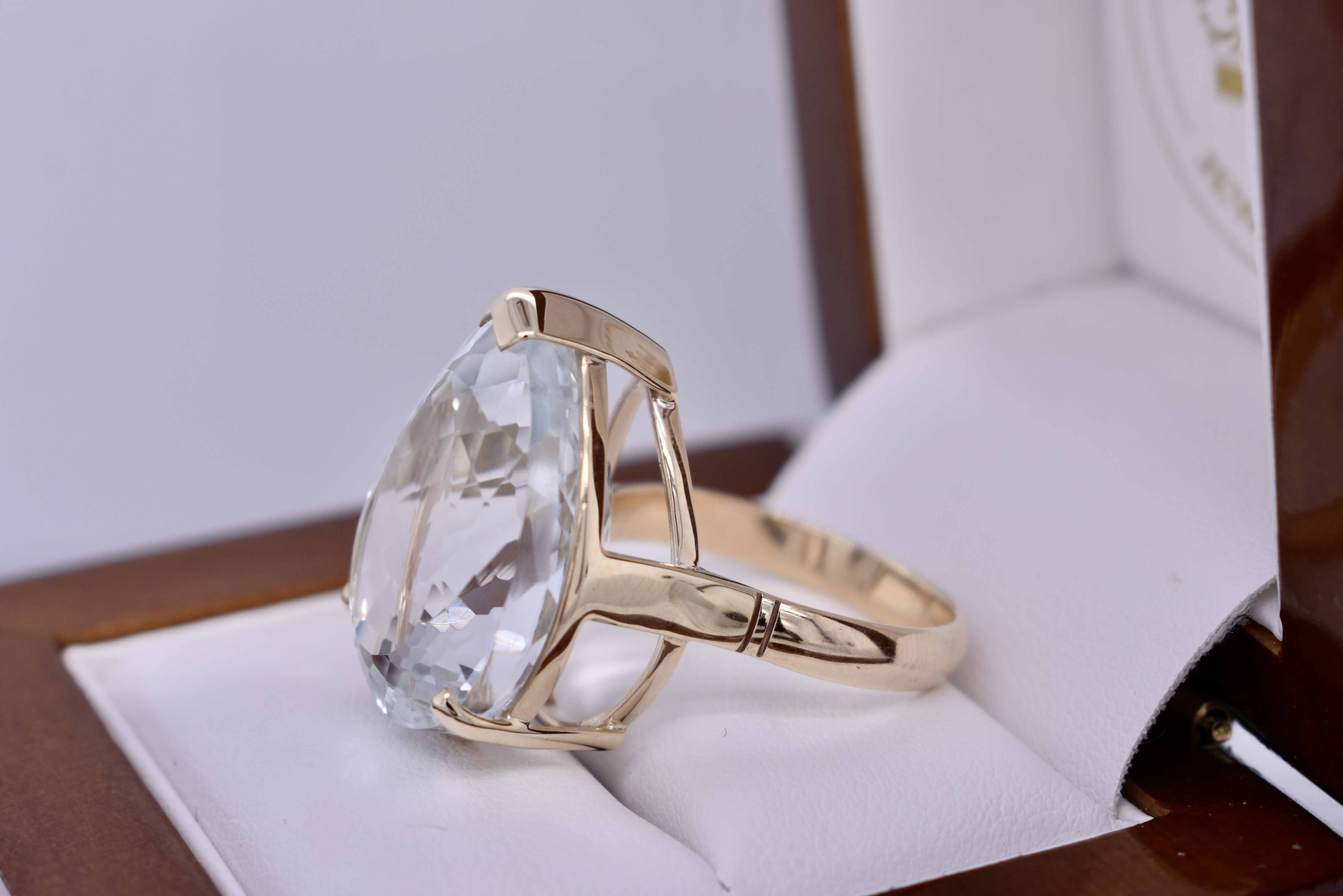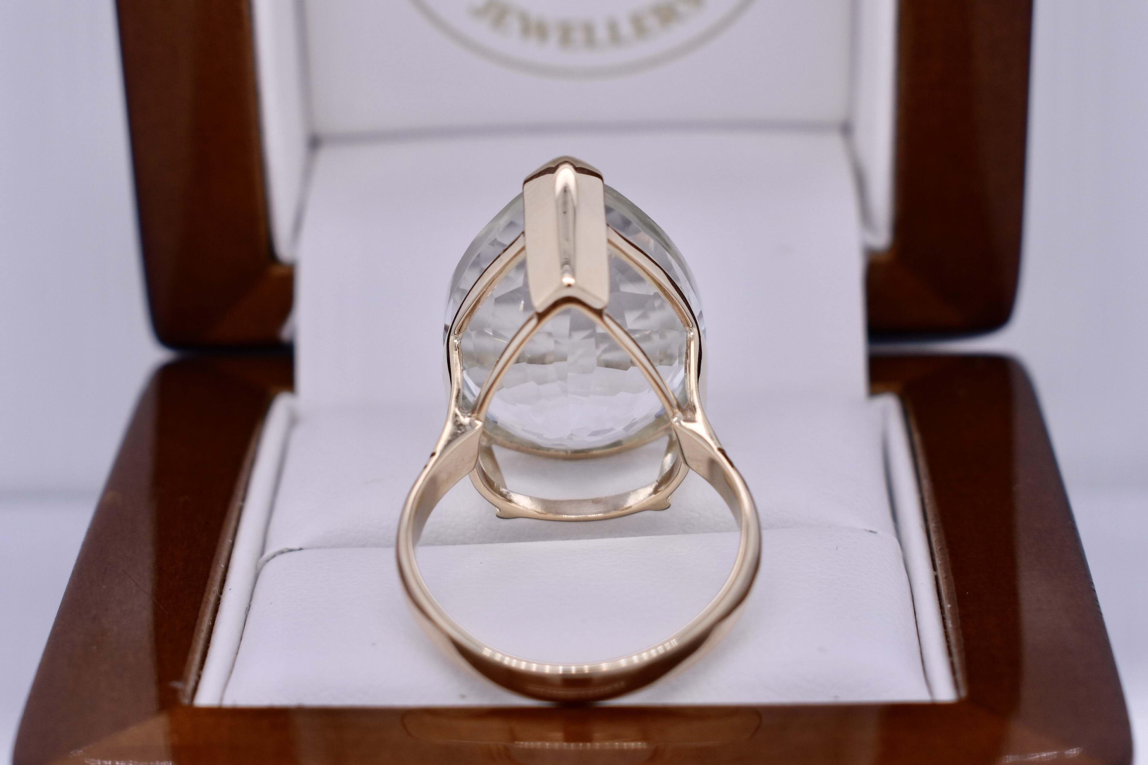 Spectacular large pear shaped ring, featuring a 22.70x18.19mm white topaz, 2 claw and cap set in a handmade 9ct yellow gold setting. Completed with a plain band. Finger size Q+.