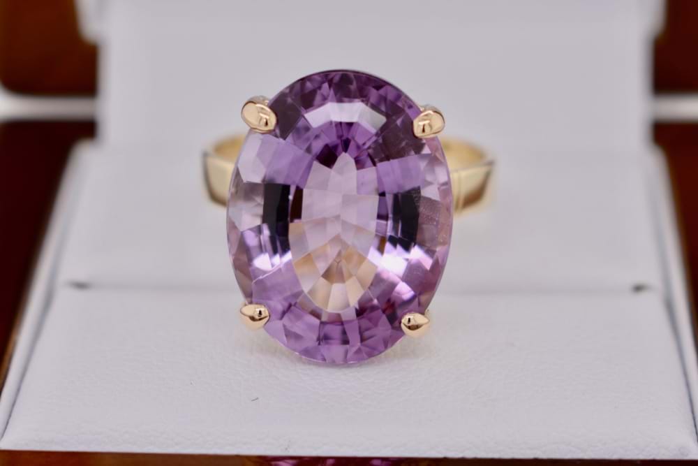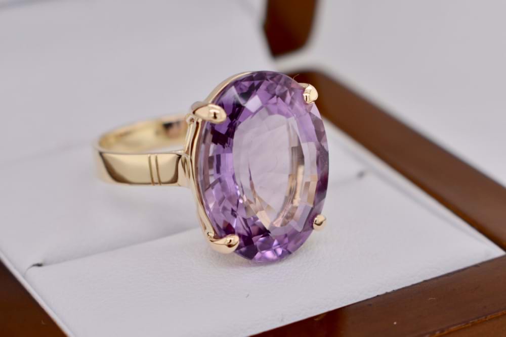 Handcrafted in 9ct yellow gold this spectacular oval amethyst has been beautifully cut to showcase the gemstones blush pink purple colour. Measuring approximately 19x15mm, finger size S