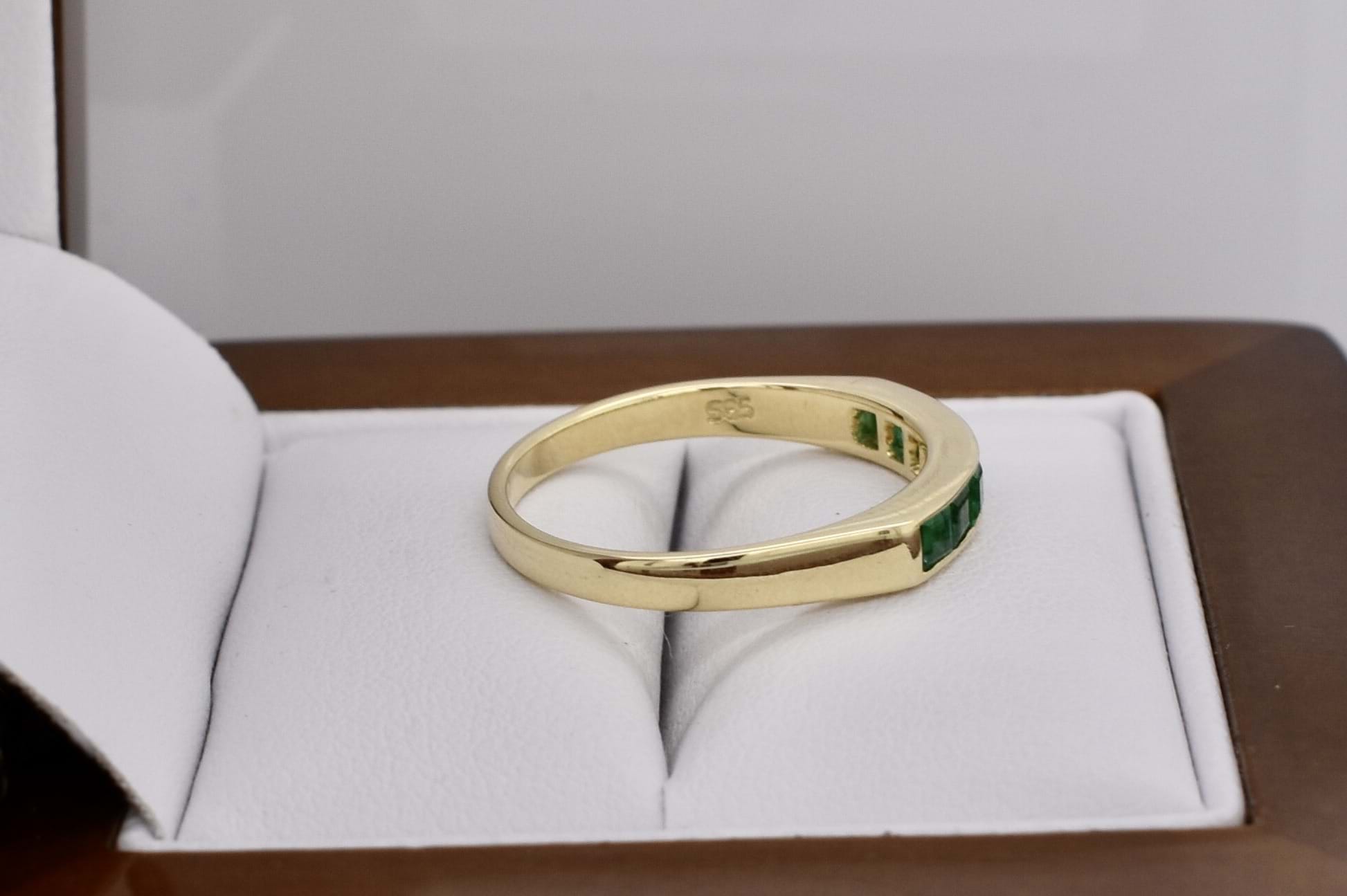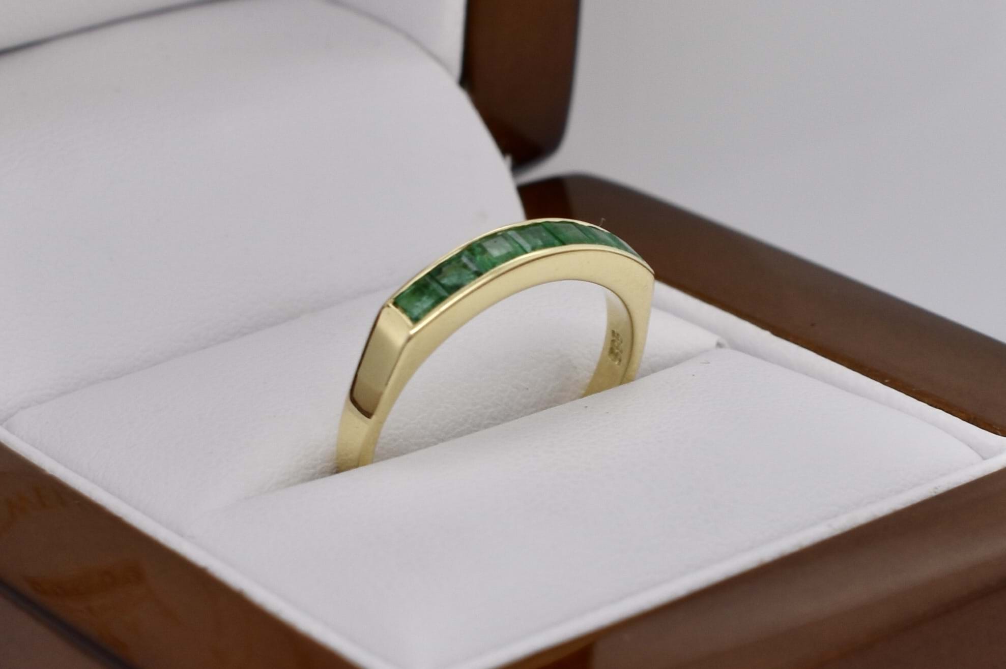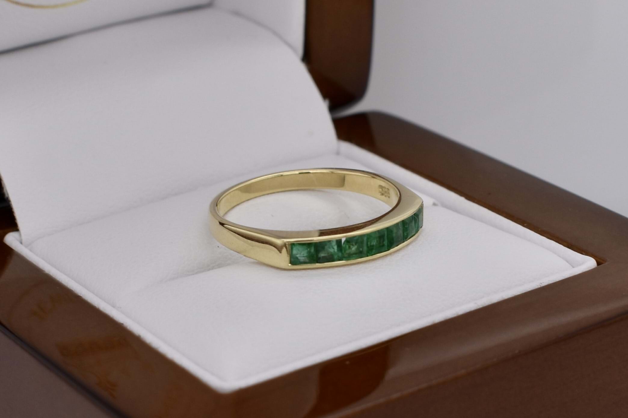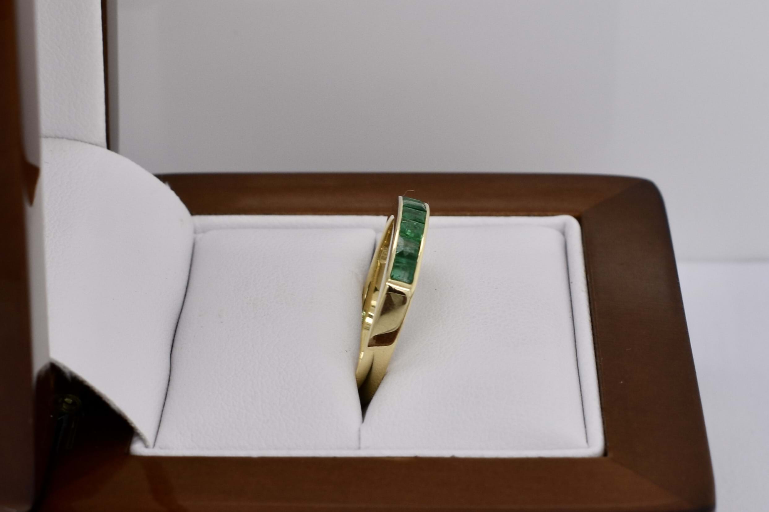 Vintage 14ct yellow gold channel set band featuring seven square cut striking natural emeralds measuring approx 2.7mm each. Finger size N