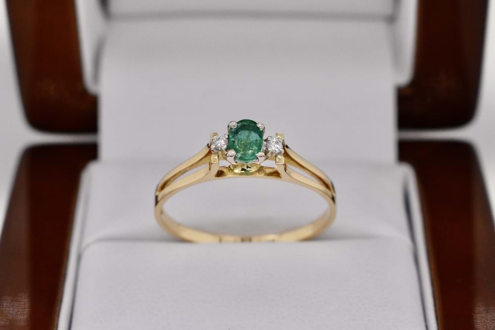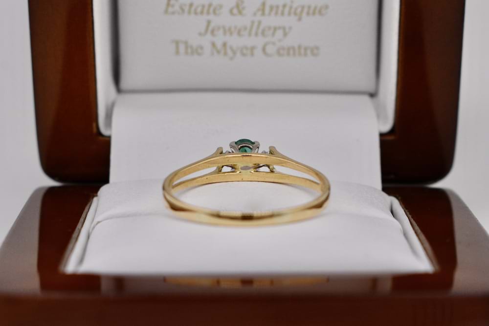 A vintage piece crafted in 18ct yellow and white gold with an oval emerald four claw set in the centre and a small round diamond claw set on each side with a split shoulder. Finger size T.