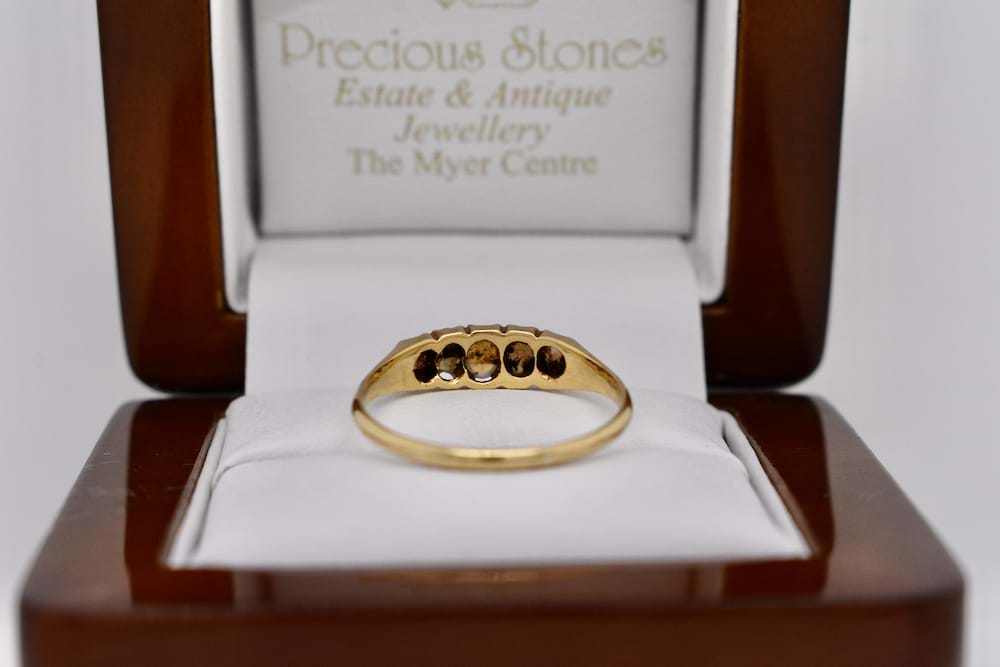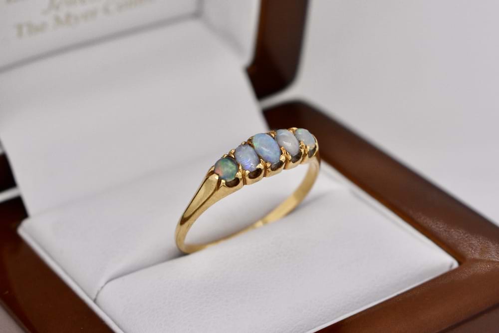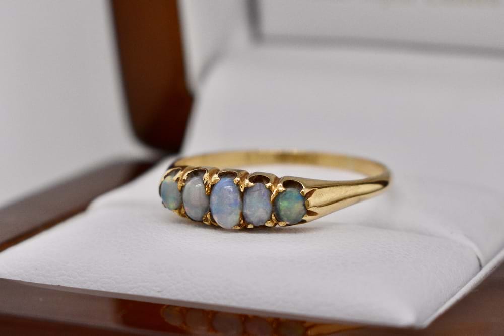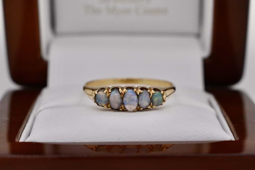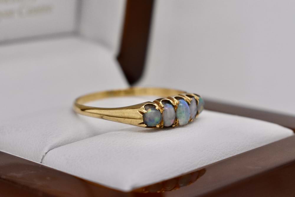 A vintage 9ct yellow gold bridge ring with five solid white opals claw set, finger size S+