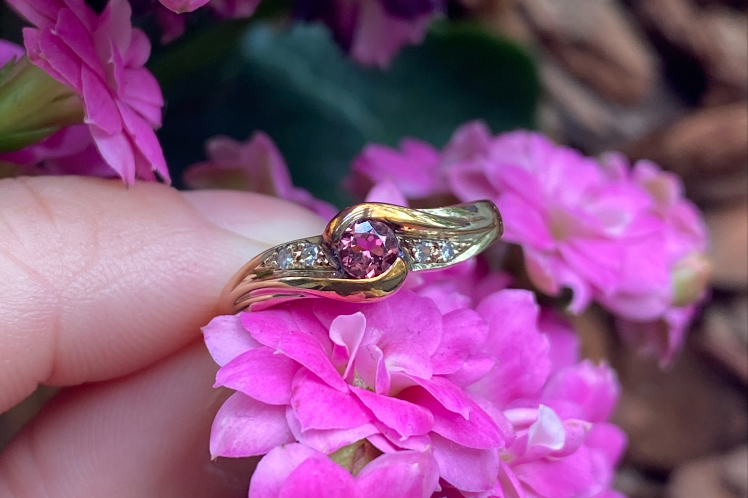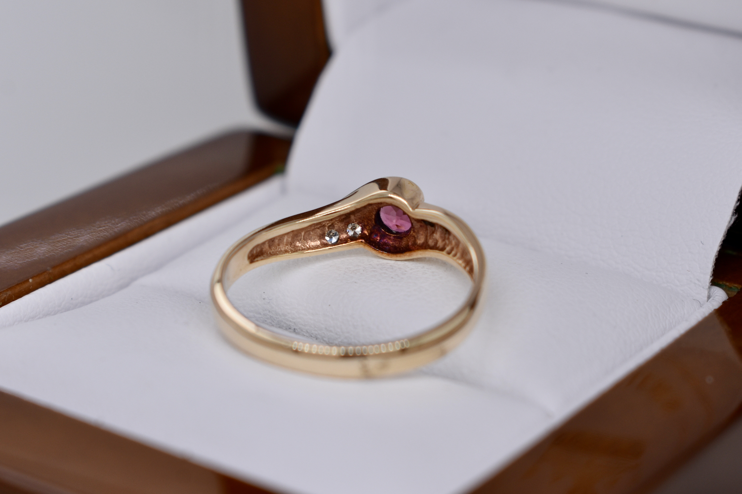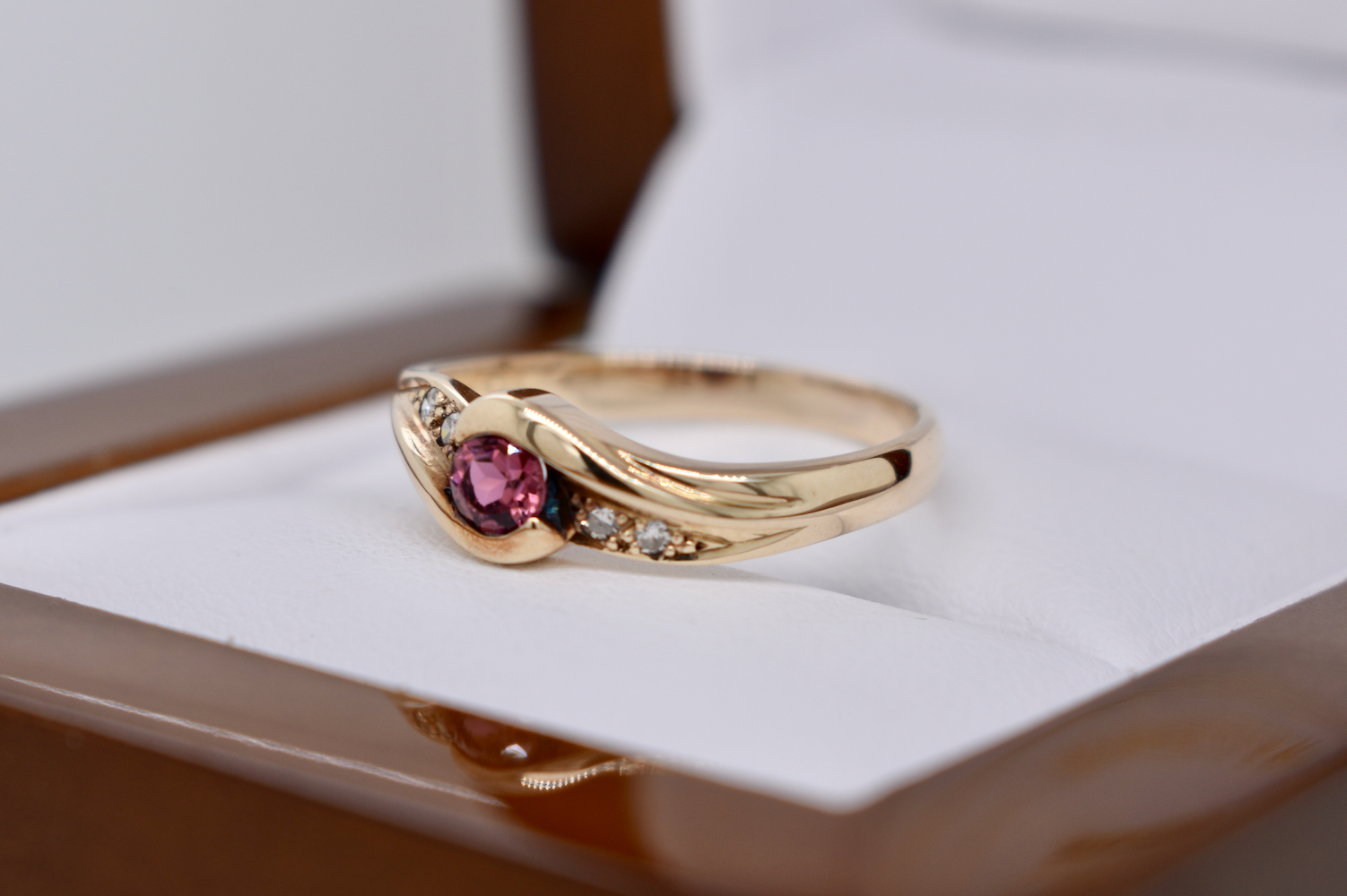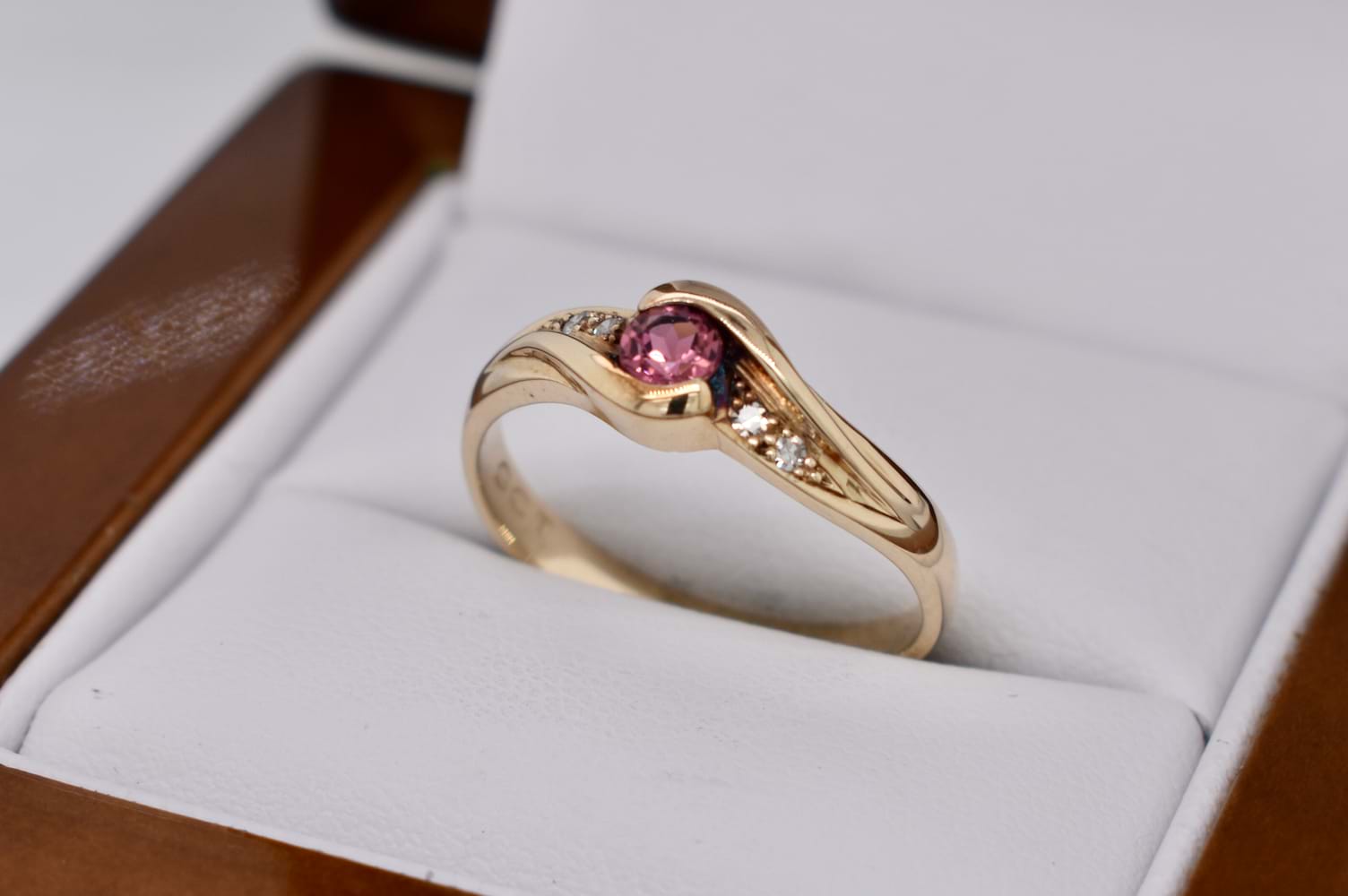 Feminine and elegant, this ring is crafted in 9ct yellow gold and set with a centre round pink tourmaline in a semi floating style bezel, with swirl style shoulders set with a total of four small round brilliant cut diamonds and finished with a plain band. Finger size N